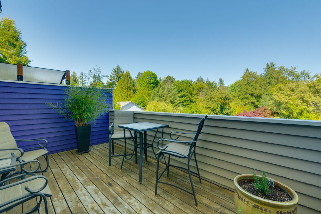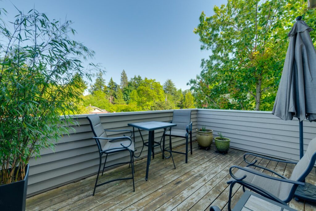 The main level layout is ideal with a kitchen, family room and a nice half bath on the main level. You’ll love all the kitchen has to offer: stainless steel appliances, ample countertops, a gas range, plenty of storage and a breakfast bar. Just off the kitchen is a large balcony deck overlooking the treetops. A lovely spot to sip your morning coffee or relax in the evening with friends.