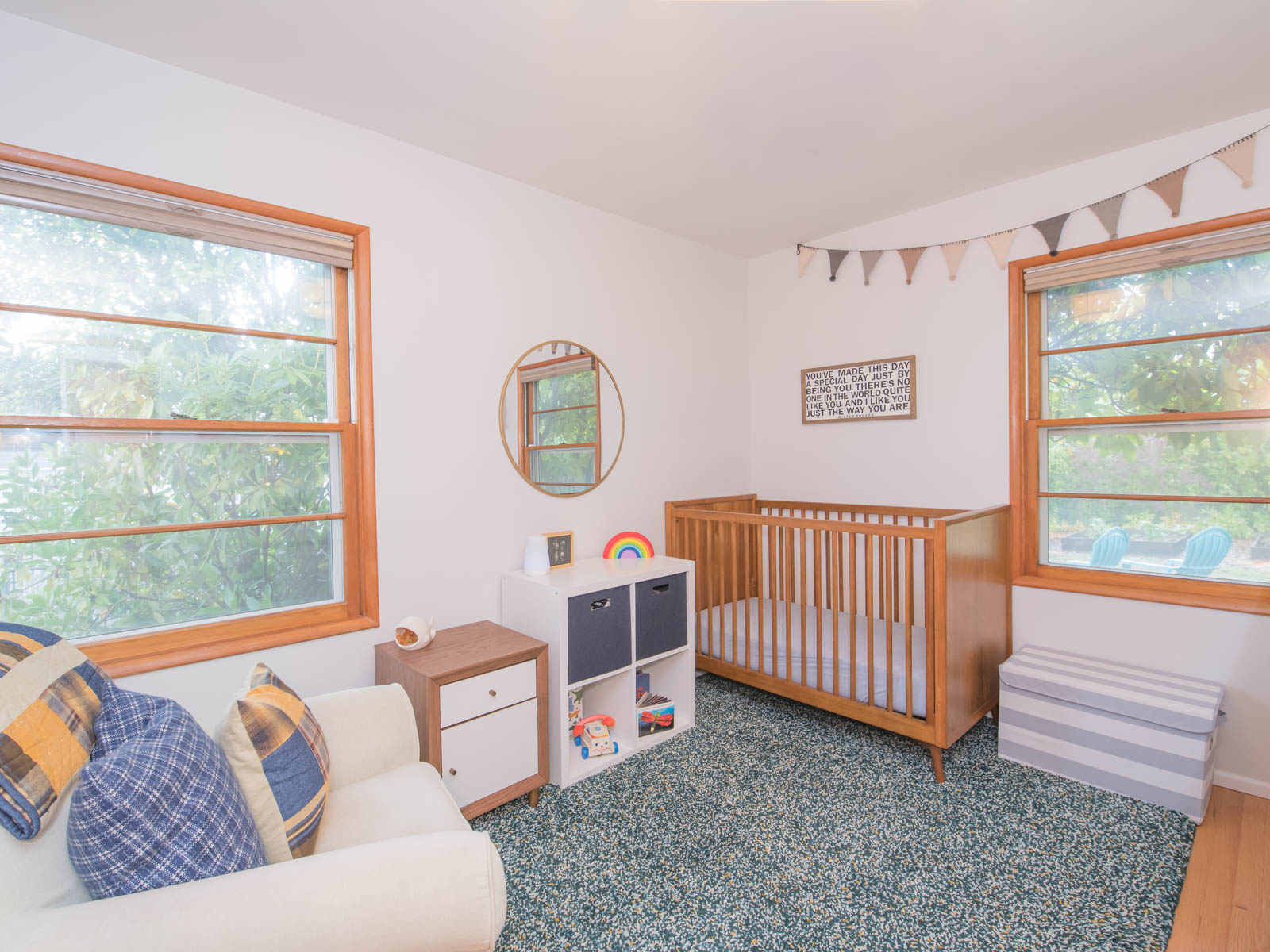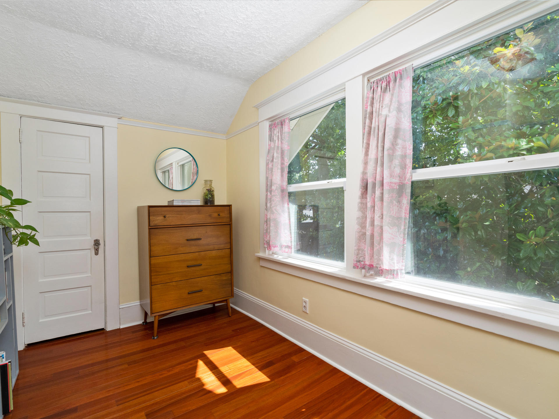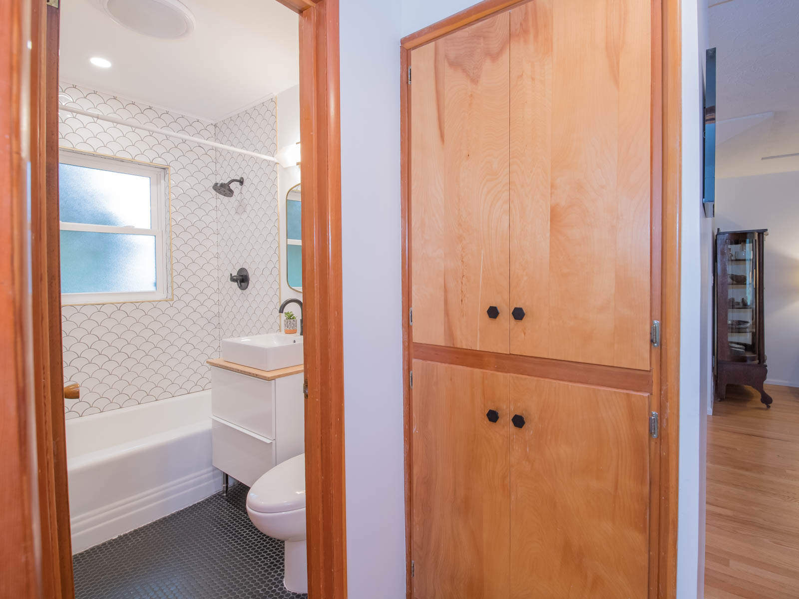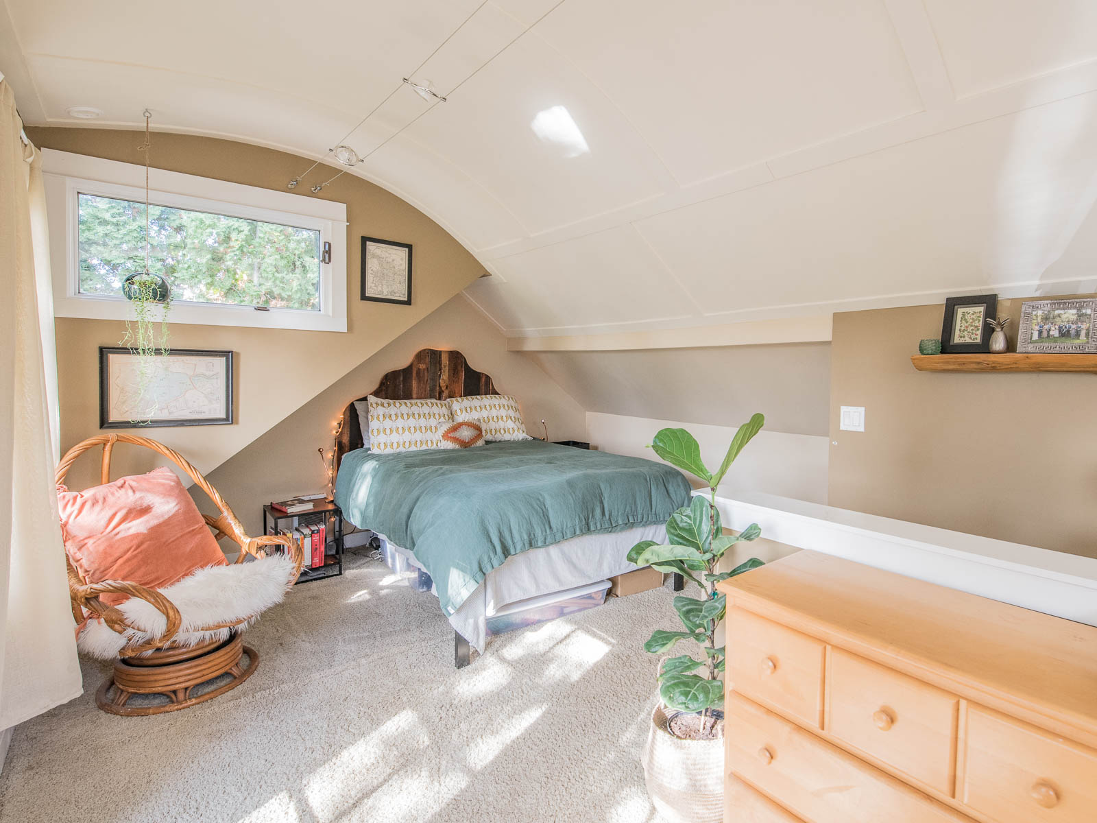 The bedrooms are upstairs. Sweet as honey fir floors, large closets + storage. The bathroom has a clawfoot tub, wall sconce lighting and vintage perfect cabinetry.