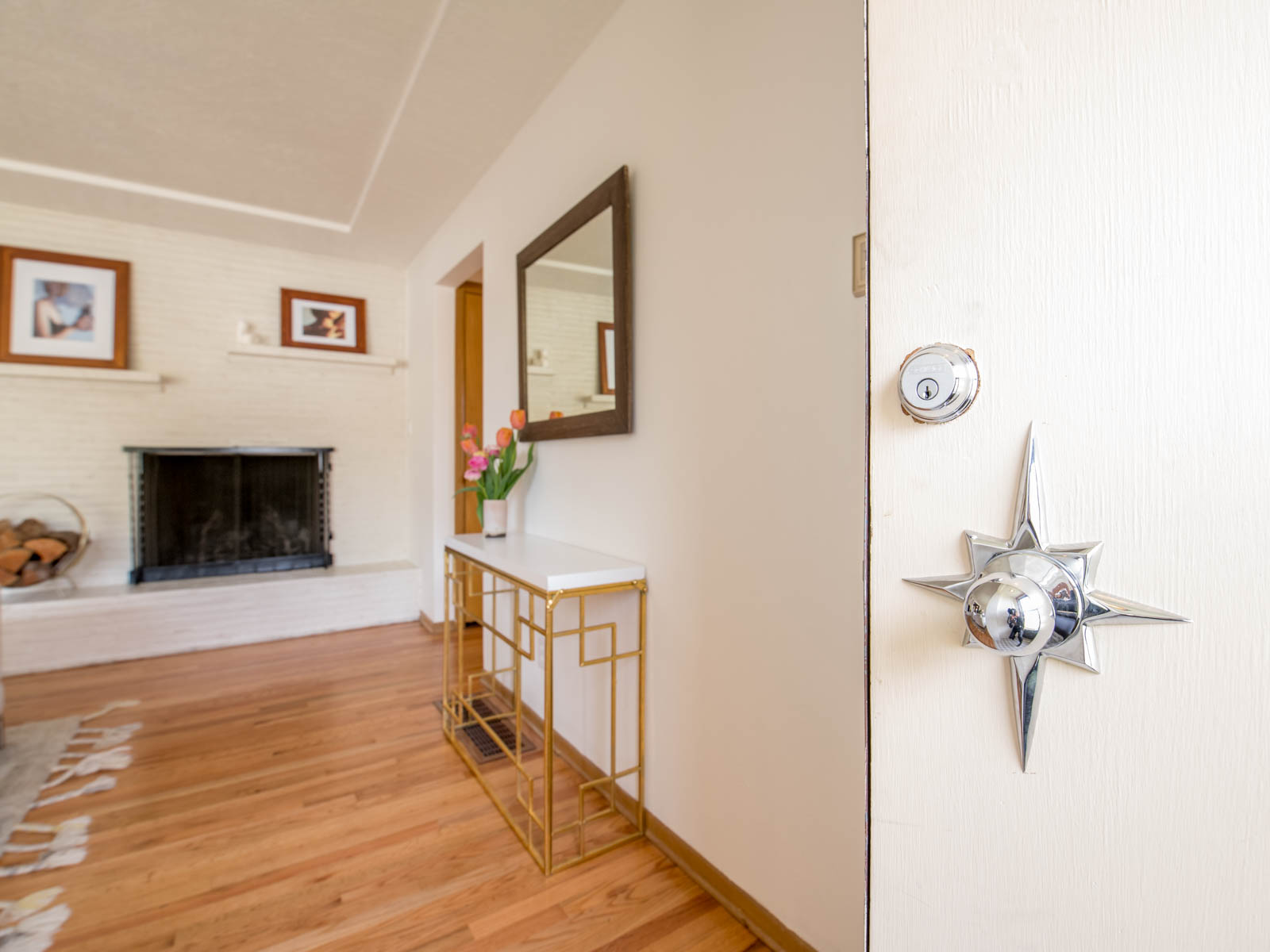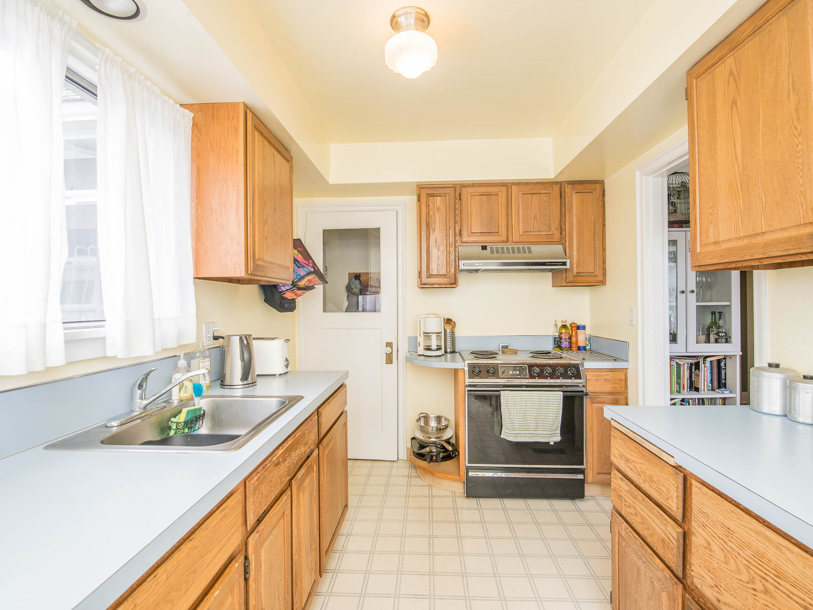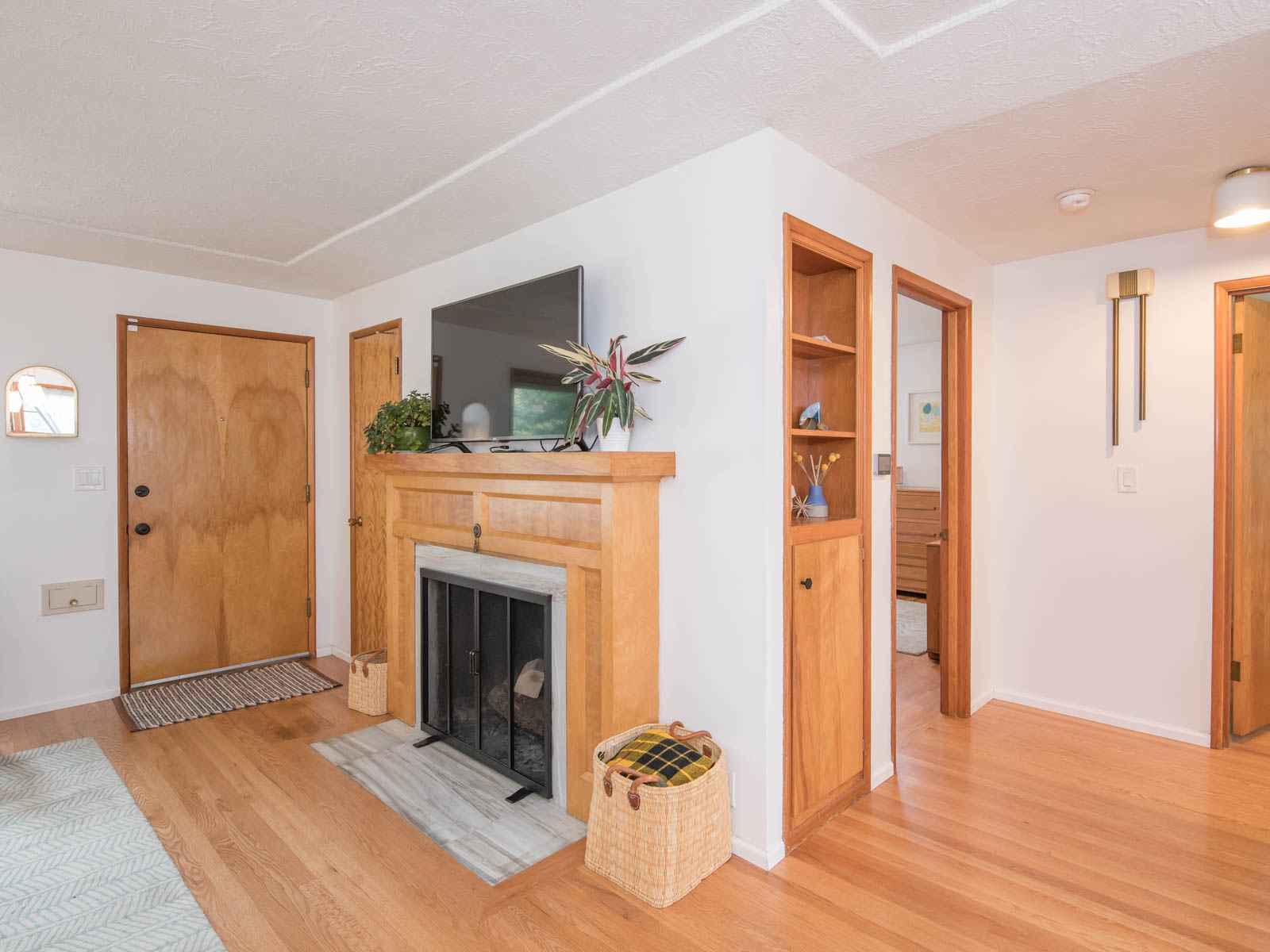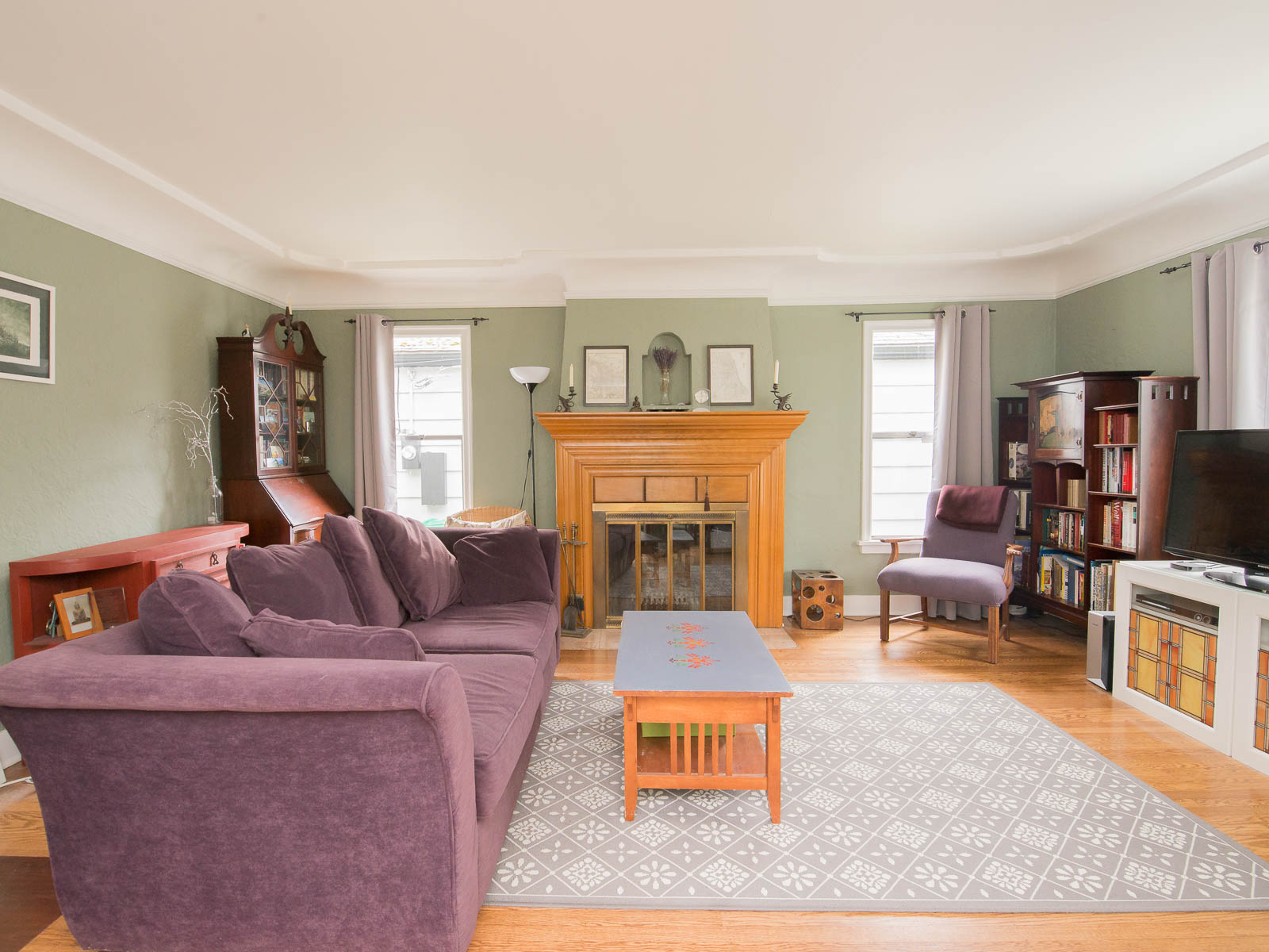 Set up from the street, with a well-designed floor plan, this beauty features a true foyer for arriving, while maximizing square footage. The living room has high ceilings, a gas fireplace, walnut floors. Formal dining has period built-ins. The tiled kitchen has fresh paint, dishwasher, disposal, and a stainless steel fridge. Off the kitchen you’ll find a tiled mudroom + powder room.