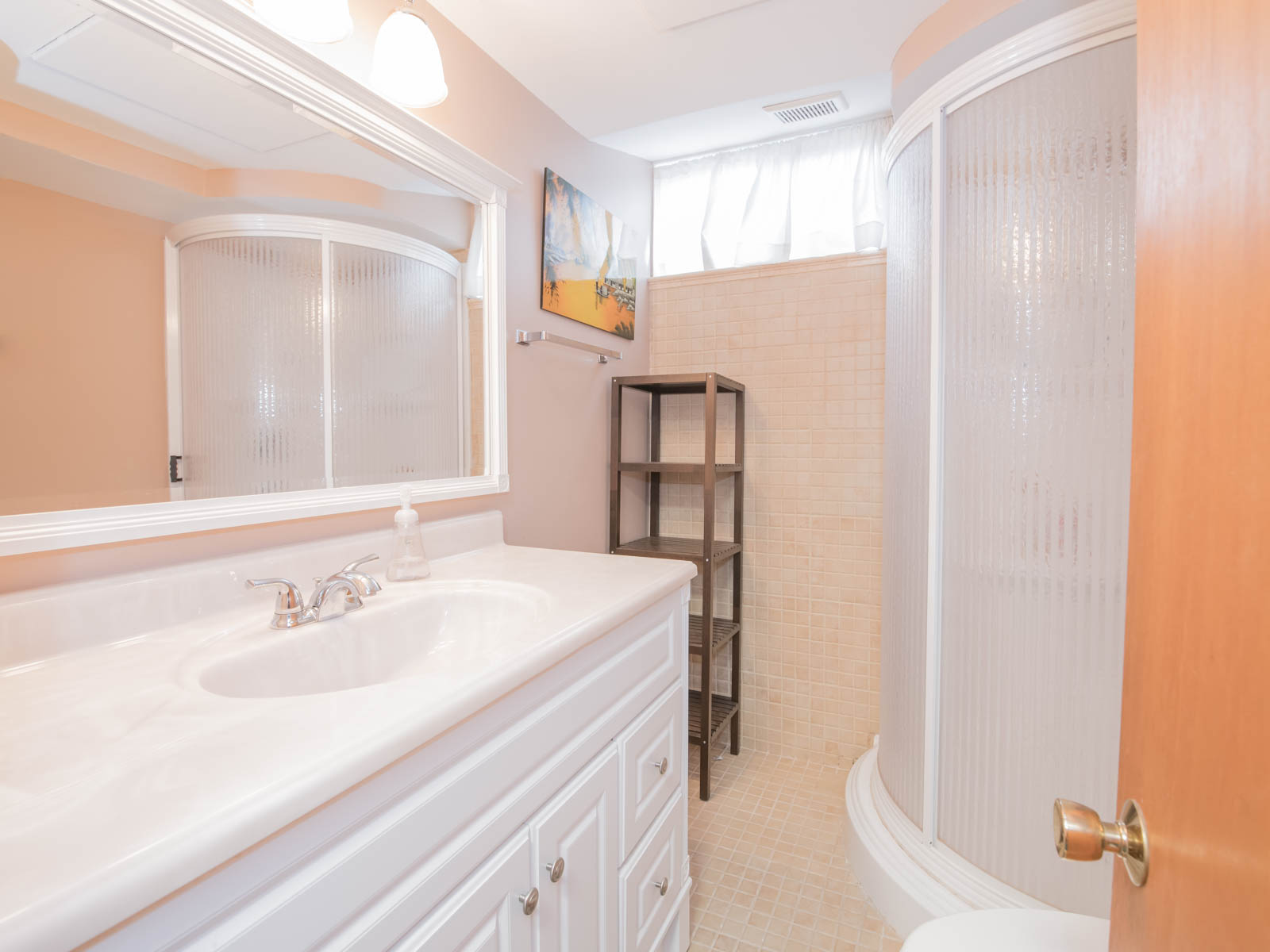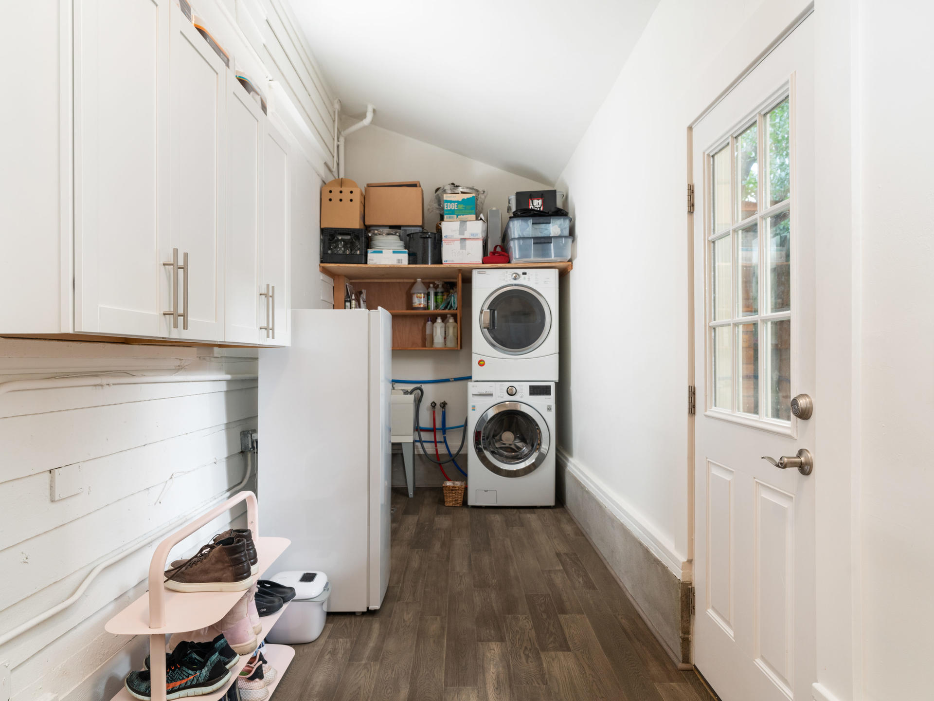 The full, finished basement features a wet bar, wine fridge, travertine tiles and outside entrance, as well as a custom tile shower in the full bath and laundry with washer and dryer.