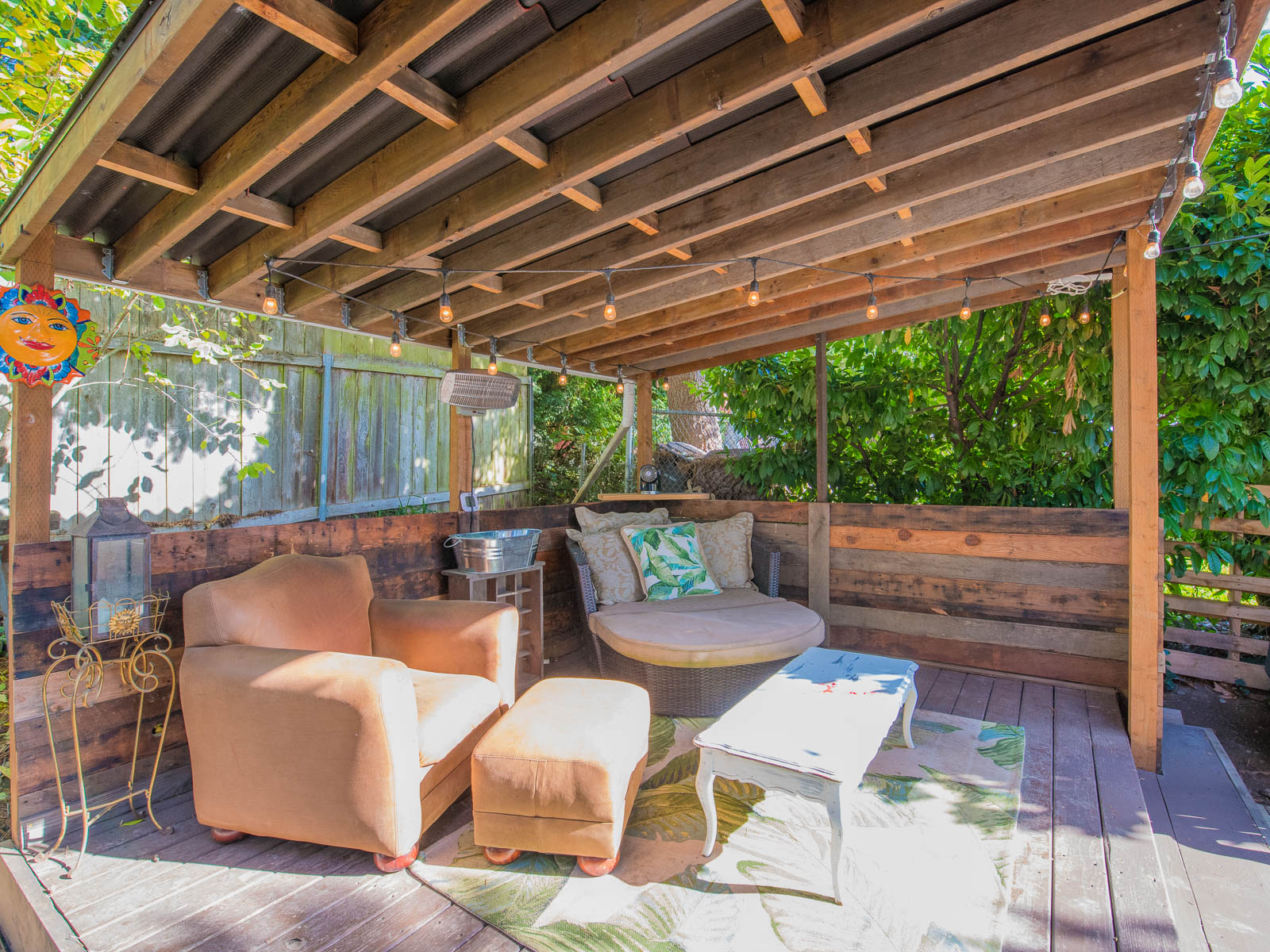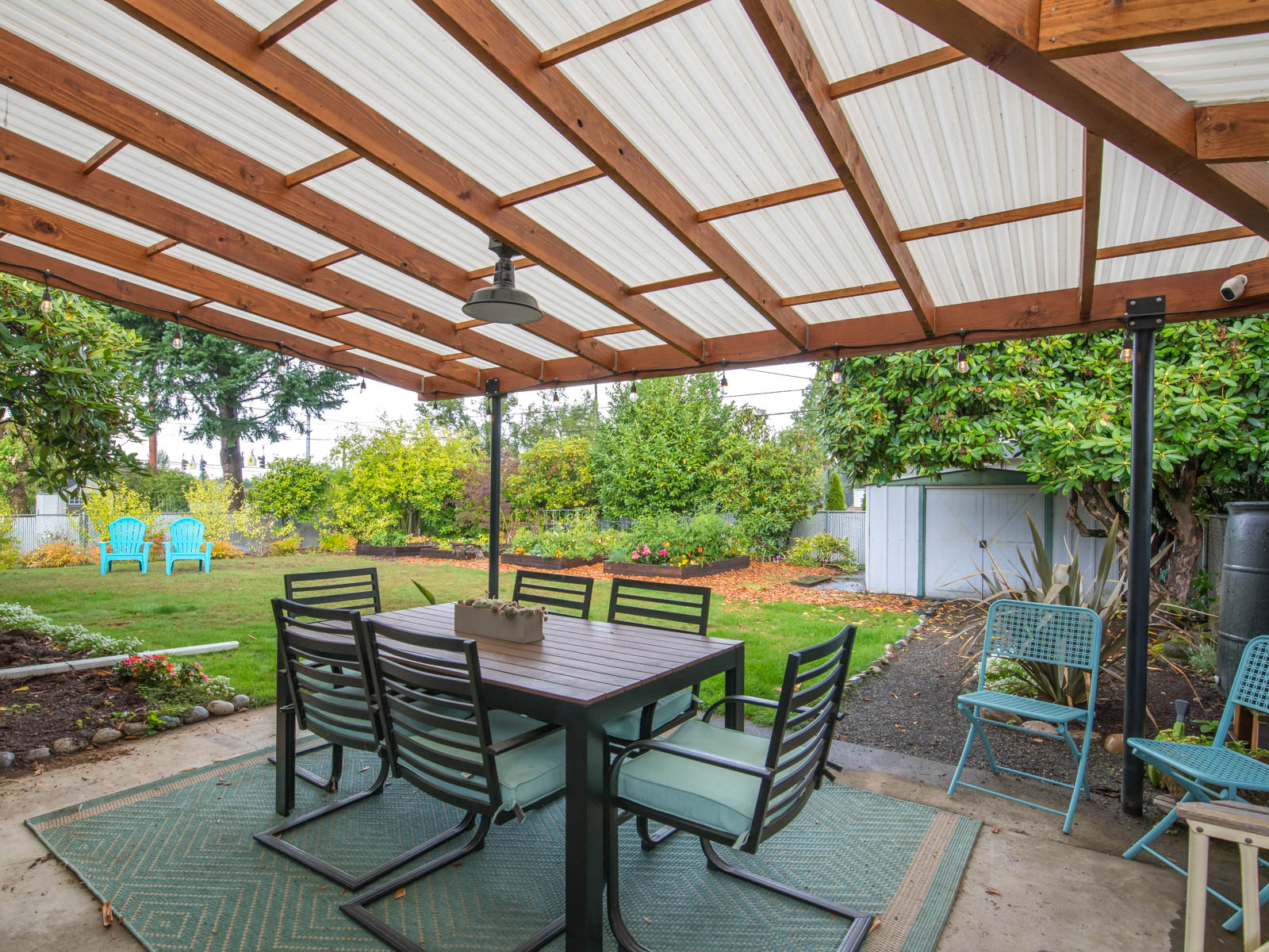 Covered porch, fenced backyard + patio. Rebuilt garage w/roof trusses, 506 sf.