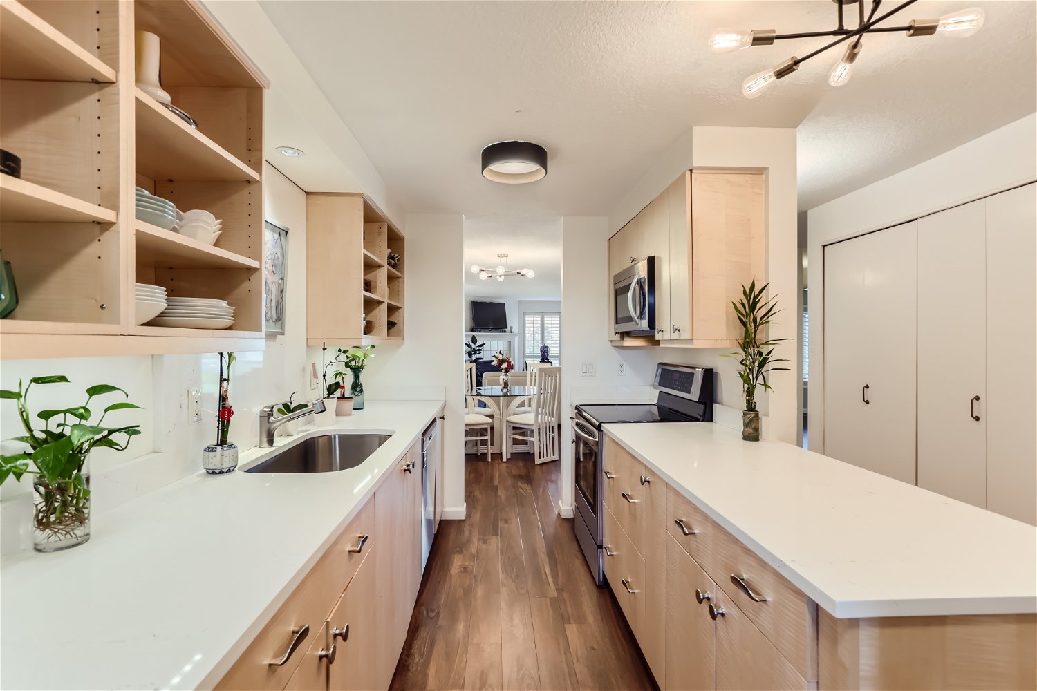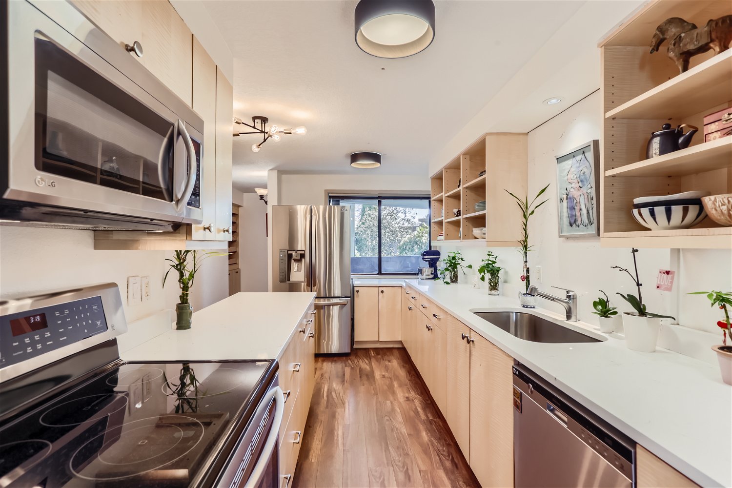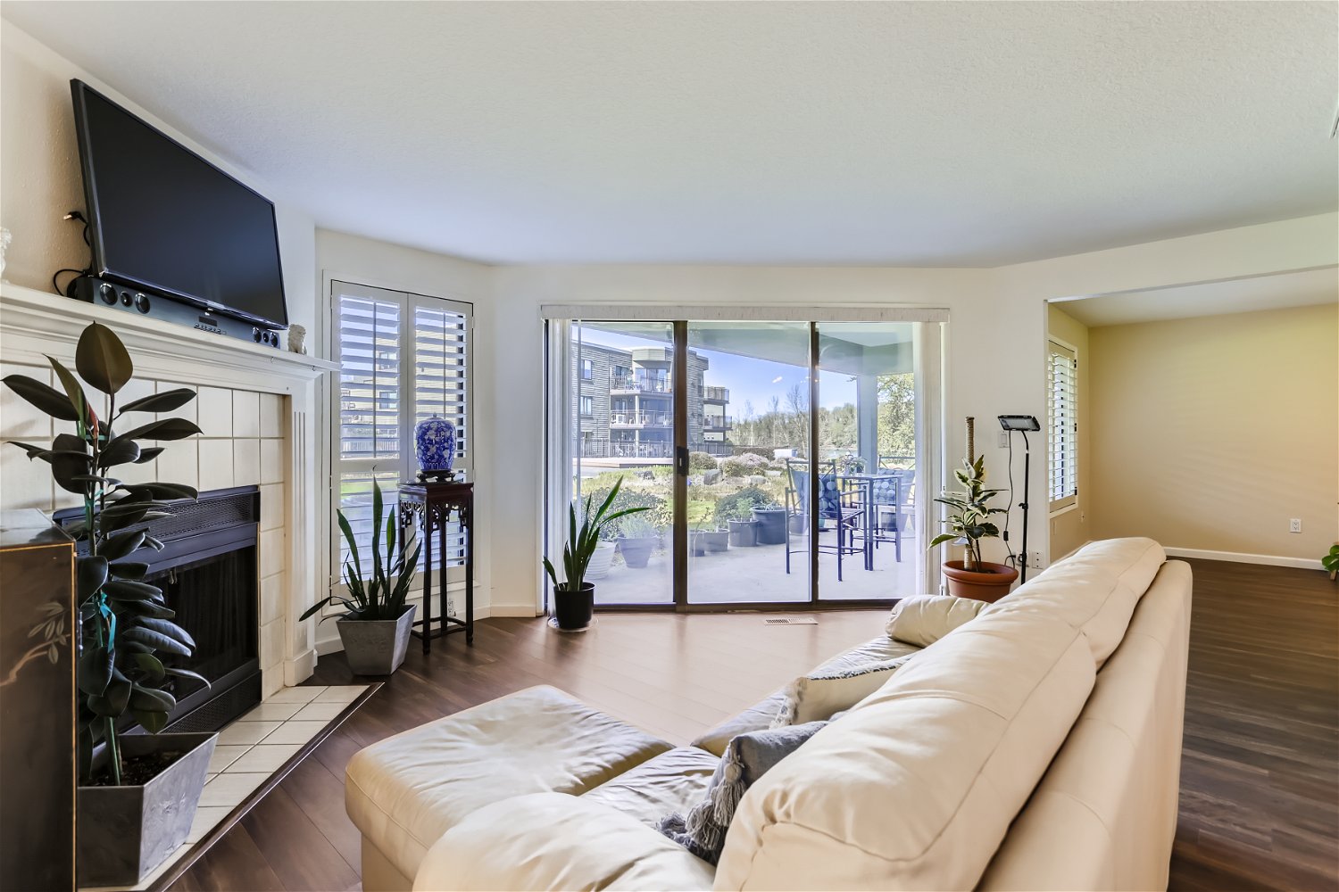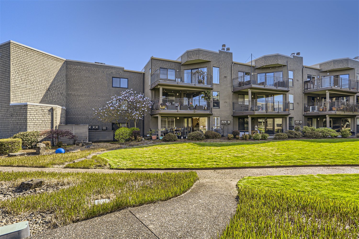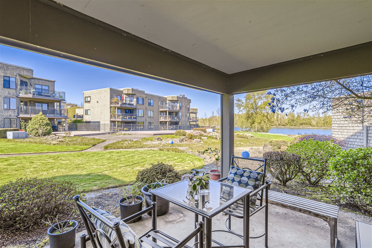 Beautiful Willamette River view condo in John’s Landing! Enjoy the sunshine and river views just steps away from the Willamette River walkway. Well laid out floor plan with large primary bedroom, double closets and ensuite bathroom. Den can easily be converted back to a second bedroom with garden views. Updated kitchen with sleek quartz countertops, stainless steel appliances, wine storage, updated cabinets and lighting. Enjoy the views by the cozy wood burning fireplace or the spacious covered patio. Updated engineered hardwood floors throughout. Simple access living on the main floor and single level. Ample storage and deeded garage. Laundry in unit. Newer heat pump and a/c. Ideal location near shopping, restaurants, walking trails and parks. Don’t miss this one! MLS #24213585