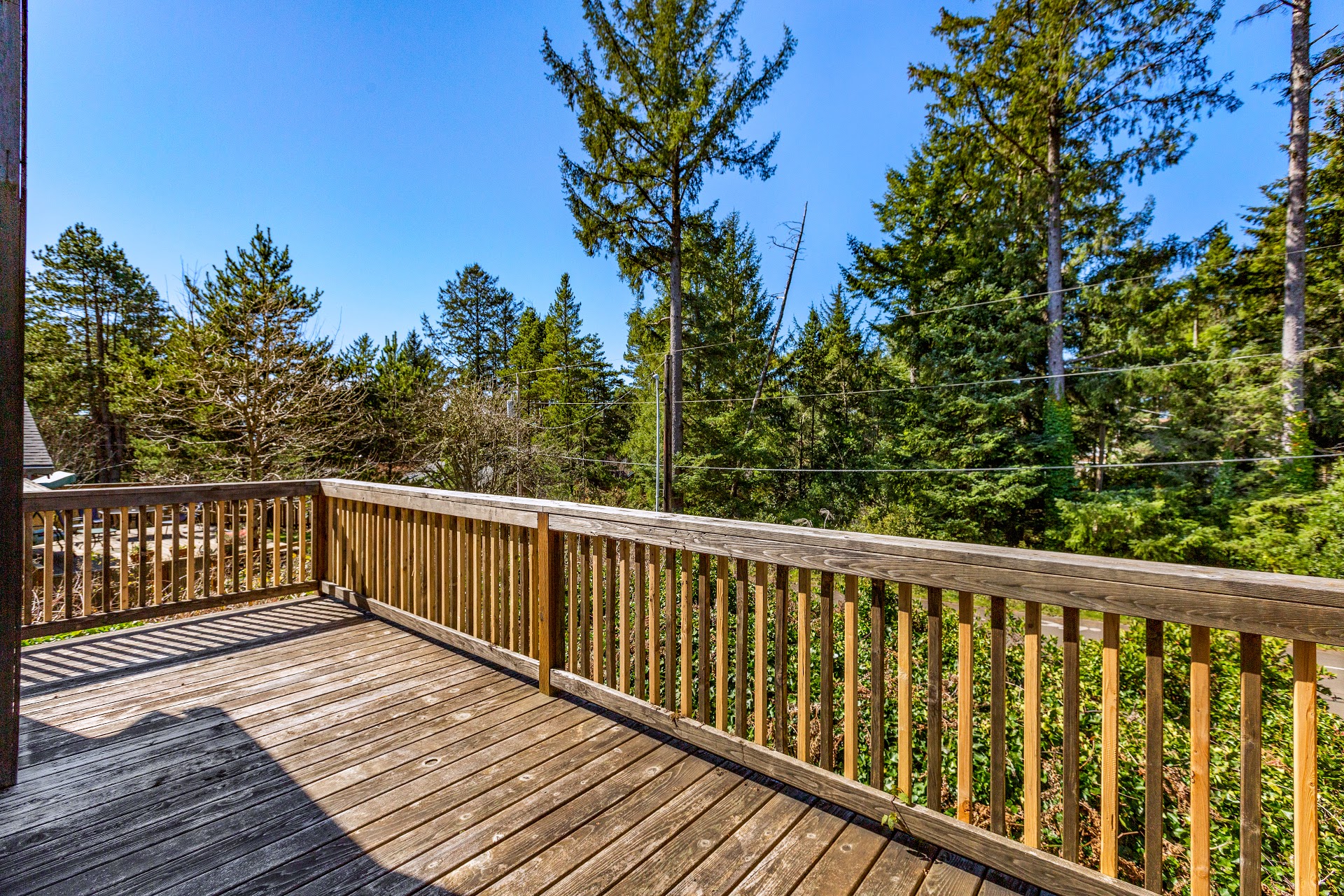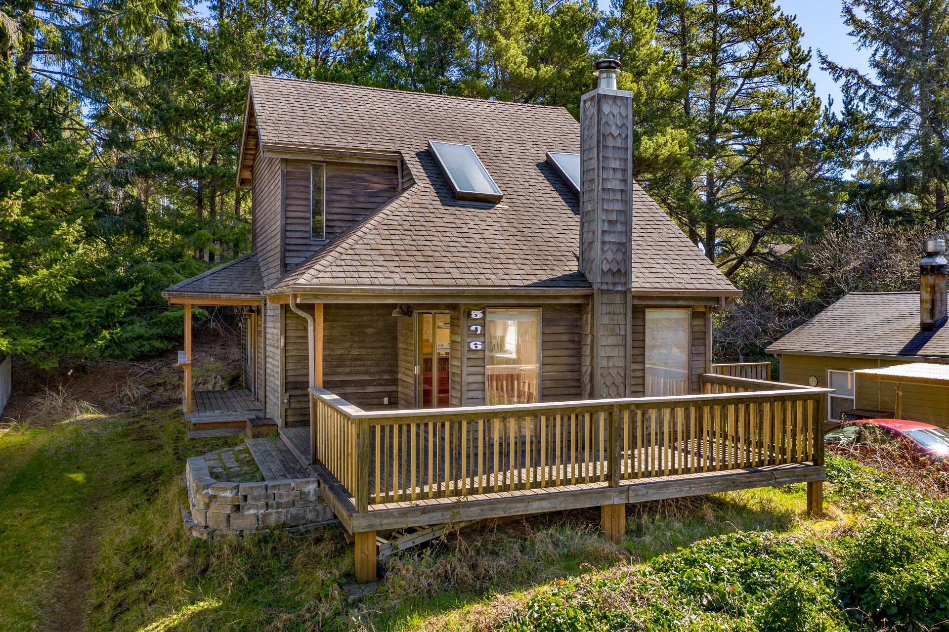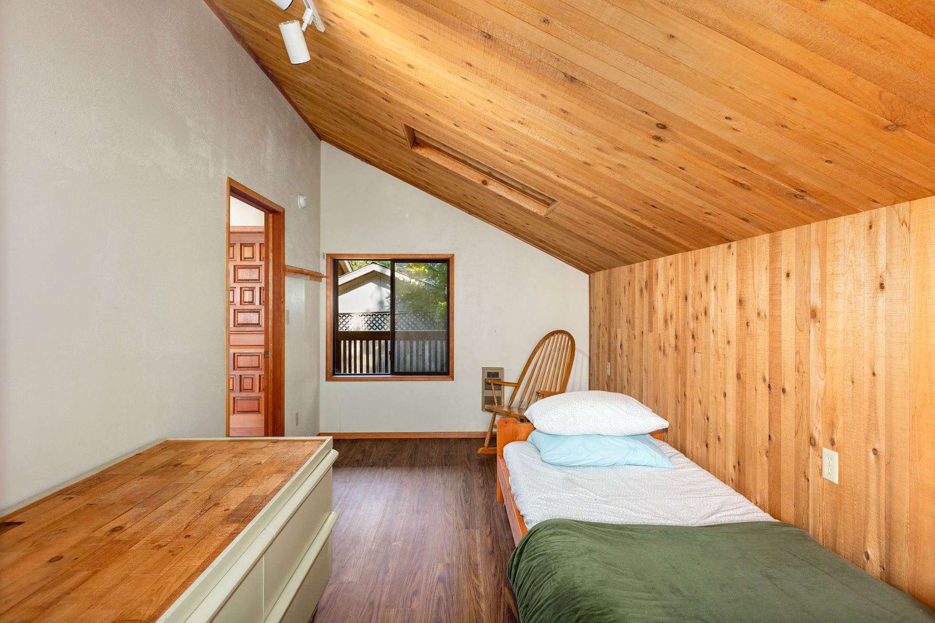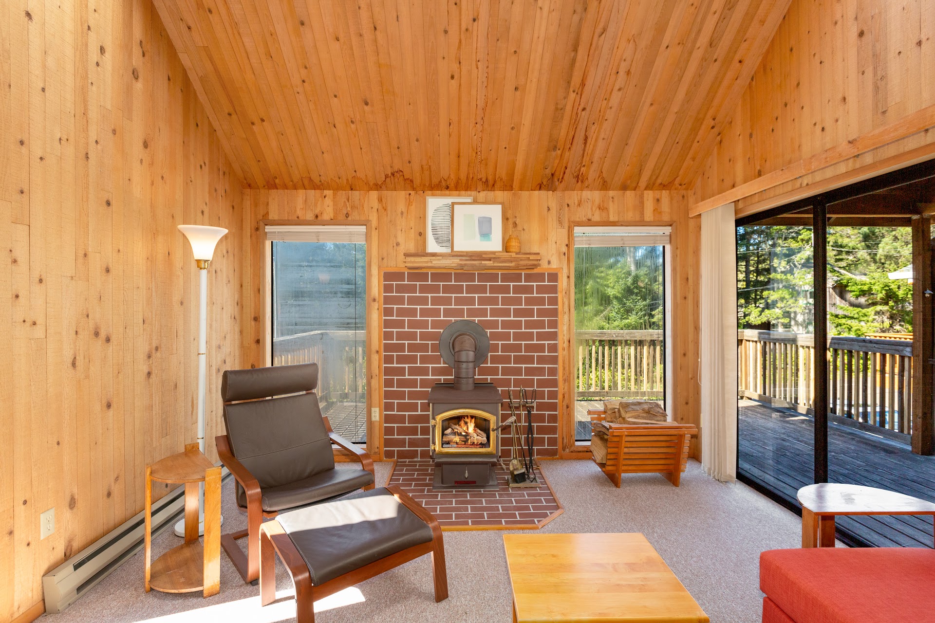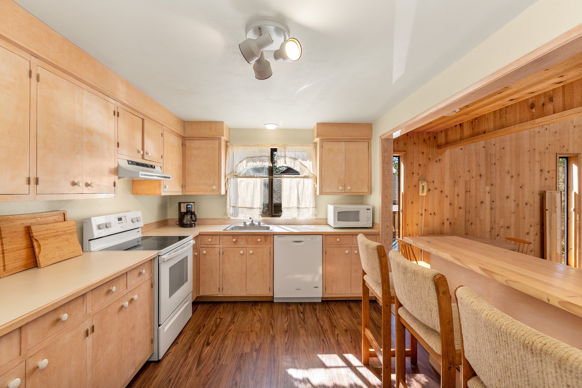 Tucked into an elevated bluff & surrounded by greenery, the 1,050 sq ft home features 1 bedroom + loft and 1 1/2 bathrooms in an open floor plan. A beautiful wooden door offers a stately welcome. Skylights and well-placed windows bathe the interior with natural light, and front deck creates outdoor connection. Throughout the years, the home’s handcrafted details were added to include intricate wood detailing on the front of the kitchen bar.