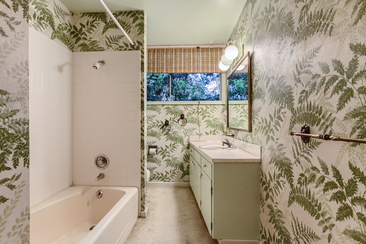 The sellers had owned this home since 1981. They had not truly updated anything in the home since that decade. But still, I could see all the memories and love in the home. Every room has a different, funky wallpaper. The living room has green shag carpet and the family room has a Christmas theme carpet. The backyard is a jungle with trees covered in vines and a slope that looks scary to climb. I can feel the fun vibes and times shared in this home. Time for us to get to work!