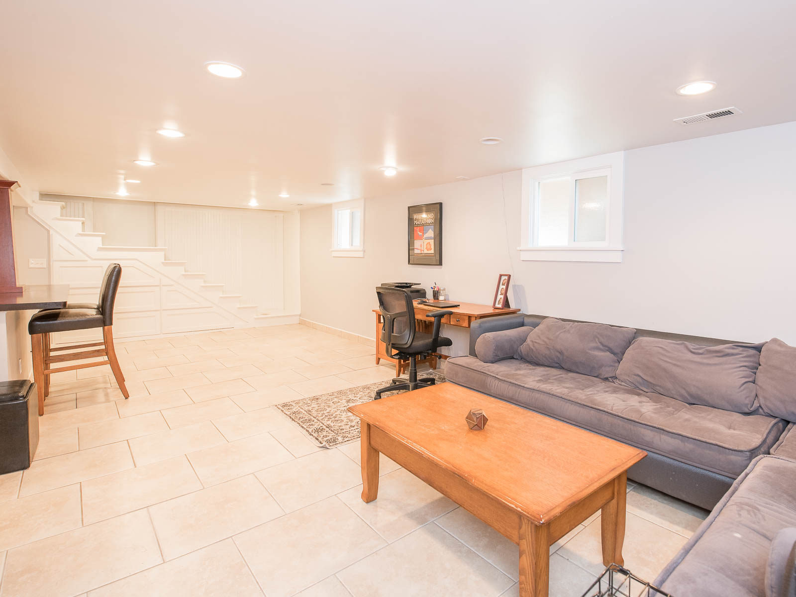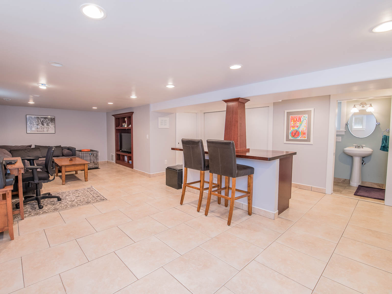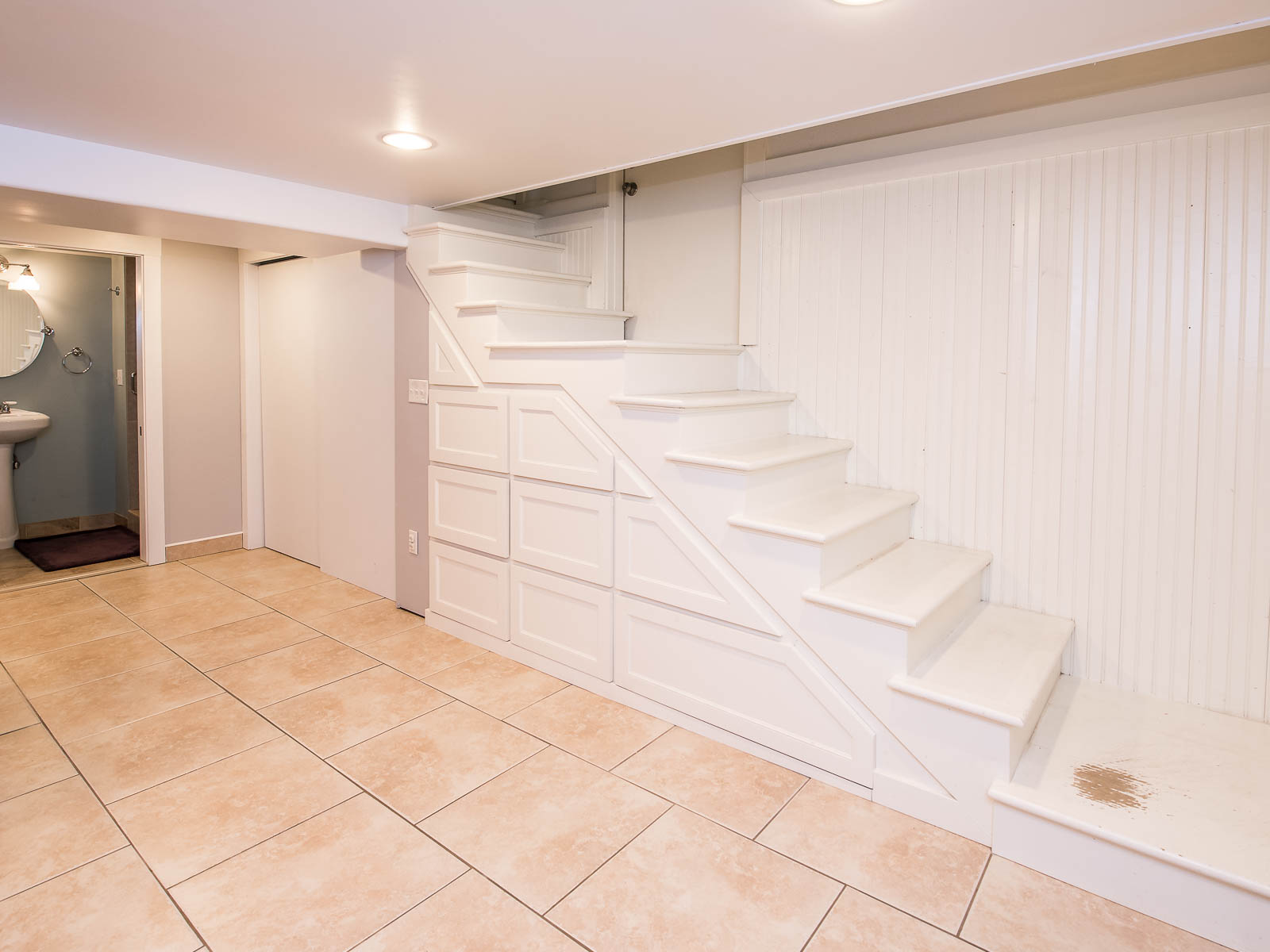 The fully finished basement features a full bathroom, dedicated laundry space, and a large island for work, projects, and entertainment. A large utility and storage room sits in the front corner. There is also a separate exterior door to the basement, providing the potential for an AirBnB or ADU space (with some modifications). There is a surprising amount of storage around the house, including a beautiful set of custom built-in drawers in the basement stairs.