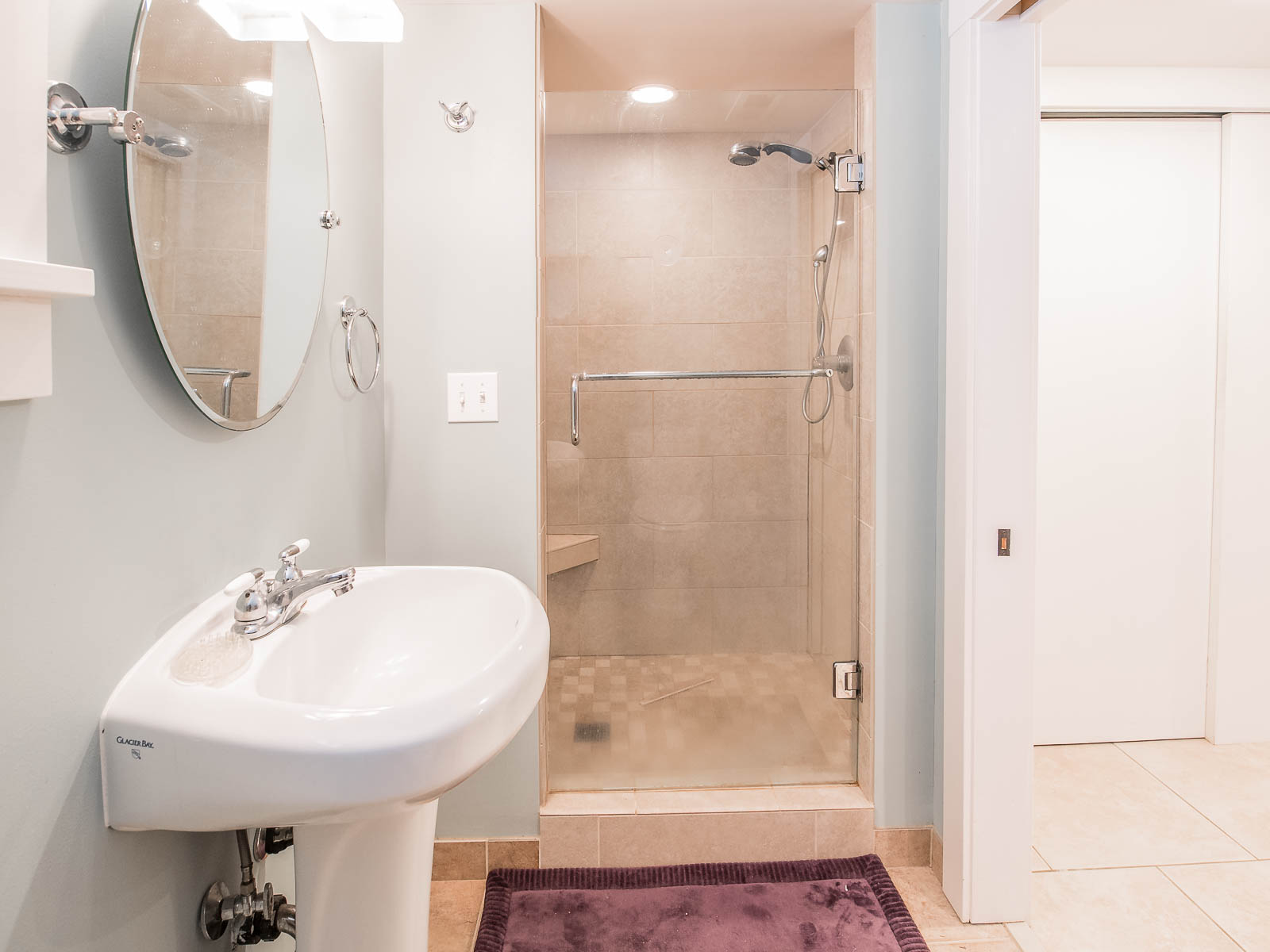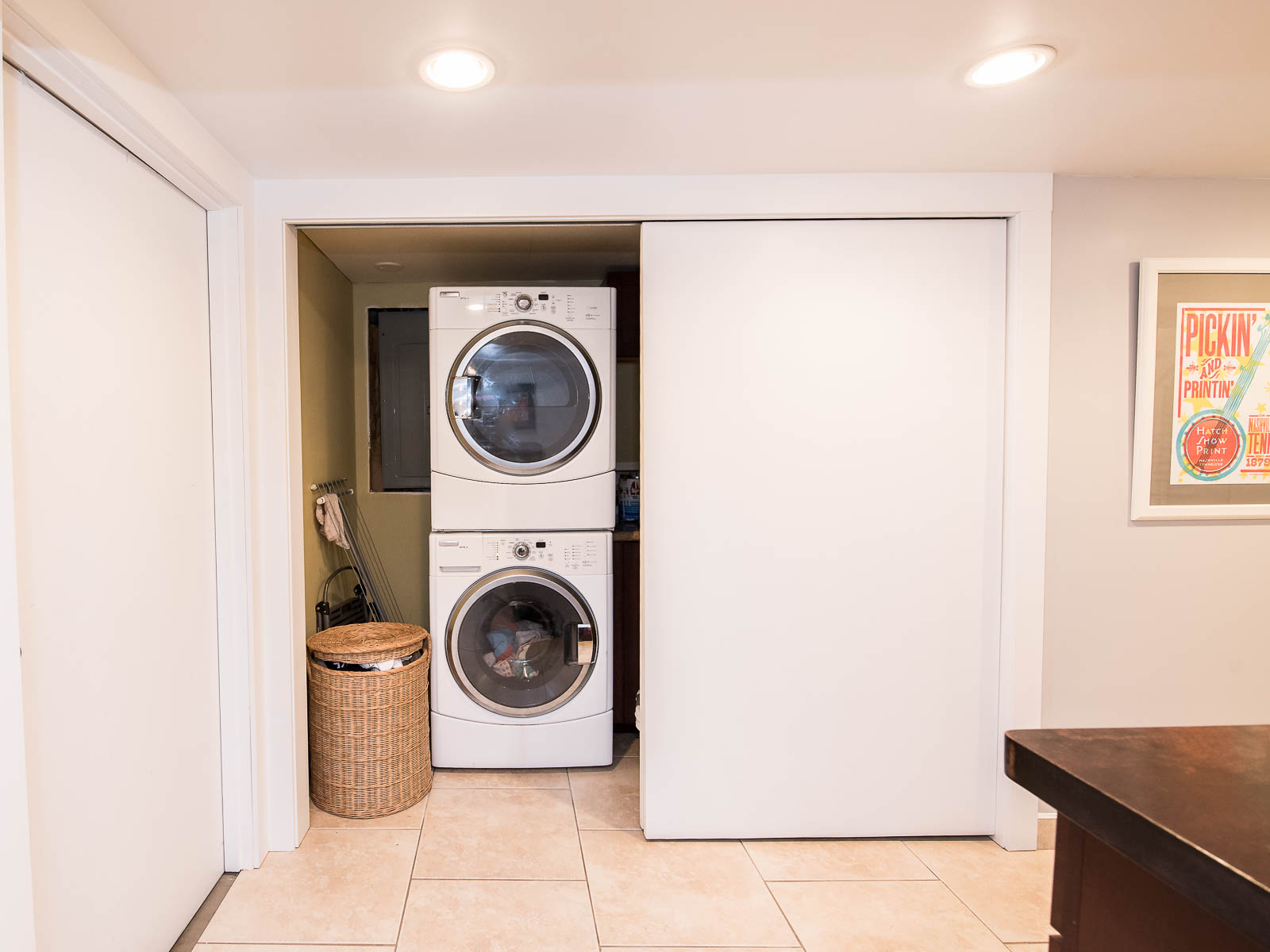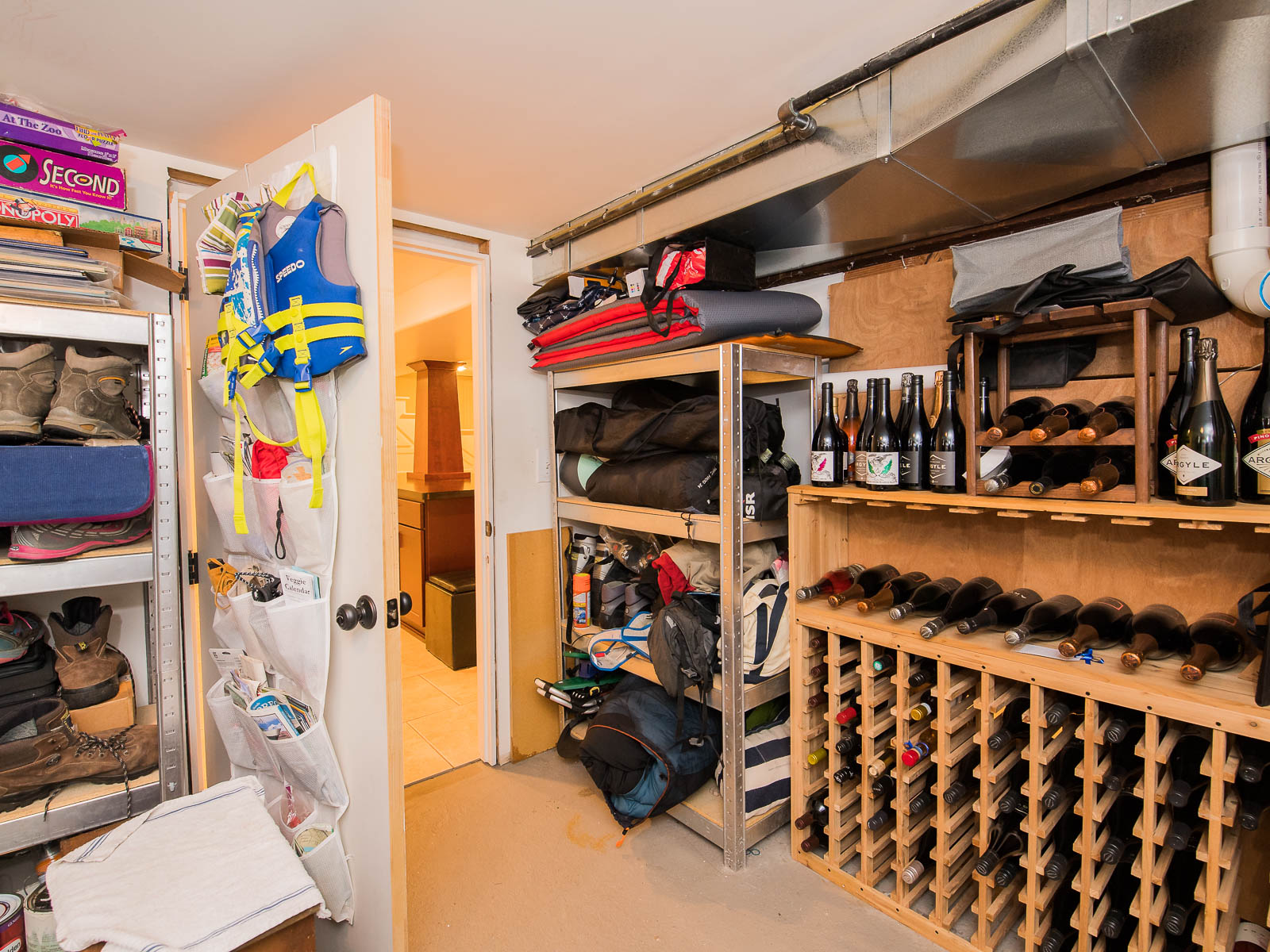The fully finished basement features a full bathroom, dedicated laundry space, and a large island for work, projects, and entertainment. A large utility and storage room sits in the front corner. There is also a separate exterior door to the basement, providing the potential for an AirBnB or ADU space (with some modifications). There is a surprising amount of storage around the house, including a beautiful set of custom built-in drawers in the basement stairs.