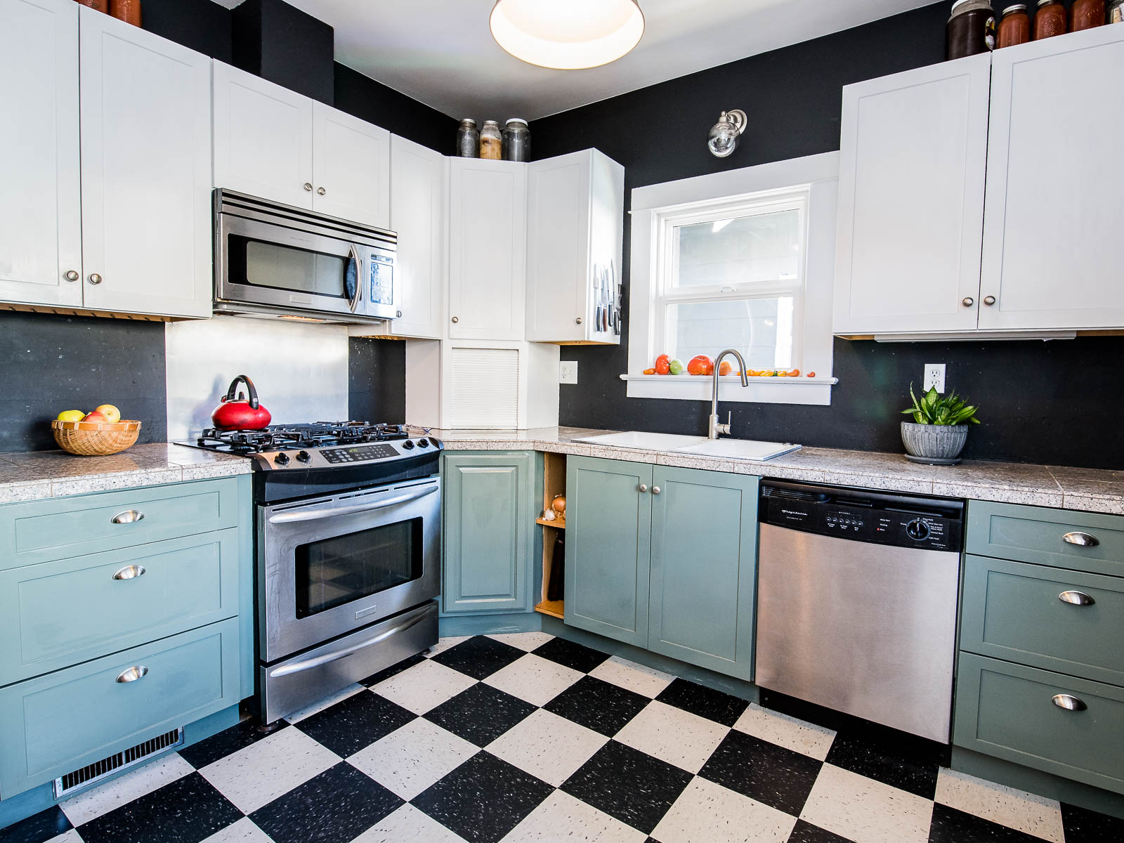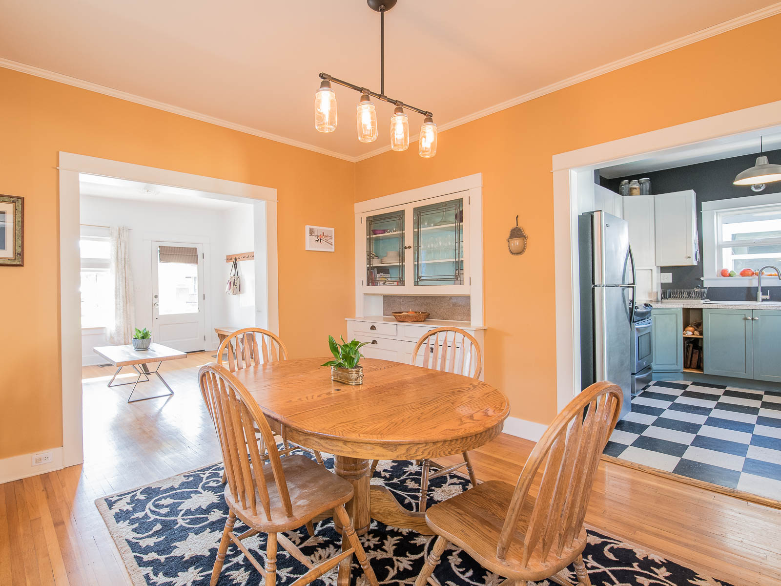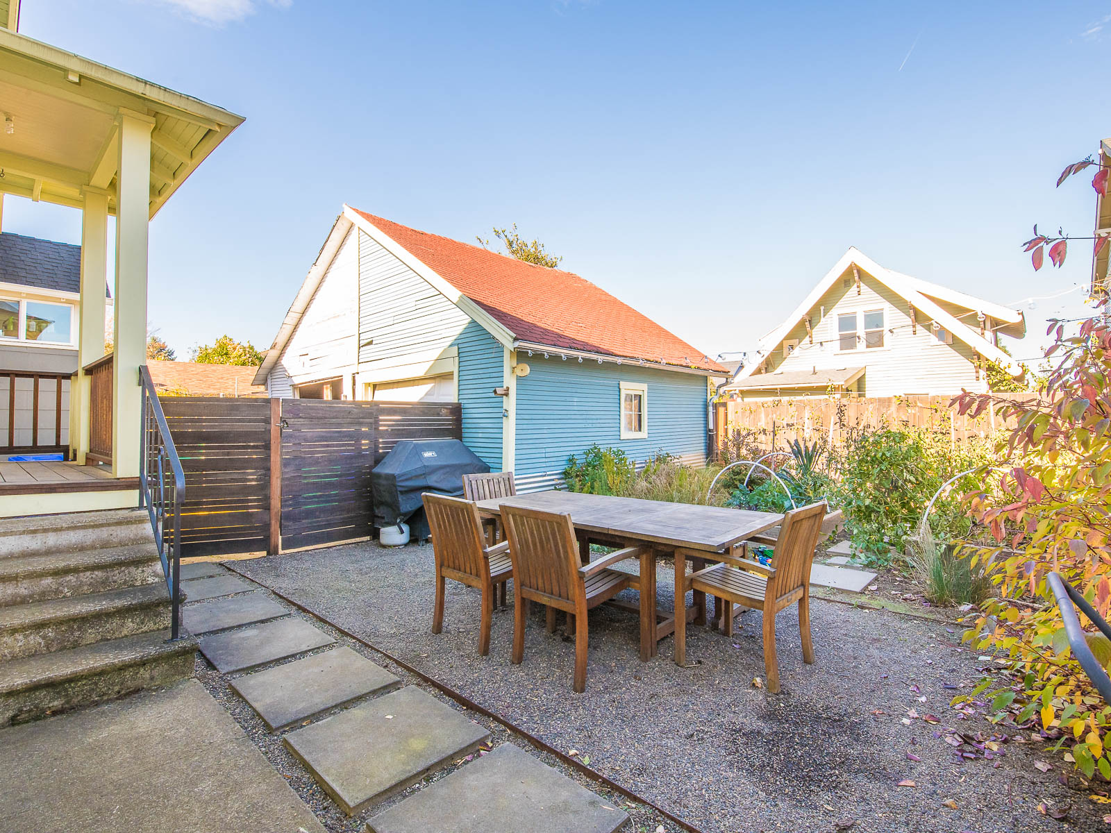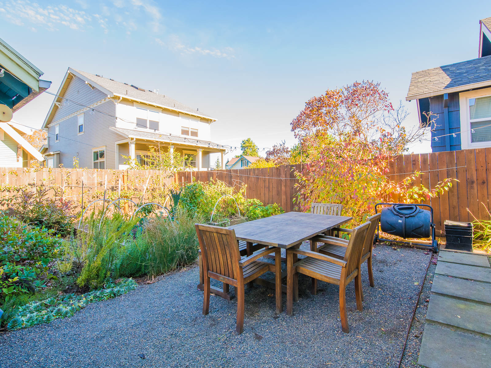 The living and dining rooms flow together seamlessly and create an open layout that leads directly to a spacious, working kitchen with plenty of cabinet and counter space. A back door from the kitchen leads to a well-kept garden oasis in the backyard, as well as the shared, detached garage. The backyard gets plenty of sunlight, especially in the summer, and there’s a great balance between garden beds and patio space for entertaining and chill time.