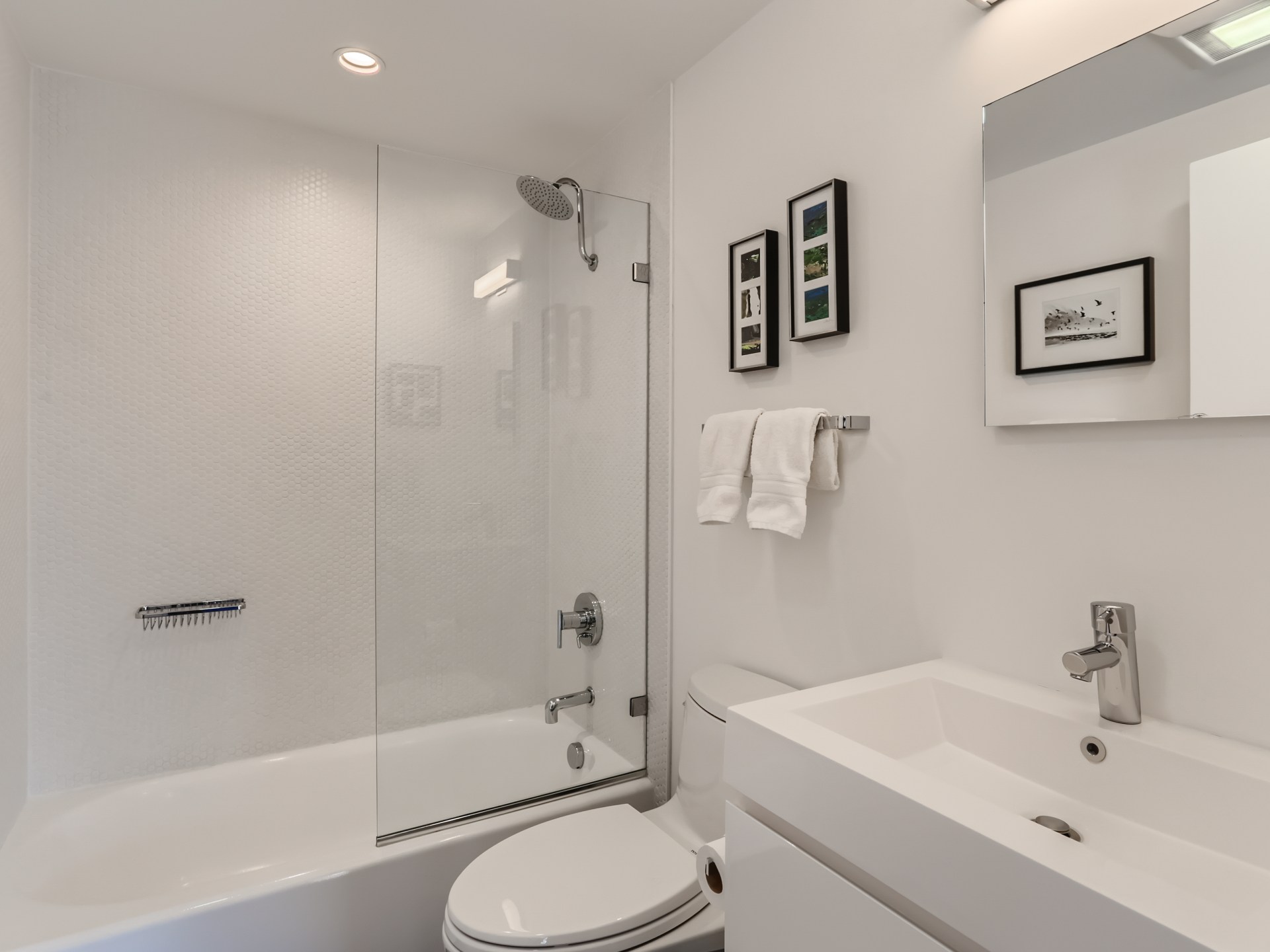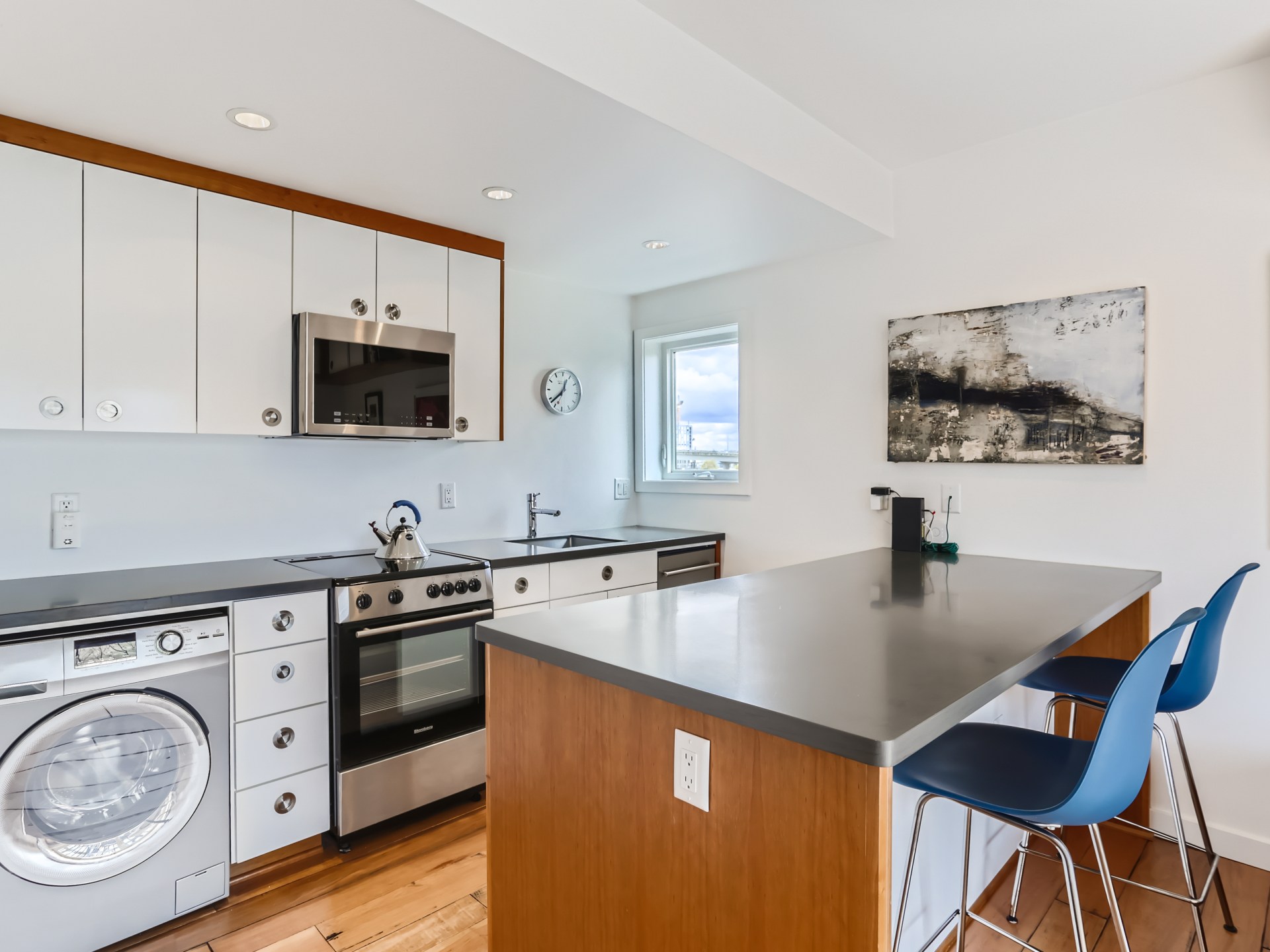 Unique and smart storage in the living space adds to the fresh design. The bathroom features white penny tile in the shower with glass door and slate tile floors. Private balcony offers a quiet space to enjoy the south facing, city views. Smart Hue lighting system with ceiling fan. Dual washer/dryer in unit. Windows and sliding door are new with custom blackout shades. The closet is oversized with custom built in shelving. This one has it all!