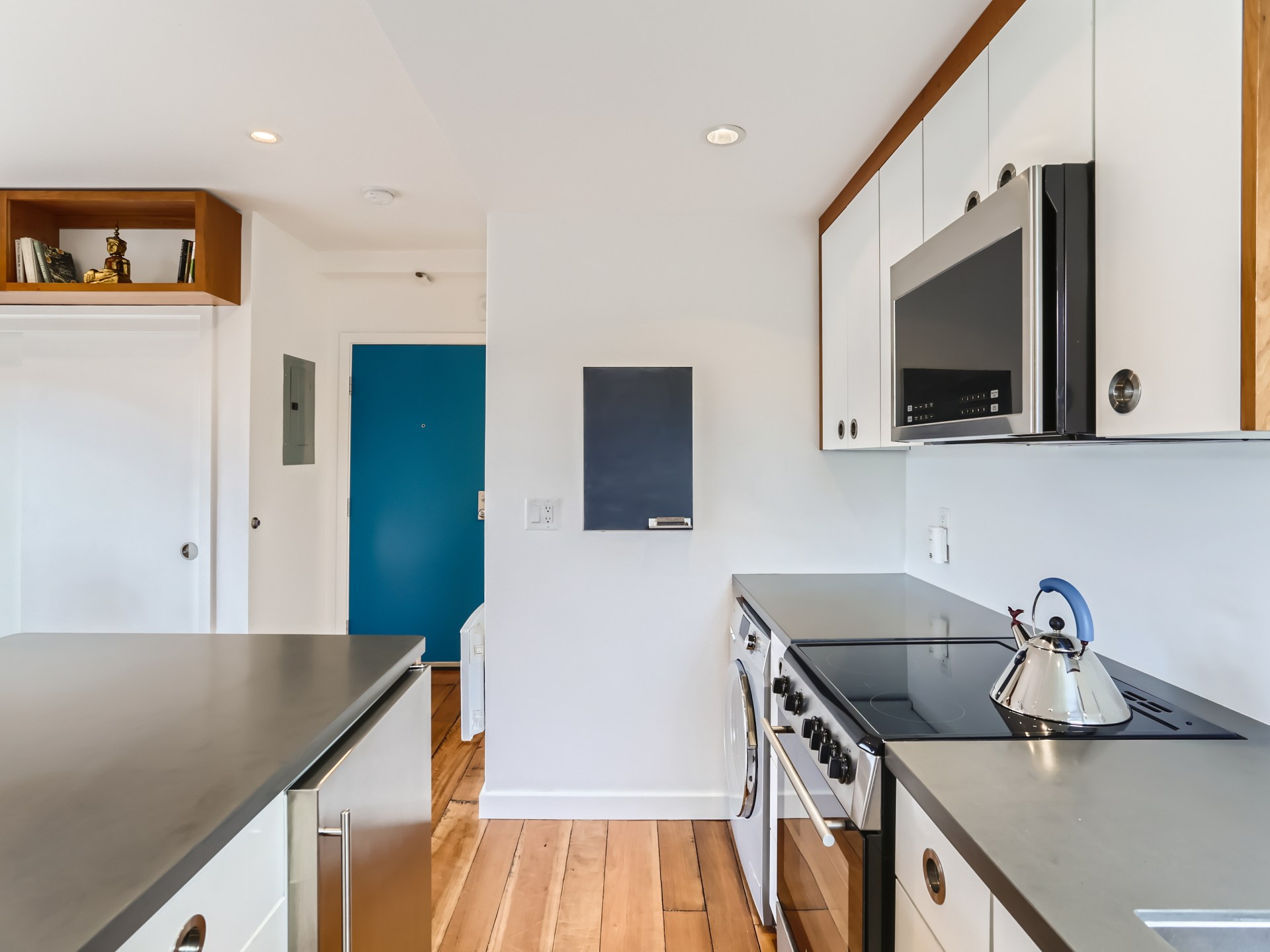 Stunning top floor, corner studio at the Royal Arms! This condo has been fully remodeled top to bottom to bring modern touches to the space. The kitchen features clean lines with all new appliances and dark Himac counter tops. The oversized island allows for both an eating and work space plus storage. The warm engineered hardwood floors bask in the sunlight pouring in.