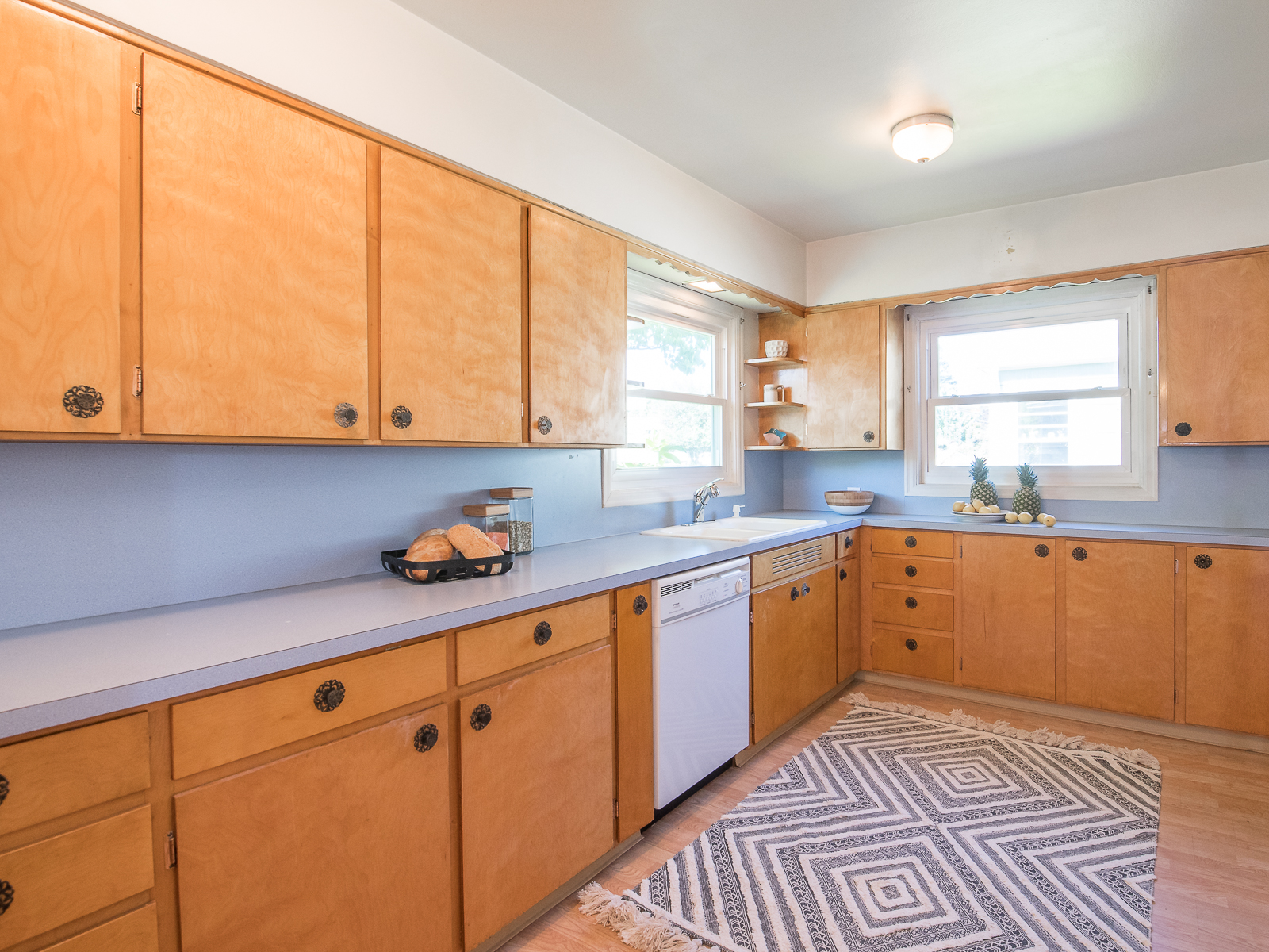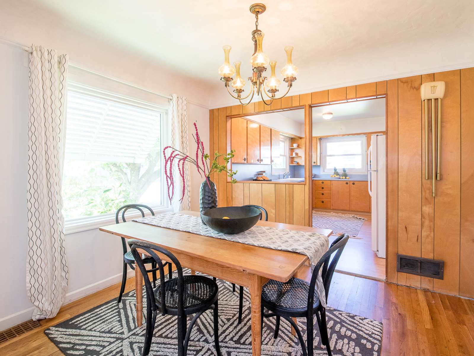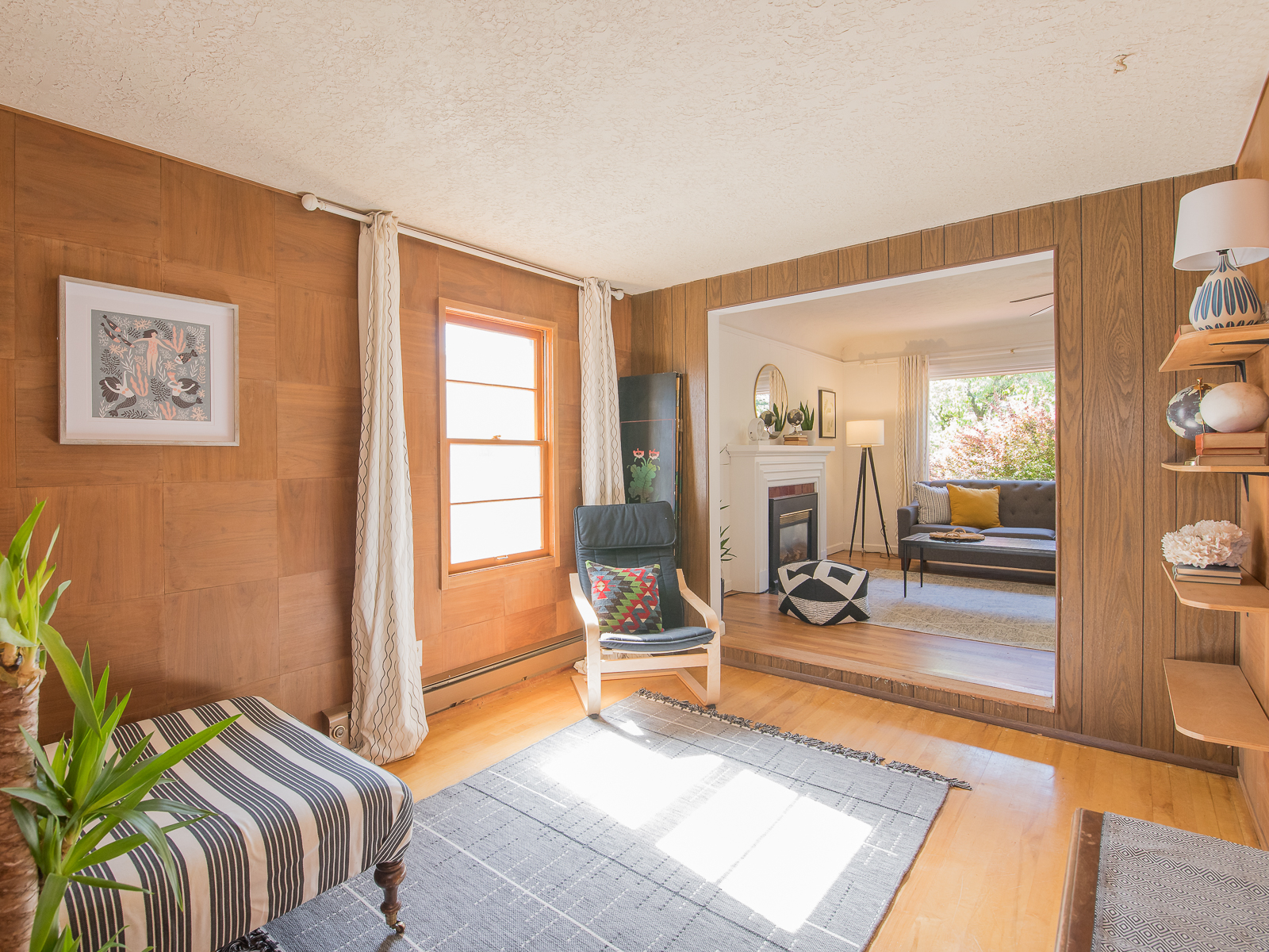 Much to love in this spacious, light-filled mid-century charmer! Gleaming hardwood floors, gas fireplace, 2 bedrooms, 1 bathroom, den, and bonus space for a home office with a door to the patio. Newer windows, gutters, roof, water heater. Check out the mid-mod bar, ample space and separate entrance in the basement. Huge landscaped backyard filled with trees! Walkable, bike-able, close to transit and the airport – this is the home you’ve been waiting for.