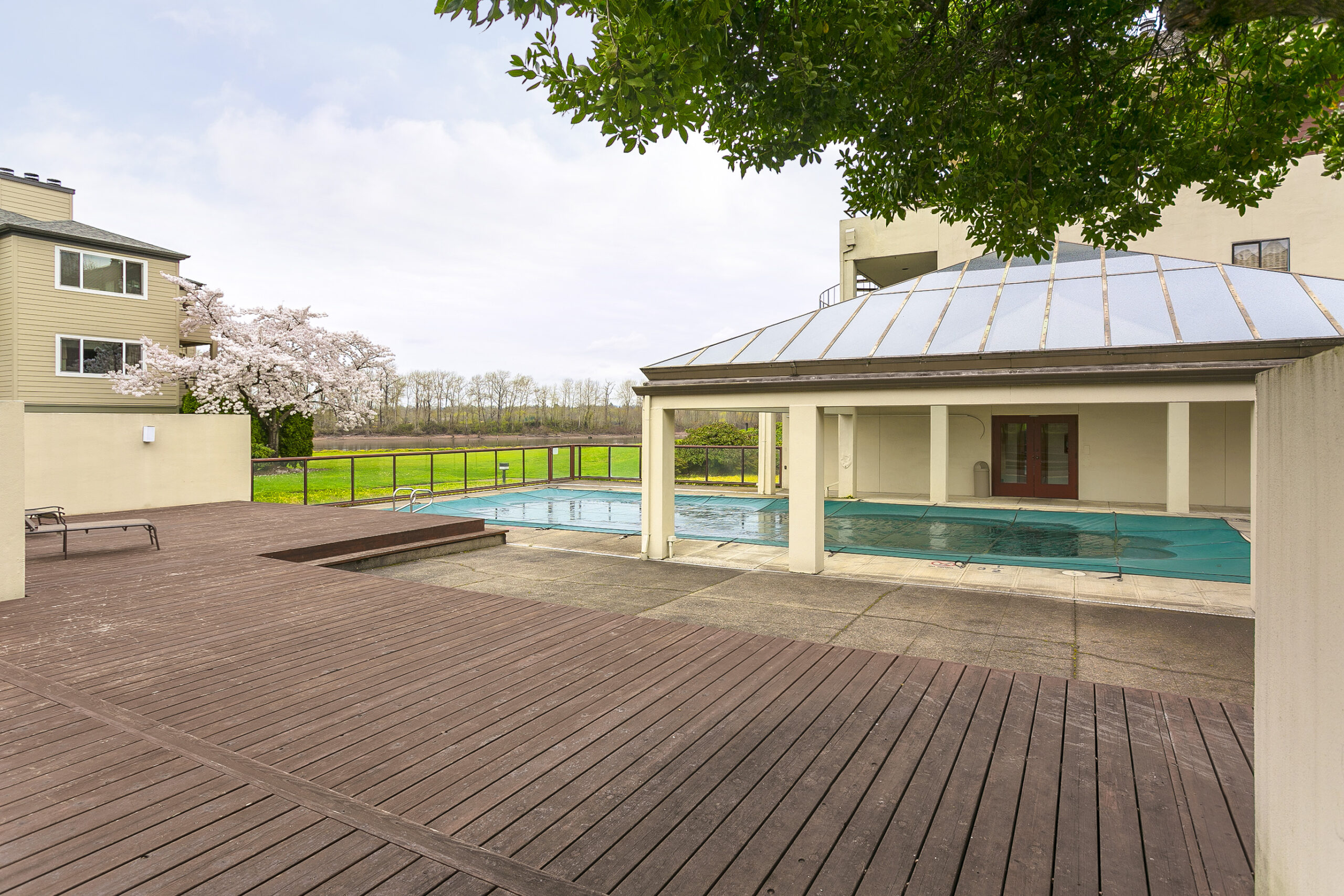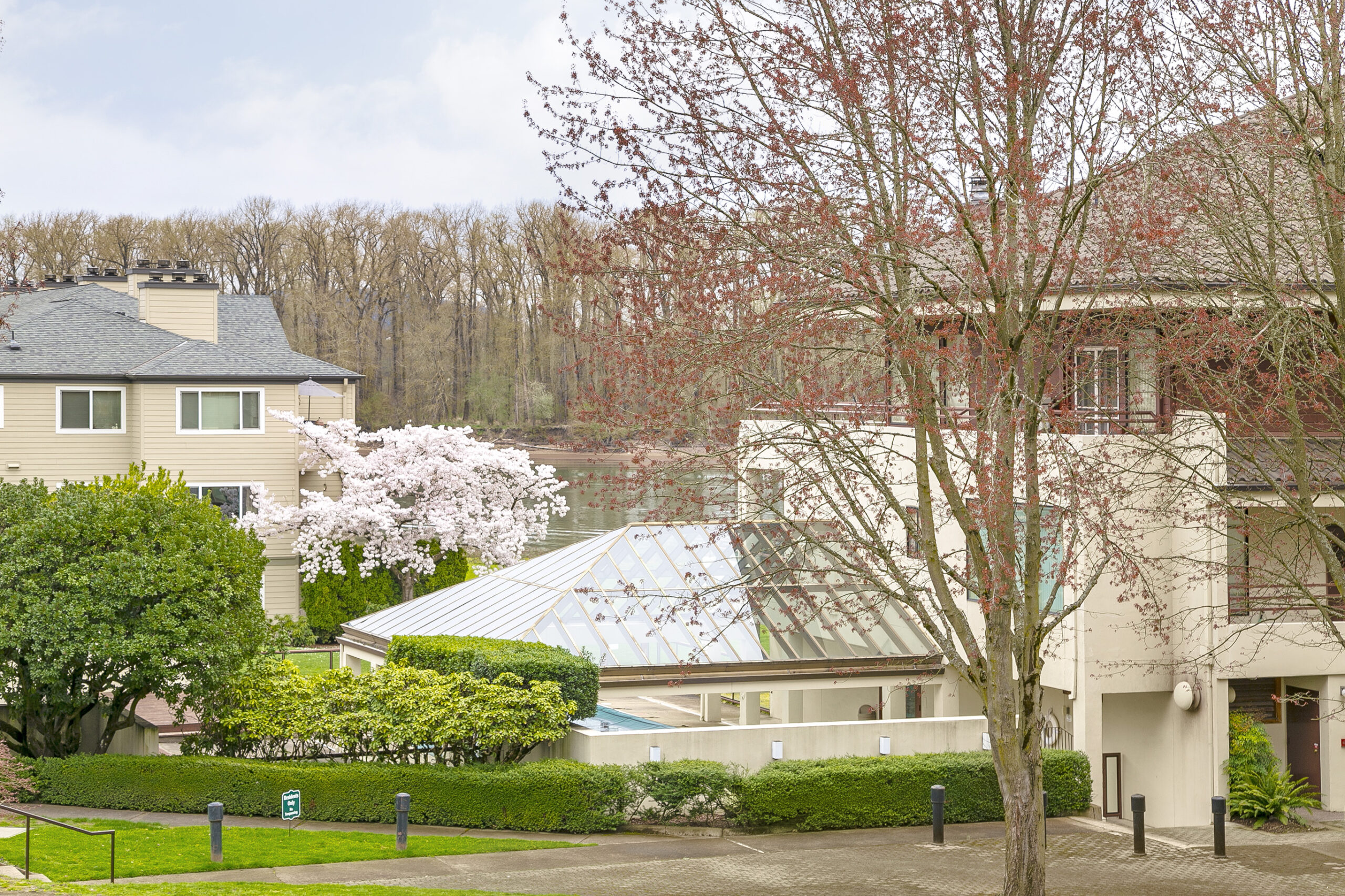 This is the unit you’ve been waiting for – at an improved price! Two real bedrooms and two full baths in an elevator building. Lovely, partial river view and peaceful grounds with water features and verdant gardens. Living-dining great room flows to spacious balcony for all weather river views. One deeded parking spot. Walk to south waterfront and catch the street car downtown or stay in the neighborhood for fun cafes and Willamette Park. Railroad is used on summer weekends for charming Lake Oswego Trolley. List agent is related to seller.