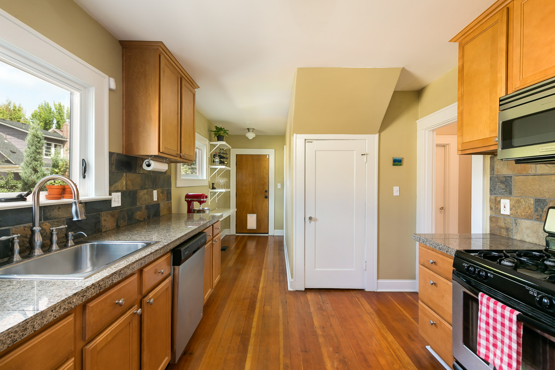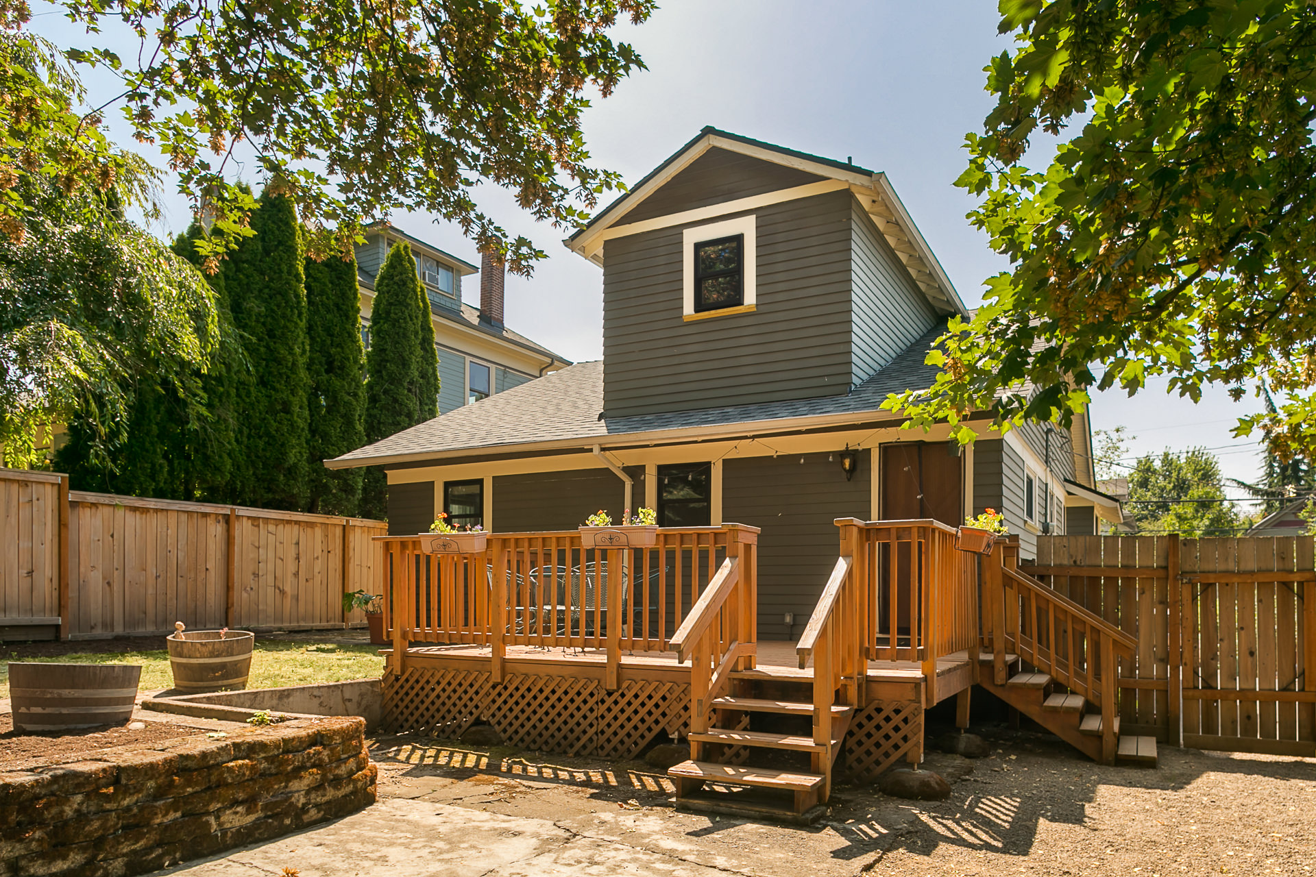 This impeccable and stylish classic 1923 Craftsman is the true Portlandia dream. Classic details and modern updates make this the ultimate place to kick off your shoes after a long day of enjoying the amazing Sunnyside neighborhood. Original millwork and gleaming oak floors throughout. Main floor features a stunning fireplace, built-ins, arched doorways, and an easy floor plan for entertaining. The kitchen has been updated with gleaming granite countertops, tiled backsplash, and stainless steel appliances. 2 bedrooms and 1 full bath on main, with full master suite on upper floor. The unfinished basement is a great place for storage or band practice, whichever is your style. Updates include new roof, newly repaired chimney, lights in basement and back patio, new insulation in parts of attic, and added a grounding rod to properly ground the house. Large backyard has a great deck and lots of room to play. Enjoy the privacy afforded by the old-growth Douglas Fir trees overhead and the dog-proof wood fence.