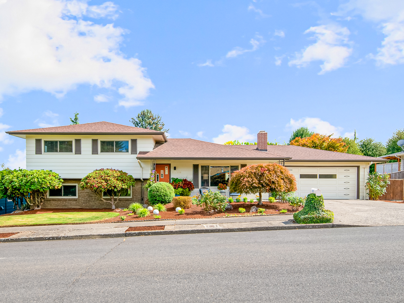 Featuring 3 bedrooms (master with view of St. Helens) and a family bathroom upstairs; a family room, 1 bed, bathroom, laundry/mudroom with outside egress door to back yard, downstairs; and on the main floor, a formal sunken living room with fireplace, open plan kitchen/dining room with eat/homework bar, and sliding glass door that flows out to the inviting gardens which are terraced and hardscaped w/ multiple patio options.