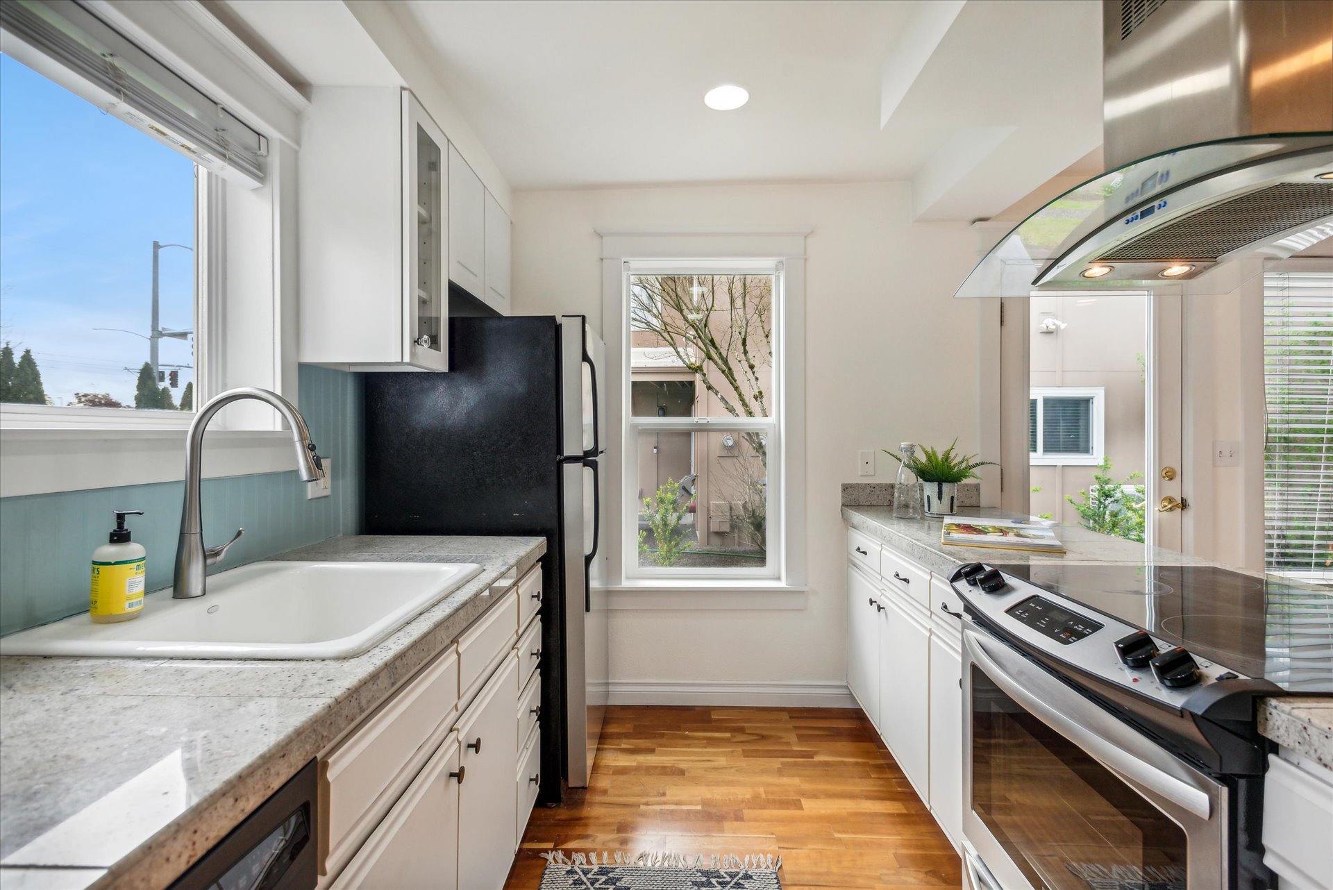 Upstairs, find three bedrooms and a full bathroom, with fresh paint and plenty of storage. Enjoy summer cookouts in your private yard off the kitchen, with access to your personal parking space nearby.