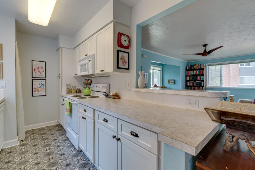The galley kitchen has electric appliances plus substantial storage & counter space. You will find the washer and dryer tucked away here, too.