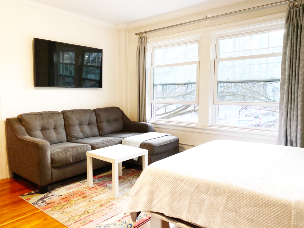 The stylish, updated bathroom nods to the building’s historic charm and character. The large closet offers plenty of storage space as well as a full size high efficiency washer and ventless dryer. Relax in the spacious living space complete with custom murphy bed and take in the views of the tree-lined, lower-traffic street.