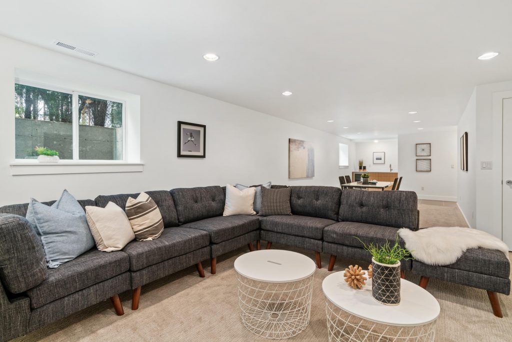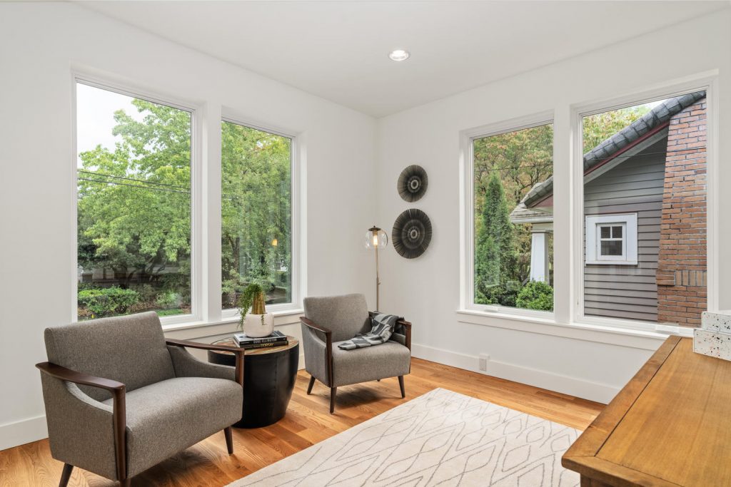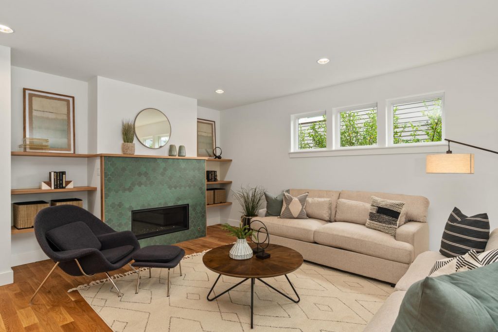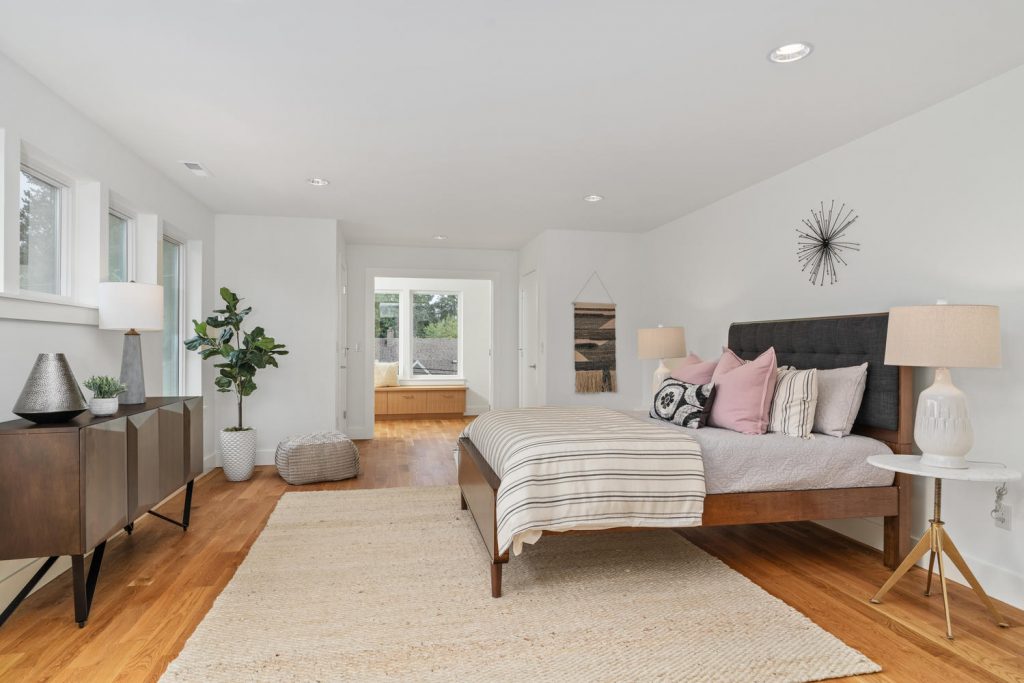 The main floor boasts an open living room and dining room with tall ceilings, tons of natural light and a main floor study or guest room tucked nicely in the SE corner. You can enter the great room / kitchen via a central hallway or through the open dining room where oak hardwoods are paired with rift white oak cabinetry and classic surface treatments. Cedar and Moss lighting, built-in bookshelves, and Ann Sacks swiss cross tiling on the fireplace speak to some of the high end finishes that compliment one of the finest kitchen / great rooms you will see on the Eastside. Rounding out the main floor is a full bathroom and easy access to the covered back porch through an expansive three panel door.