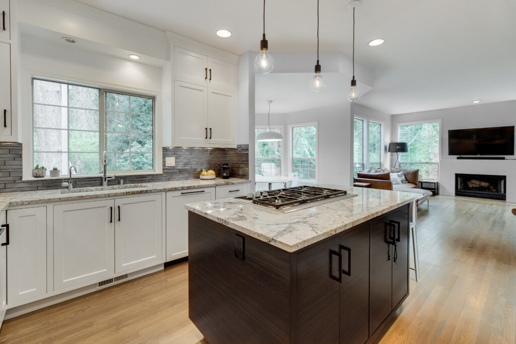 Class meets designer updates in this custom contemporary dream home. The light-filled living room greets you with high ceilings and a sophisticated modern fireplace connecting to the large formal dining space. Updated custom kitchen with stone counters, hardwood floors, modern lighting, and stainless-steel appliances includes a cozy dining area and is open to a cozy living space filled with windows overlooking the lush forested lot. The updated master suite with large walk-in closet and luxe, spa-like master bathroom features heated floors and a soaking tub surrounded by trees. The unique and functional floor plan includes flex space on the main and upper floors perfect for additional family rooms, bedrooms, or office spaces. Recent updates include new roof, new hardwood flooring, all bathrooms, solid core doors with sleek hardware throughout, designer entry door, a custom railing, and designer lighting. The home is located in a highly desirable location placed deep within its lot on the end of a cul de sac backing to a private wooded setting. The exterior features new paint, an expansive deck overlooking a private yard, and a large patio with a louvered roof perfect for entertaining.