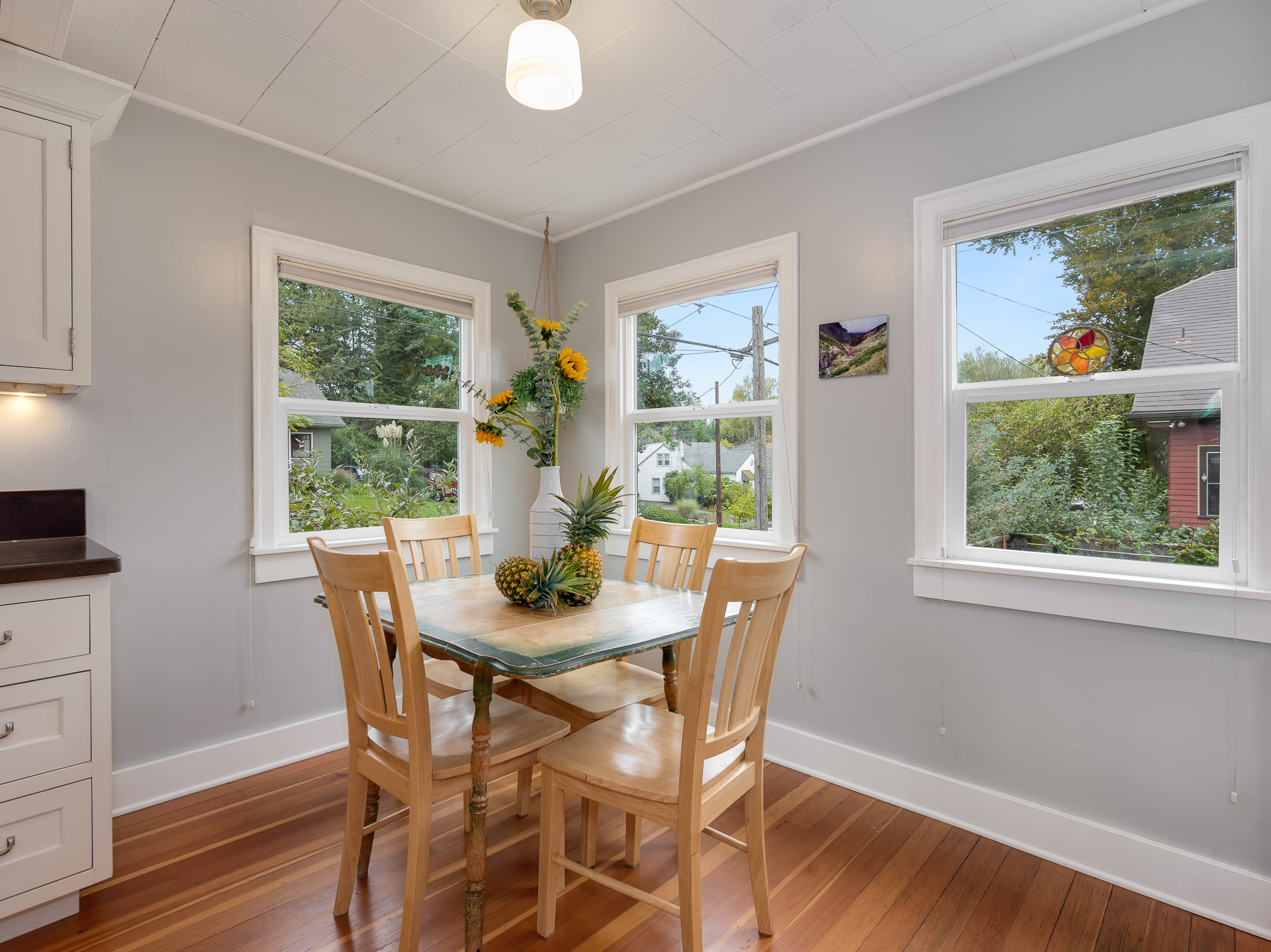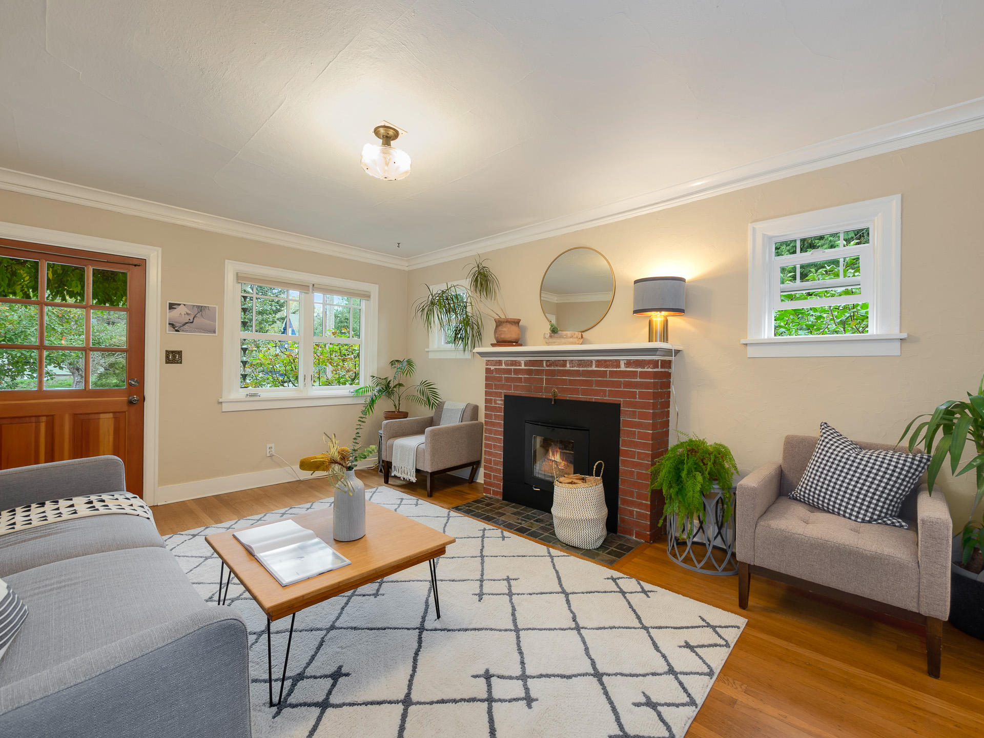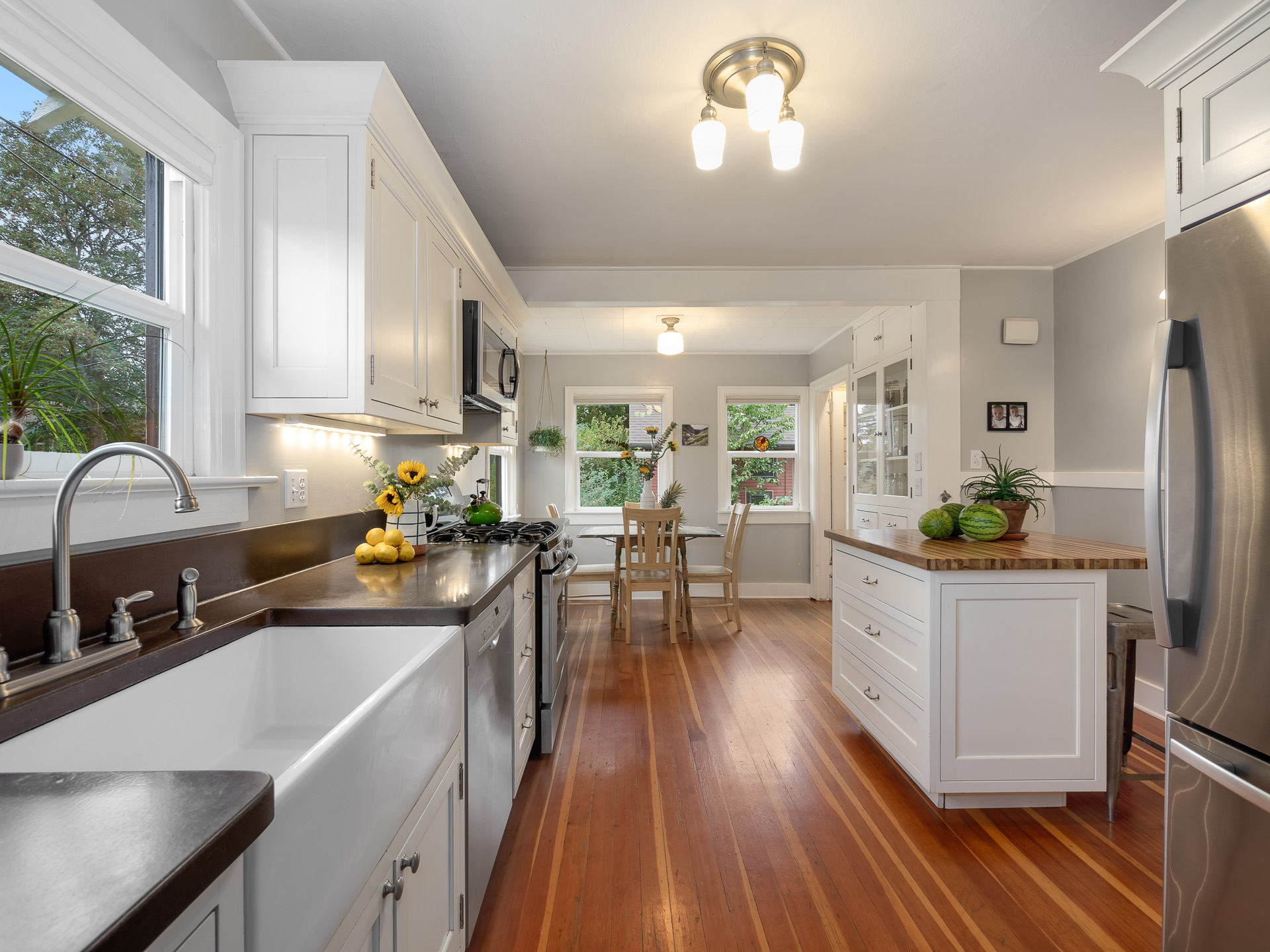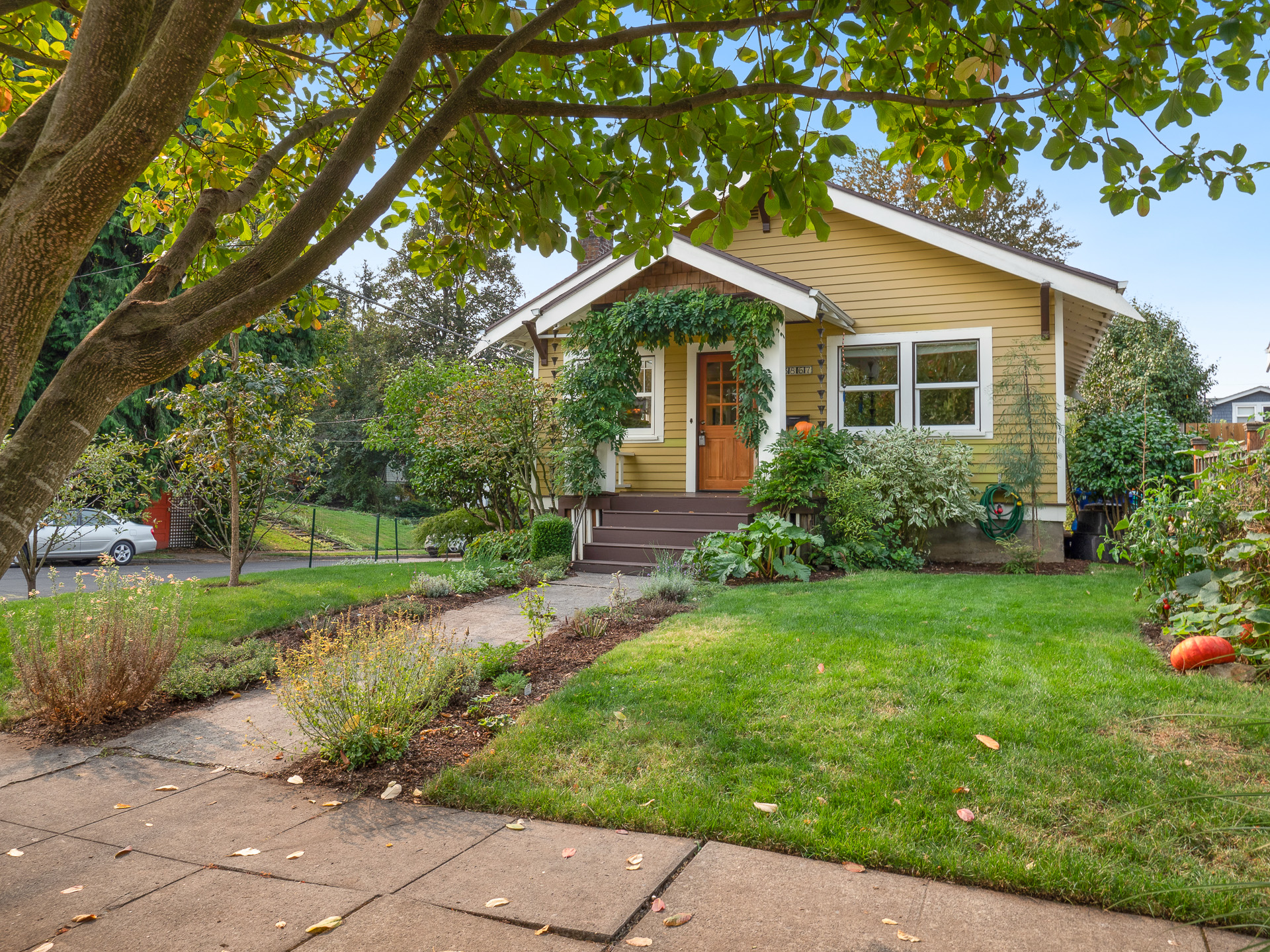 This adorable bungalow is waiting just for you. Well cared for, and nicely situated on a corner lot. Welcoming living room with excellent natural light and attractive mantel with wood burning insert. Oversized, eat-in kitchen remodeled with newer cabinets, concrete counters, farm sink, and warm fir floors. Bathroom recently updated with subway tile and storage. High ceilings in the basement offer loads of potential for a finished space. Plus walls and ceiling have been insulated to keep things cozy and warm. Beautiful yard thoughtfully planted with oodles of edibles.