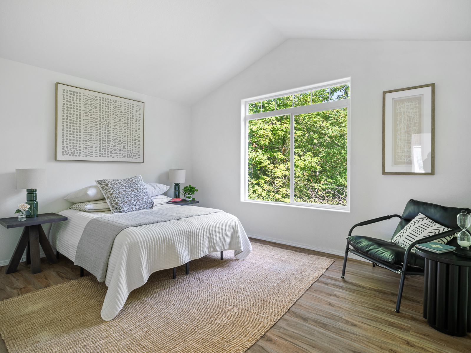 Upstairs, find a peaceful primary bedroom with ensuite bath and treetop views, plus an additional three bedrooms and full bath. Outside, there is a large deck as well as plenty of space to play in the fenced backyard.