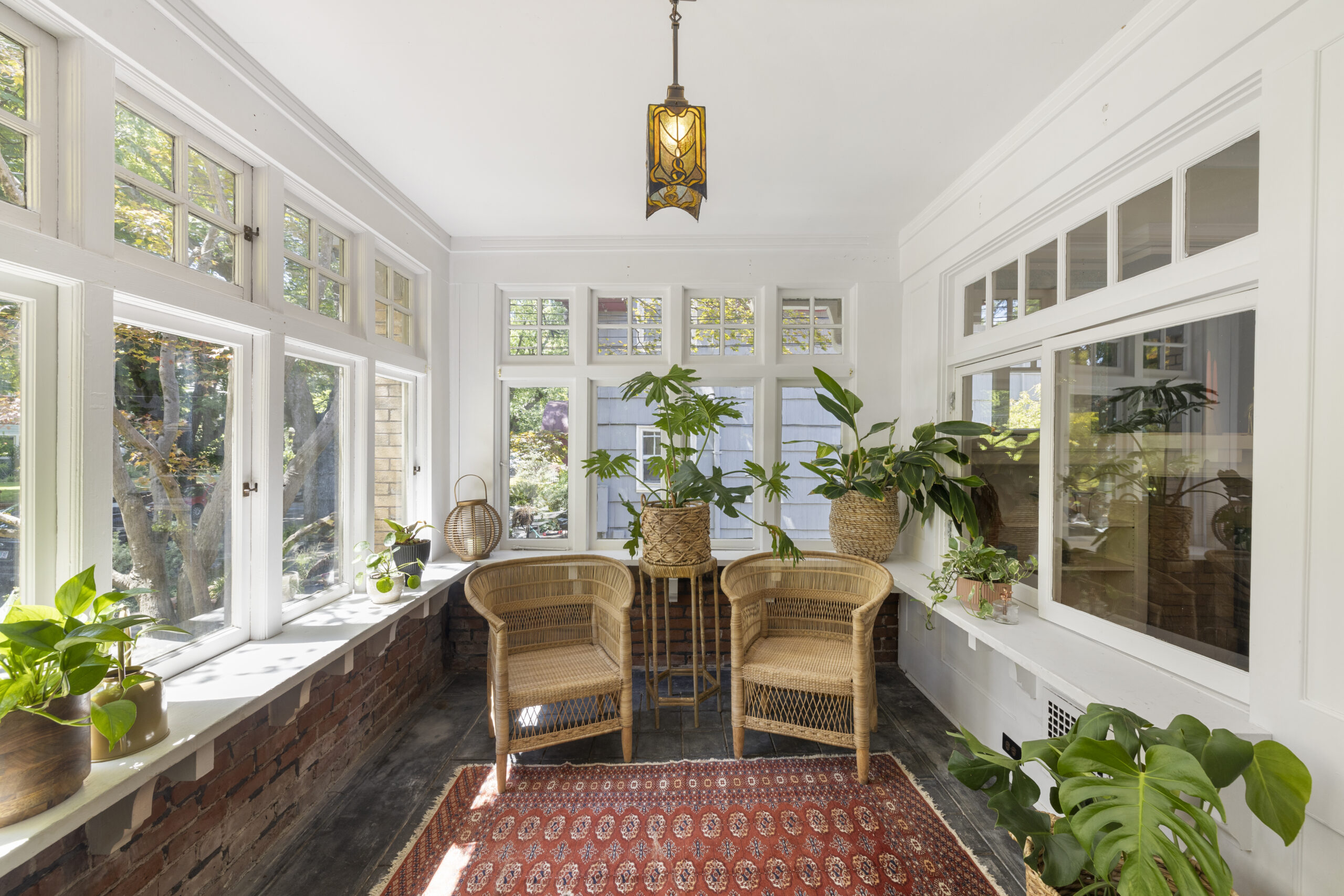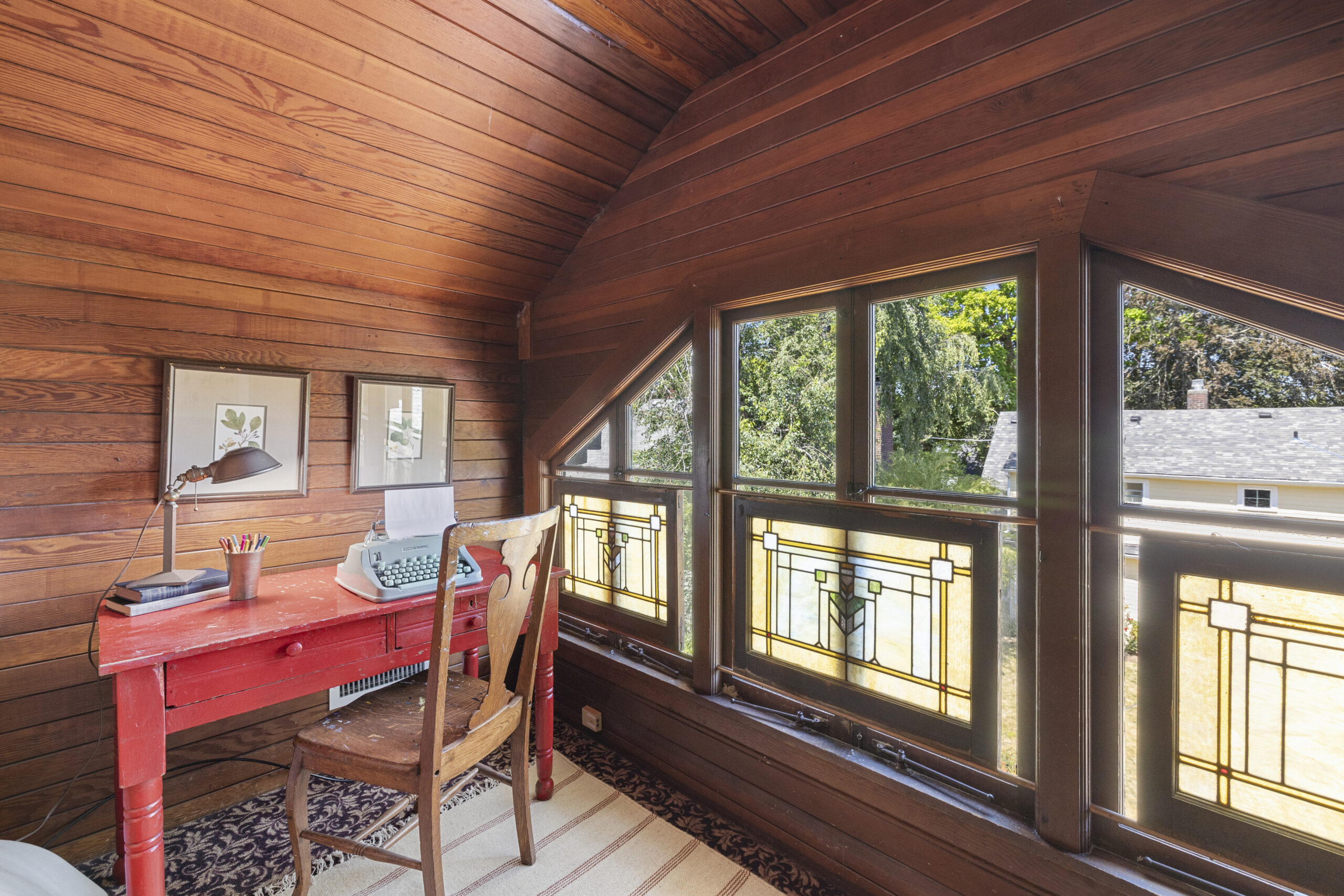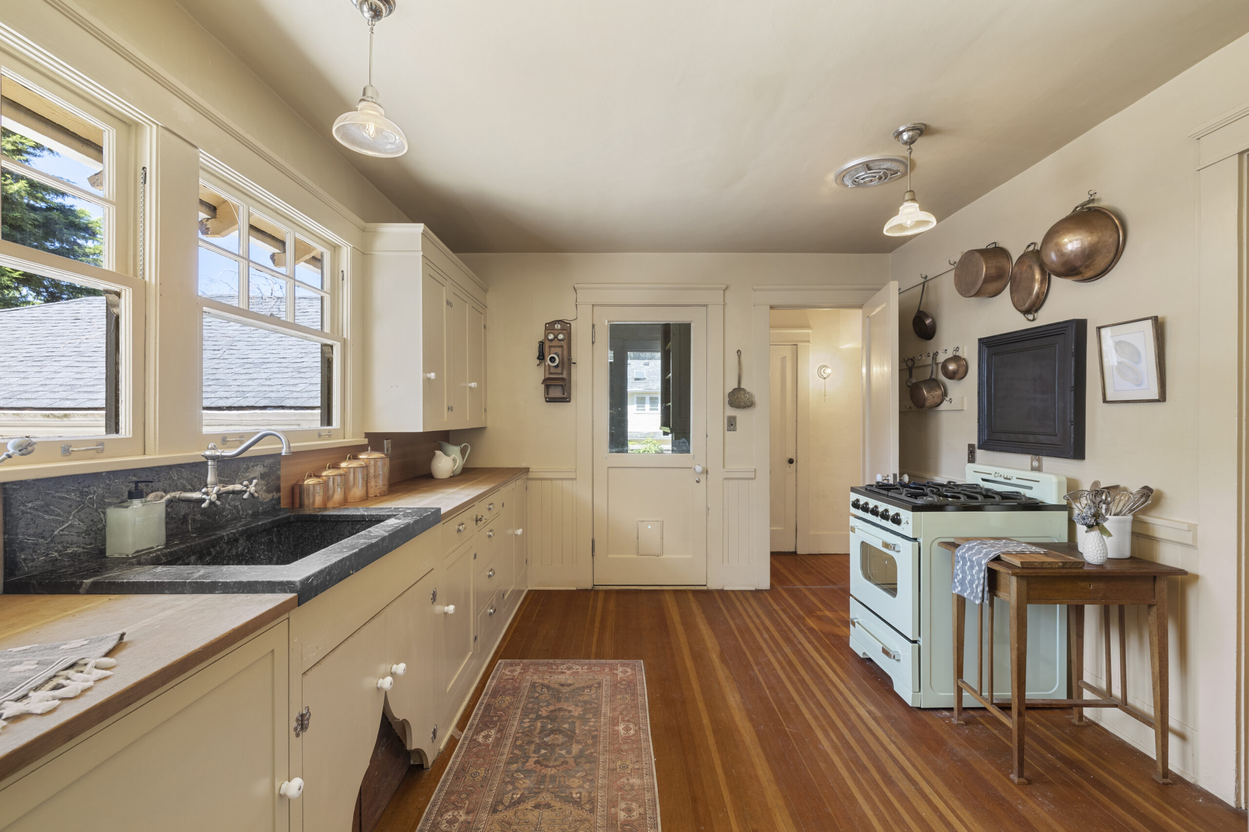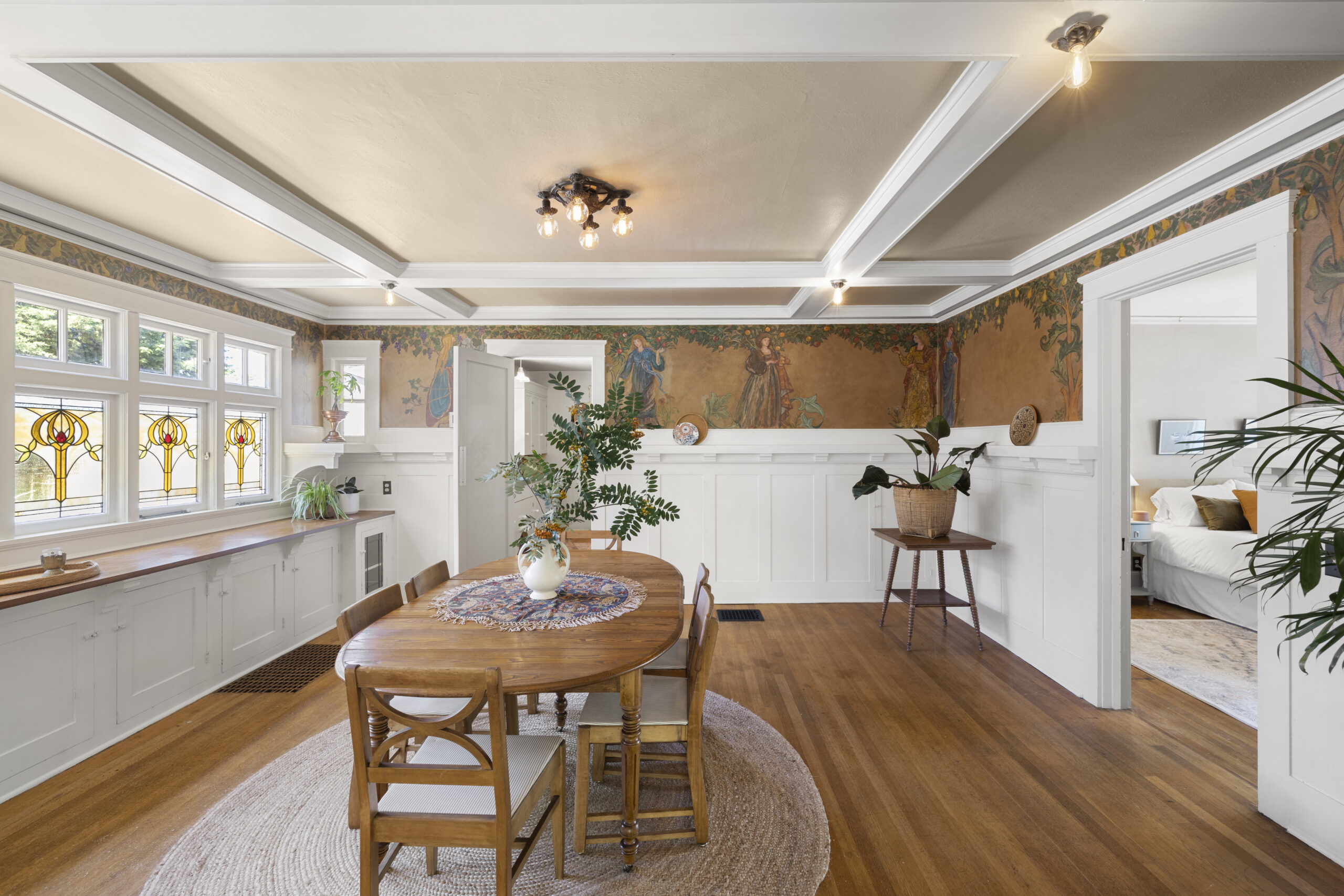 View ListingArts & Crafts bungalow brimming with preserved and embellished architectural details, including natural brick, classic half-timbers, stucco accents, and ornamental trim. Beckoning front porch leads to an enclosed botanical vestibule that even has its own spigot! Tremendous living room with expansive windows and an original brick fireplace. Frescoed dining room adorned by stained glass panels and wainscotting. Relish the exposed beams, built-in bookshelves, plate rail, picture molding, designer art wallpaper, period light fixtures, and retired dumb waiter bench seat. Vintage style kitchen with new retro range and fridge, soapstone sink, antique wall phone, and hidden dishwasher. Timeless baths. Tongue and groove office nook. Old school daylight one-bedroom apartment on lower level with separate entrance. Storage galore, patio, and garage. All in fab Laurelhurst location with easy access to the park, Belmont, Hollywood, MAX & more, yet offset from the buzz of city life.