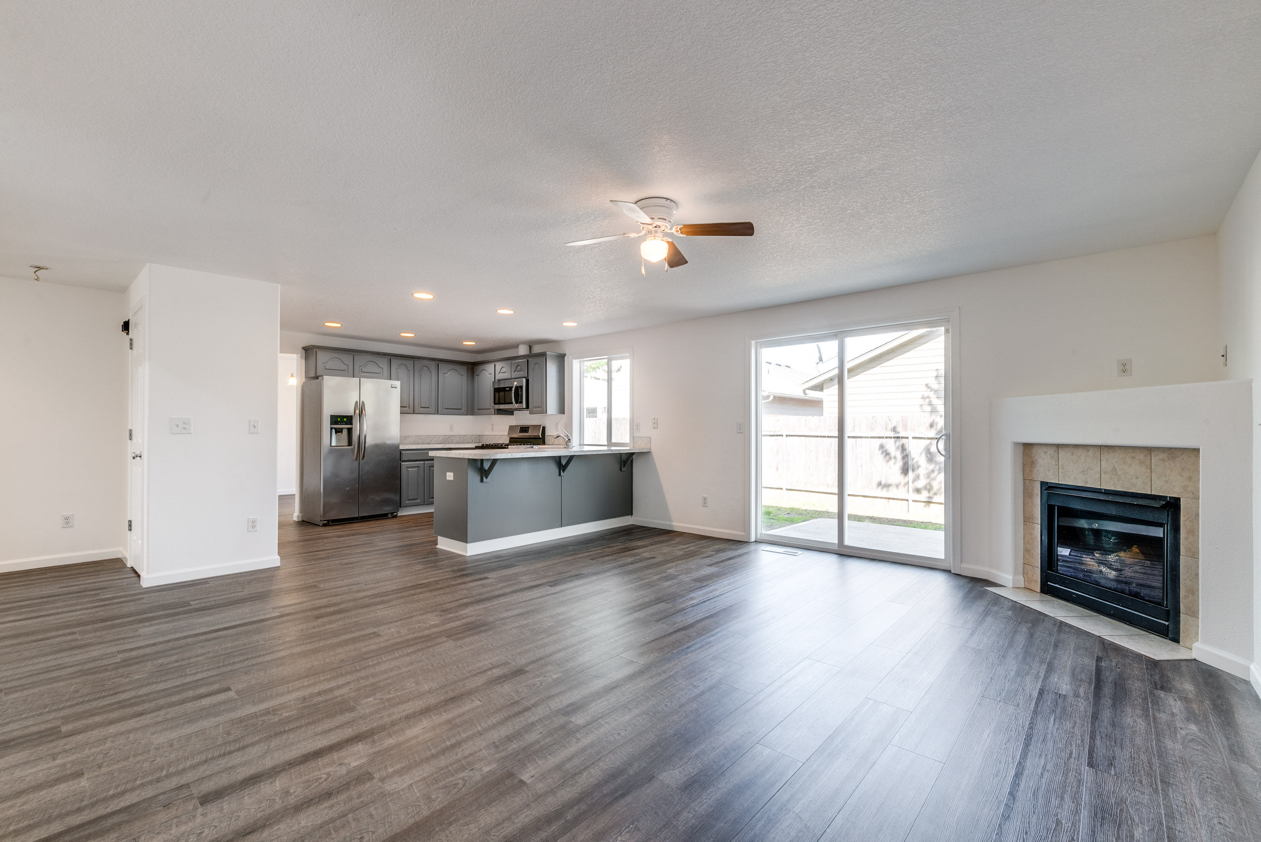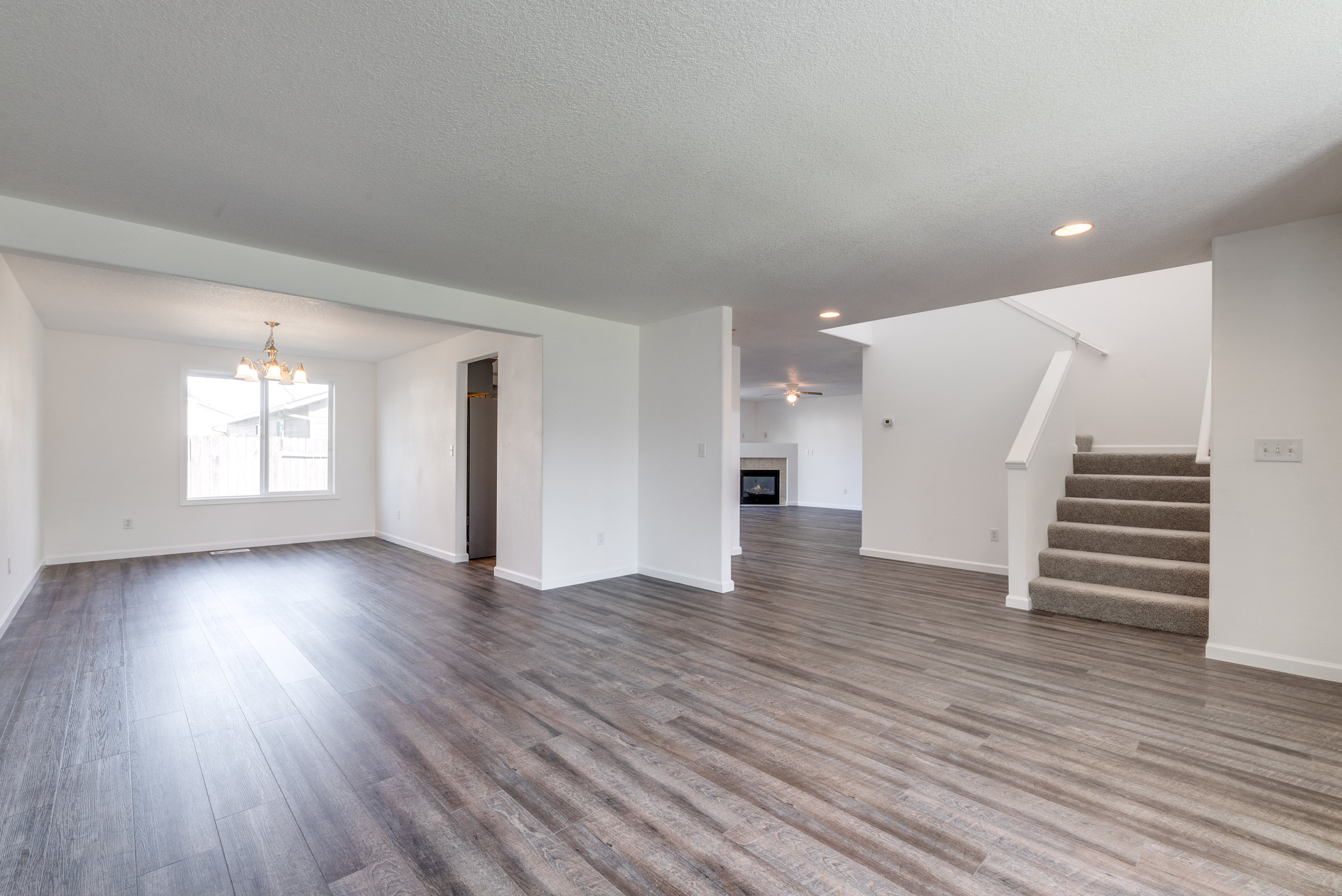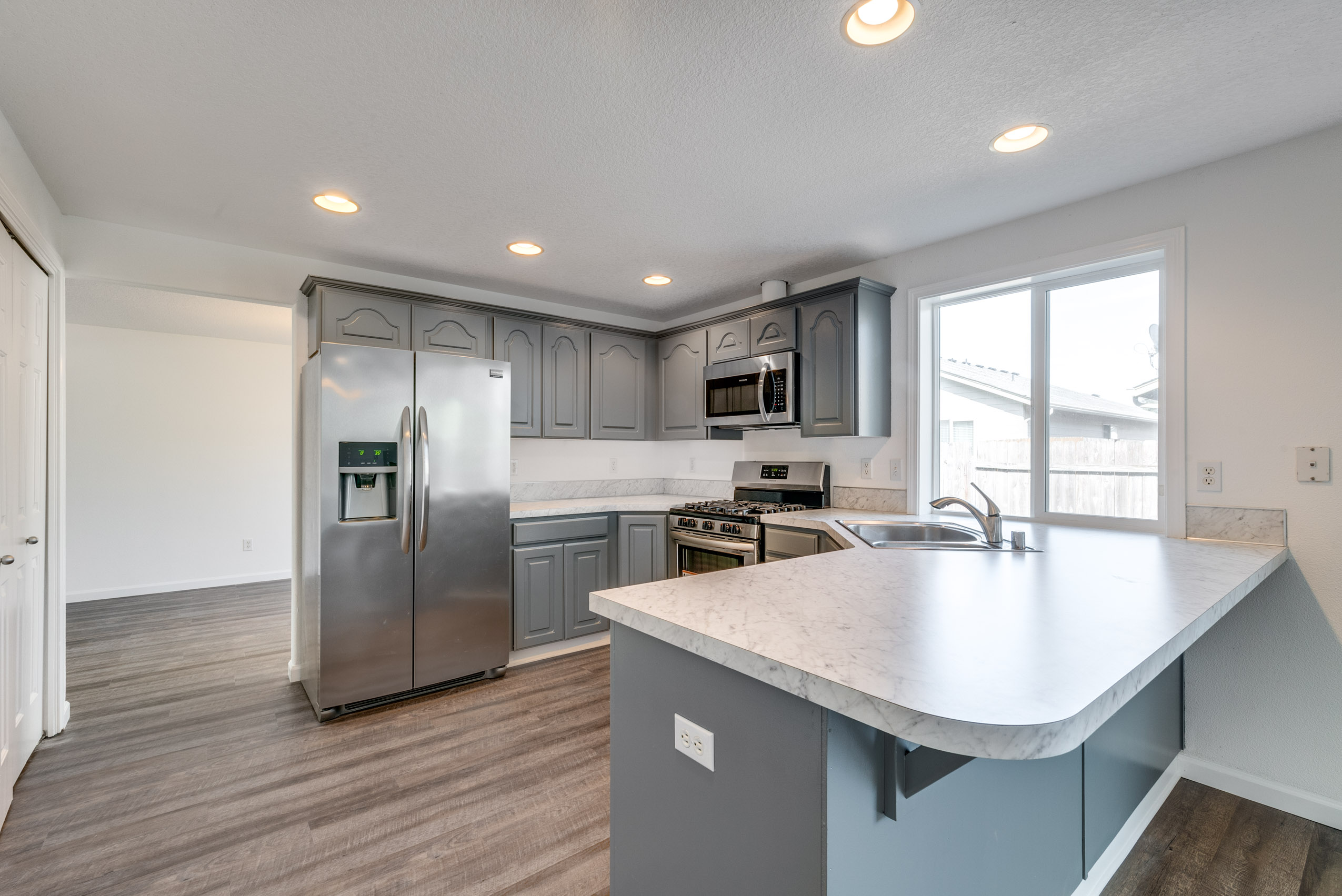 Fall in love with this spacious craftsman style home with open feeling floor plan and lots of natural light. Fresh paint, newdesigner flooring and carpet throughout. Large cooks kitchen with breakfast bar. Stainless steel appliances included; new range, new microwave, french door refrigerator, and dishwasher. Gas fireplace in the family room. Master bedroom with walk- in closet, tub, shower and dual sinks. All with convenient location.