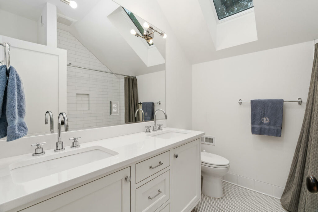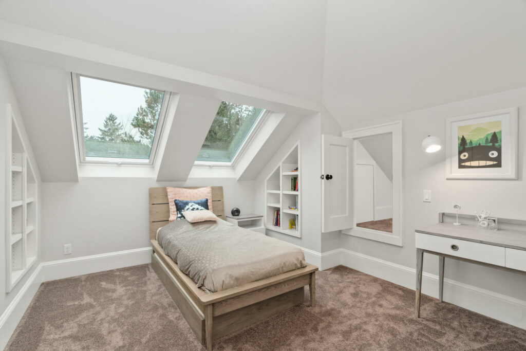 Complimenting the incredible main floor is a new second floor which the homeowners had Arnal Design Build create in 2017. It features two beautiful bedrooms, clever bonus spaces and a third full bathroom. The bathroom is home to Ann Sacks penny round tiles, Cedar and Moss light fixtures, a custom vanity with maple dove-tail drawers and high-end bath fixtures. The bedrooms have high ceilings that highlight the grand trusses originally designed into the home and include four massive Velux egress wood skylights infusing the spaces with natural light. Custom built-ins, Schoolhouse lighting and high-end millwork round out the rooms and reflect the care and stewardship of the main level.