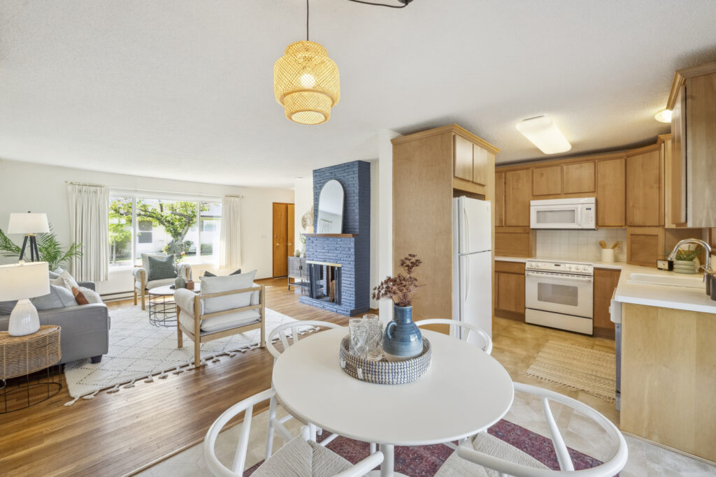 Live your best life in this 55+ condo community! This light-filled, attached-home style condo has two bedrooms, one bathroom, hardwood floors throughout, new paint, a ceiling fan, lighting, and a beautiful fireplace to relax around. Bake a pie in your kitchen that spills out to the covered deck. Private parking allows for easy delivery from the car. Go for a stroll around the estates and admire the large open lawns, visit friends at the well-appointed clubhouse with a full kitchen and library that hosts an assortment of monthly gatherings, or have people over for a swim in the pool. With a bike score of 80 and public transit nearby, get to restaurants, grocery, parks, shops, cafes, and around the city with ease.