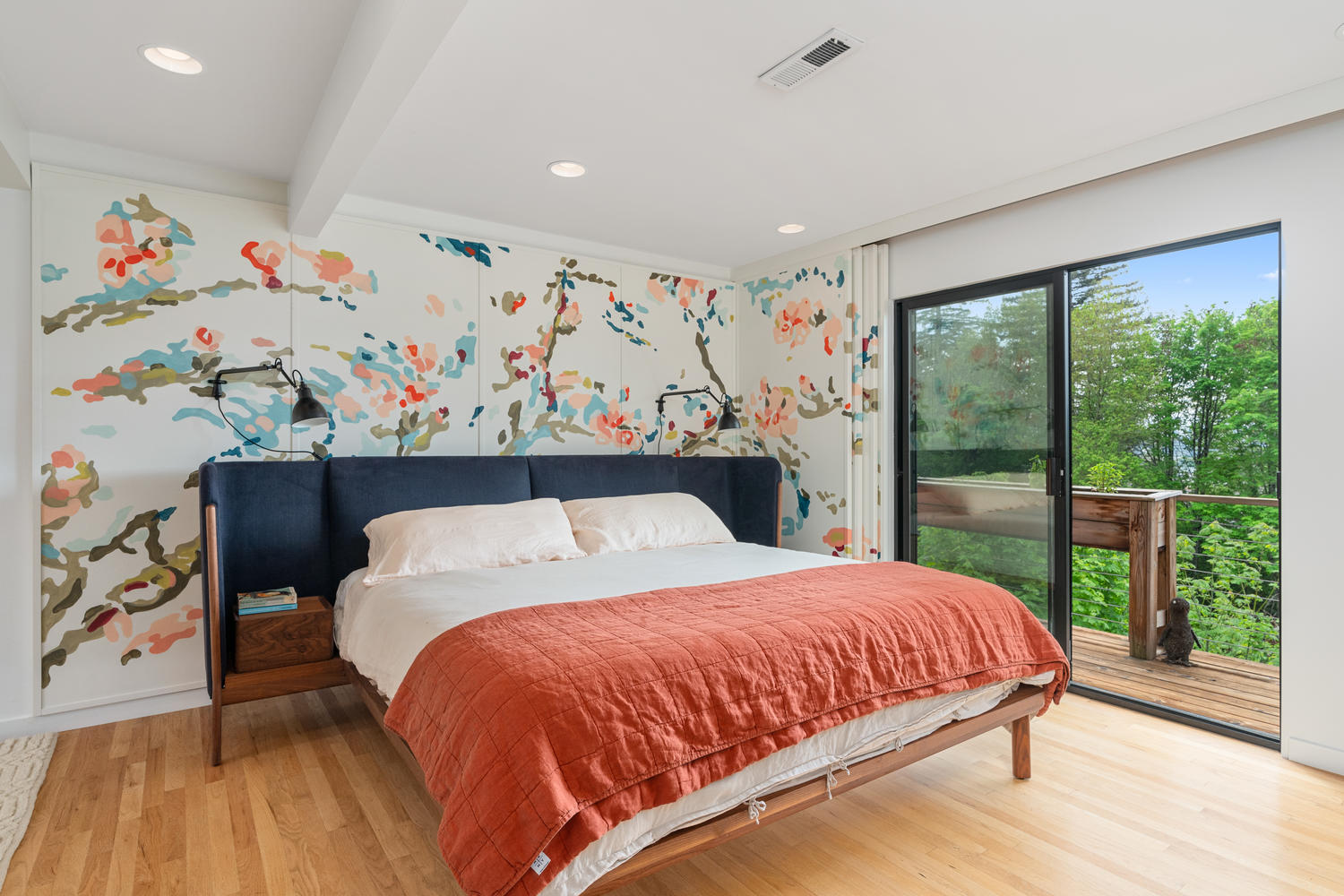 The main level is rounded out by 2 bedrooms and 2 full bathrooms. The master suite features a hand painted mural inspired by Van Gogh that extends from the wall into a paneled door covering. The en suite bathroom is luxurious in both its fit, finish, and layout.
