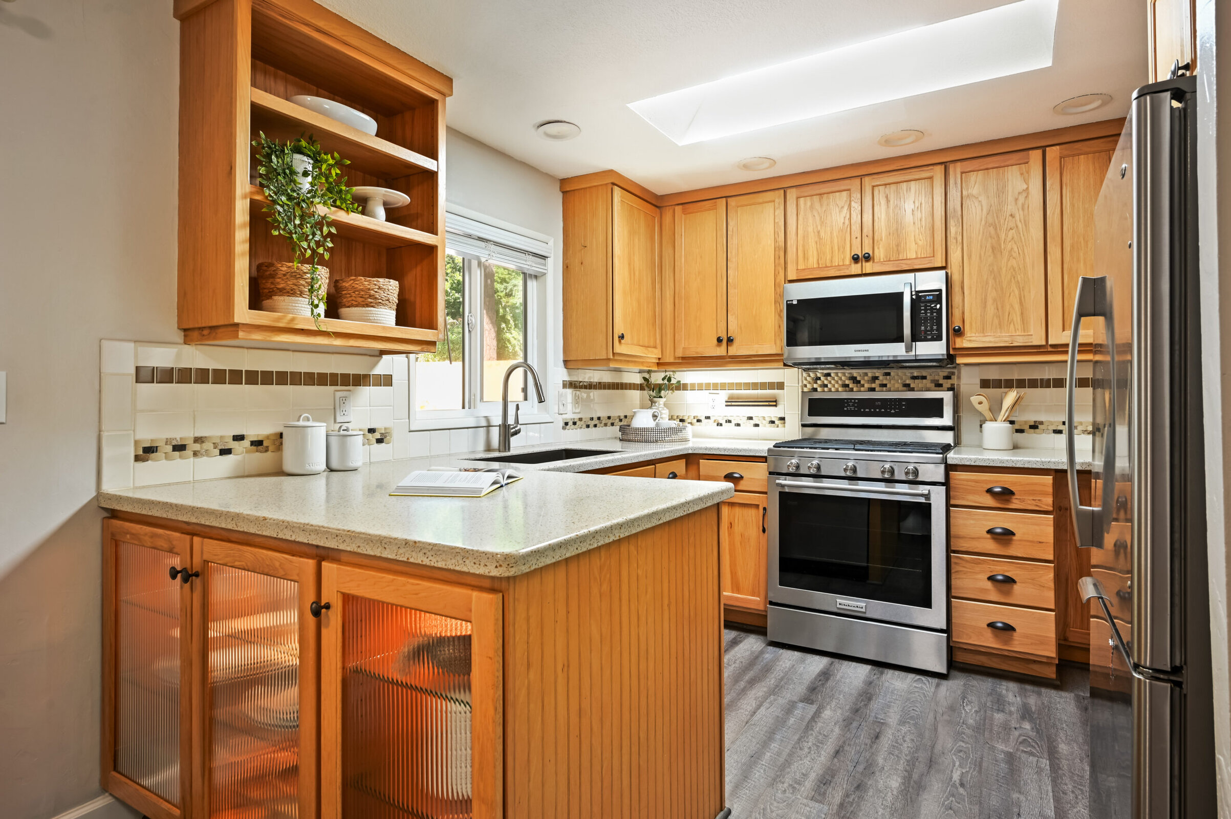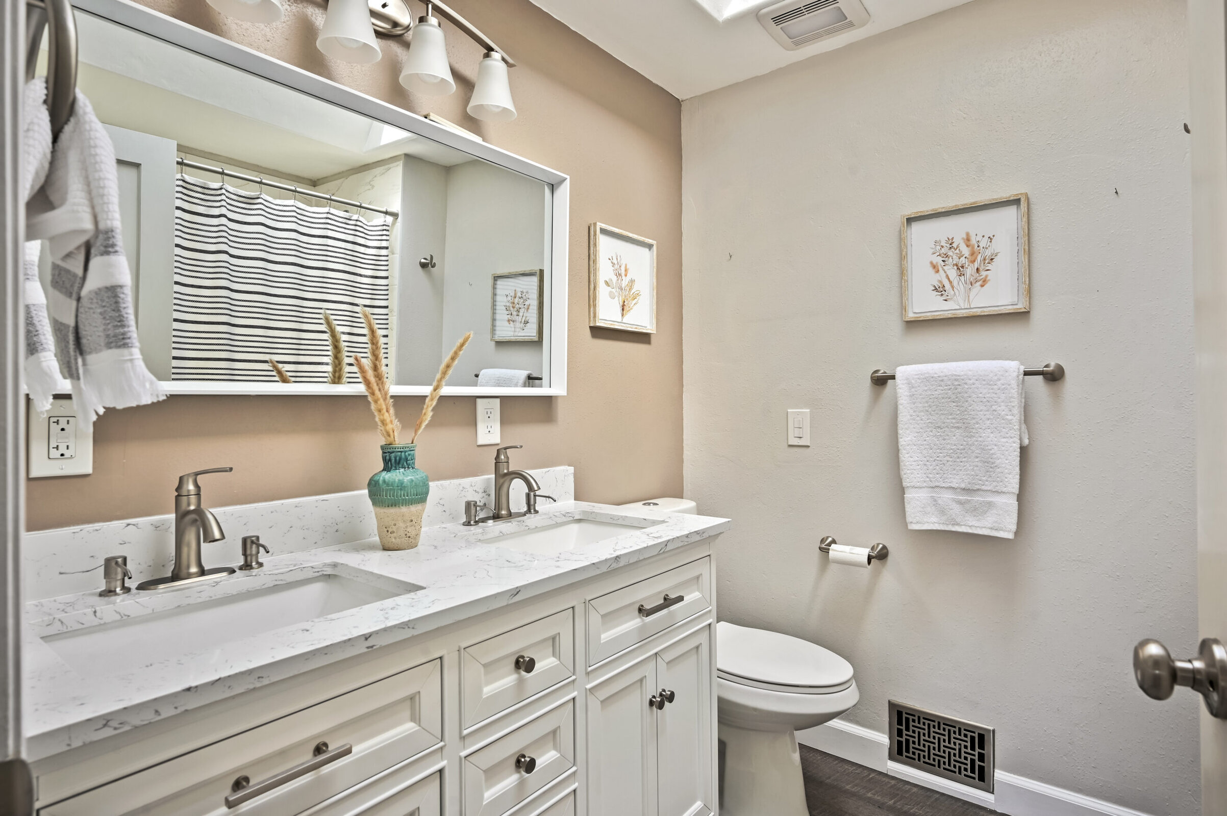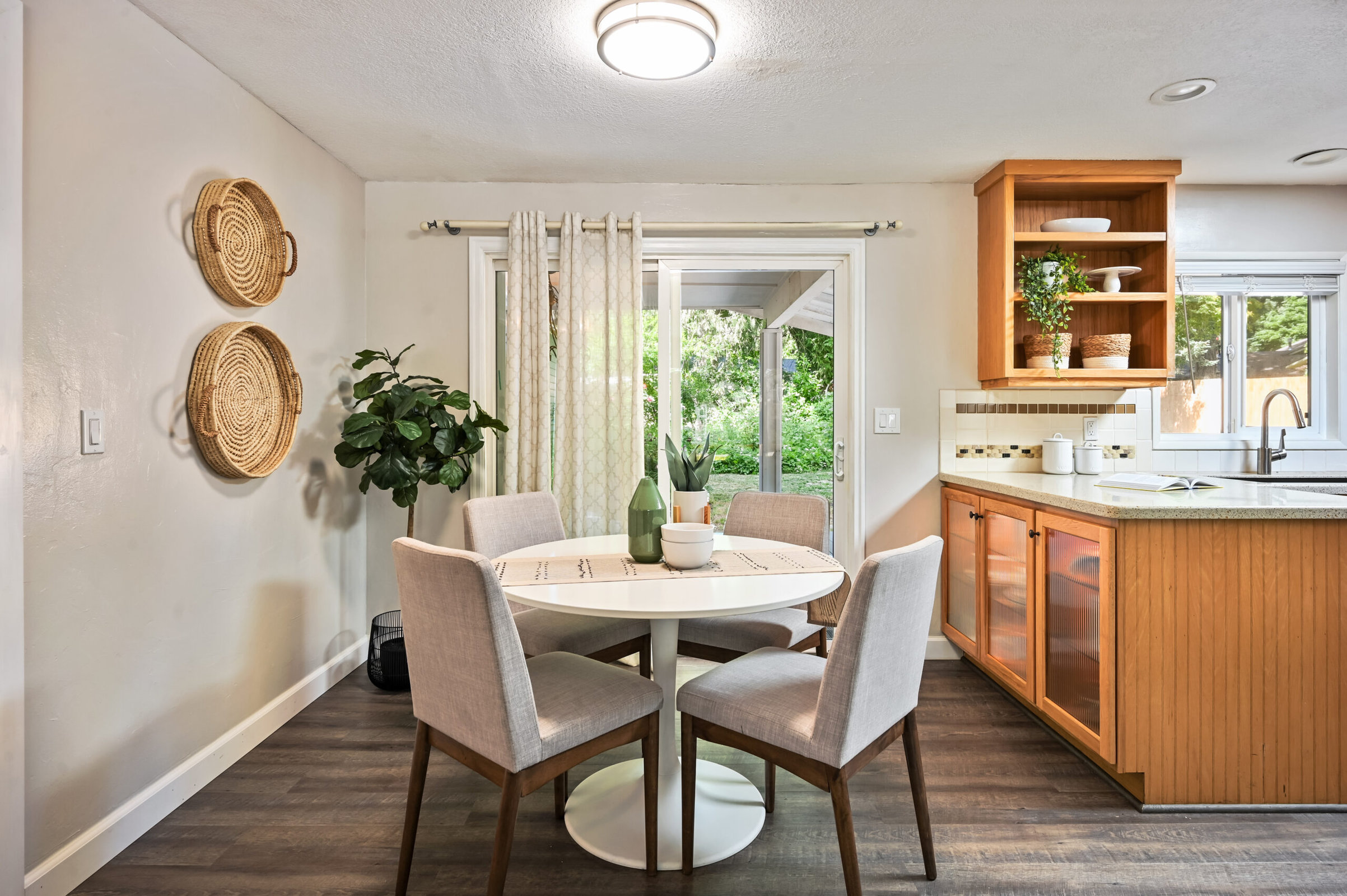 This beautifully updated 3 bed/1.5 bath house seamlessly blends modern elements with classic charm. Inside, you’ll discover an inviting living space filled with natural light and an open floor plan that highlights all the right places. The heart of this home lies in the contemporary kitchen, featuring sleek countertops, ample storage space, a new microwave, and an adjacent dining area. Off the dining area is a large (bonus?) living room – perfect for entertaining, work-from-home, or an extension for formal dining. The primary bedroom offers a tranquil retreat with an ensuite bathroom and direct access to the backyard. Two additional well-appointed bedrooms provide plenty of space for loved ones and guests. The full bath includes a double vanity, a new skylight, and modern fixtures.