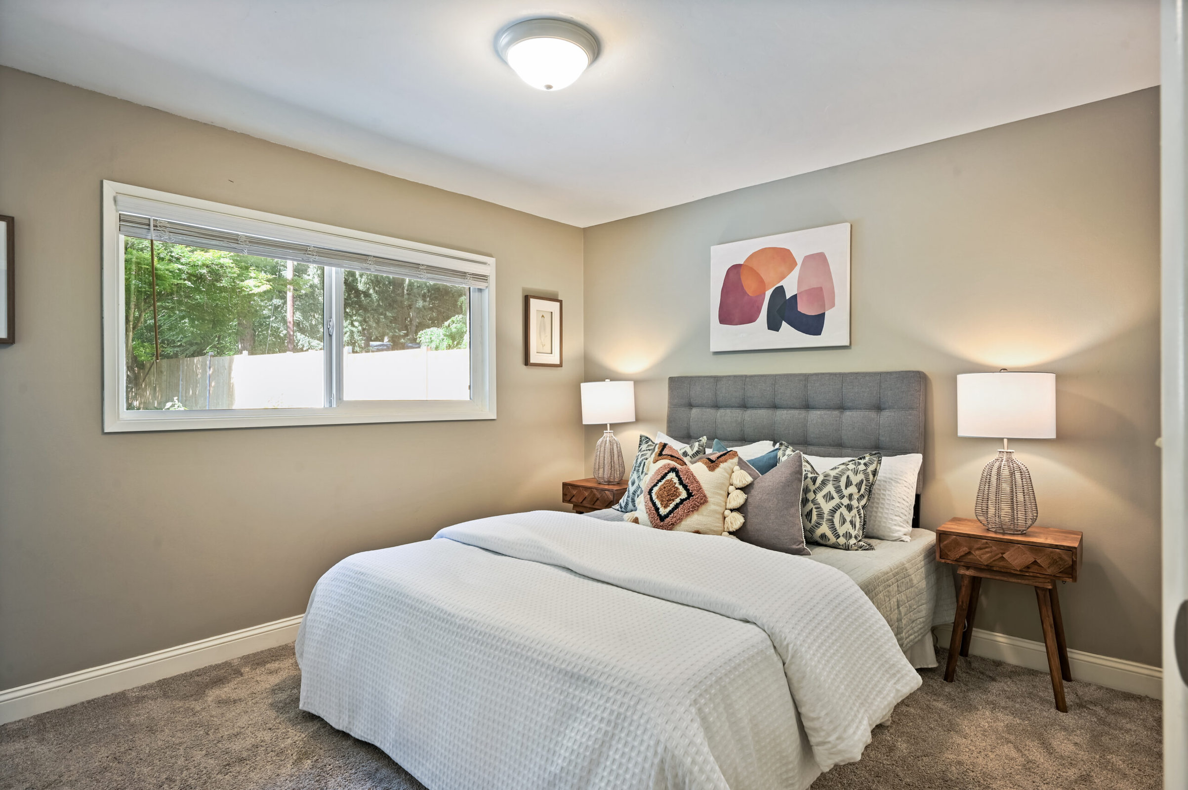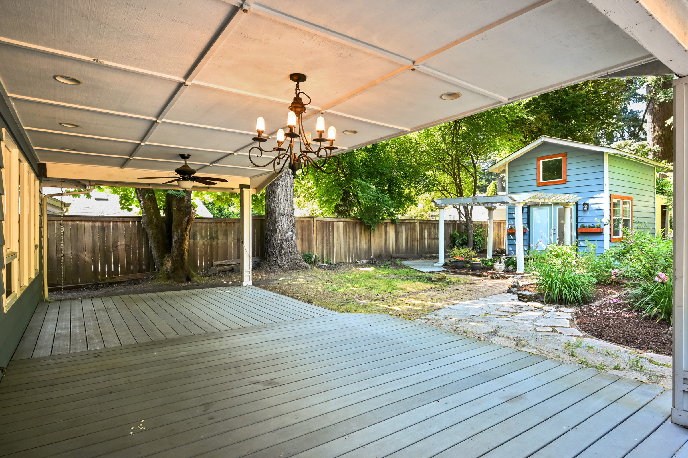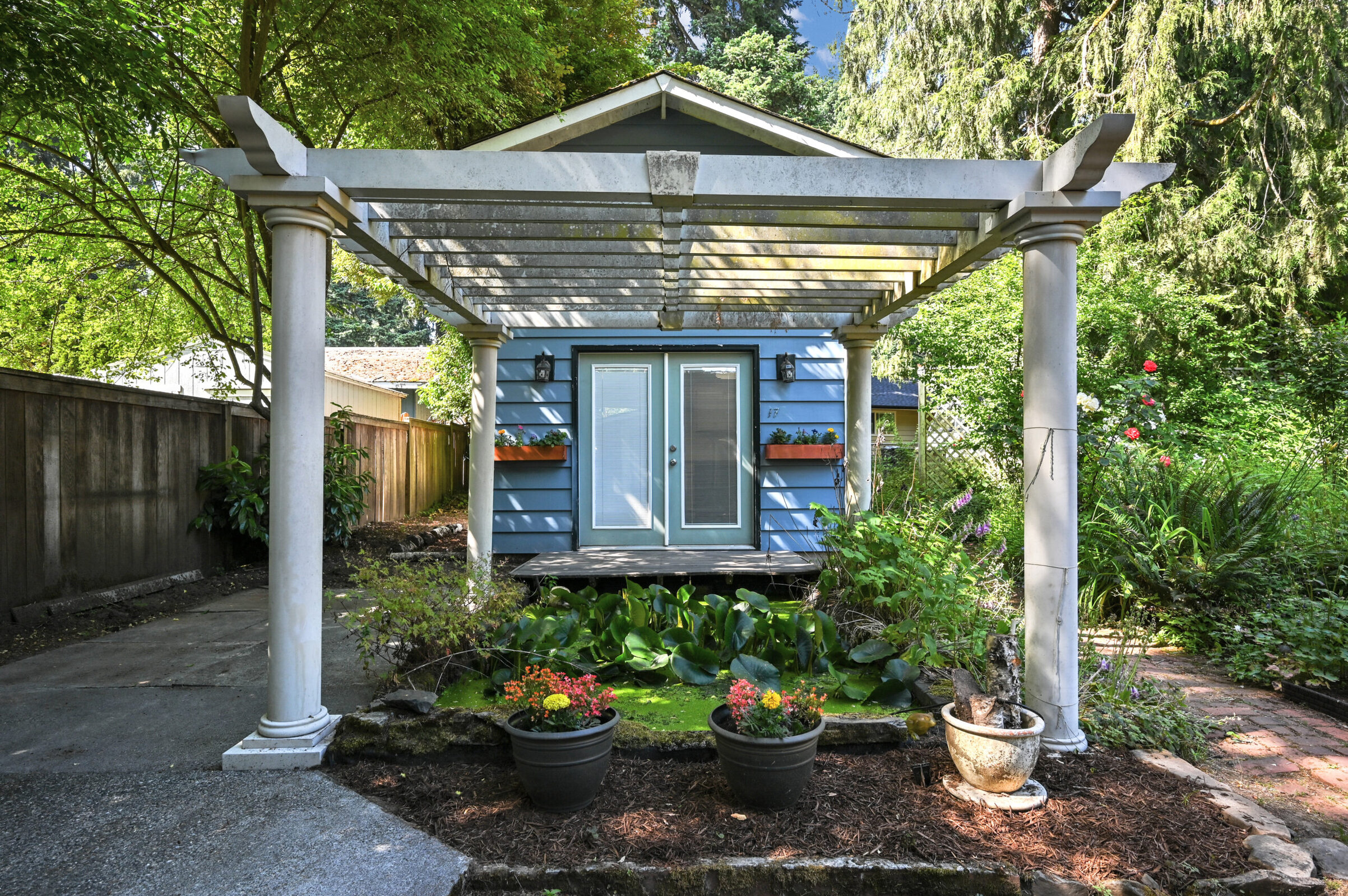 The entire home has been meticulously updated with new carpet and luxury vinyl plank flooring throughout, a new 40-year roof, a new water heater installed just two months ago, and fresh interior and exterior paint. Step outside onto the covered back deck, the perfect spot to relax and unwind while enjoying views of the peaceful pond, pergola, and an adorable detached studio. This studio features a loft, storage, electric, new flooring, and paint in an additional 242 sqft – perfect for a home office, art studio, or potential accessory dwelling unit (ADU.)