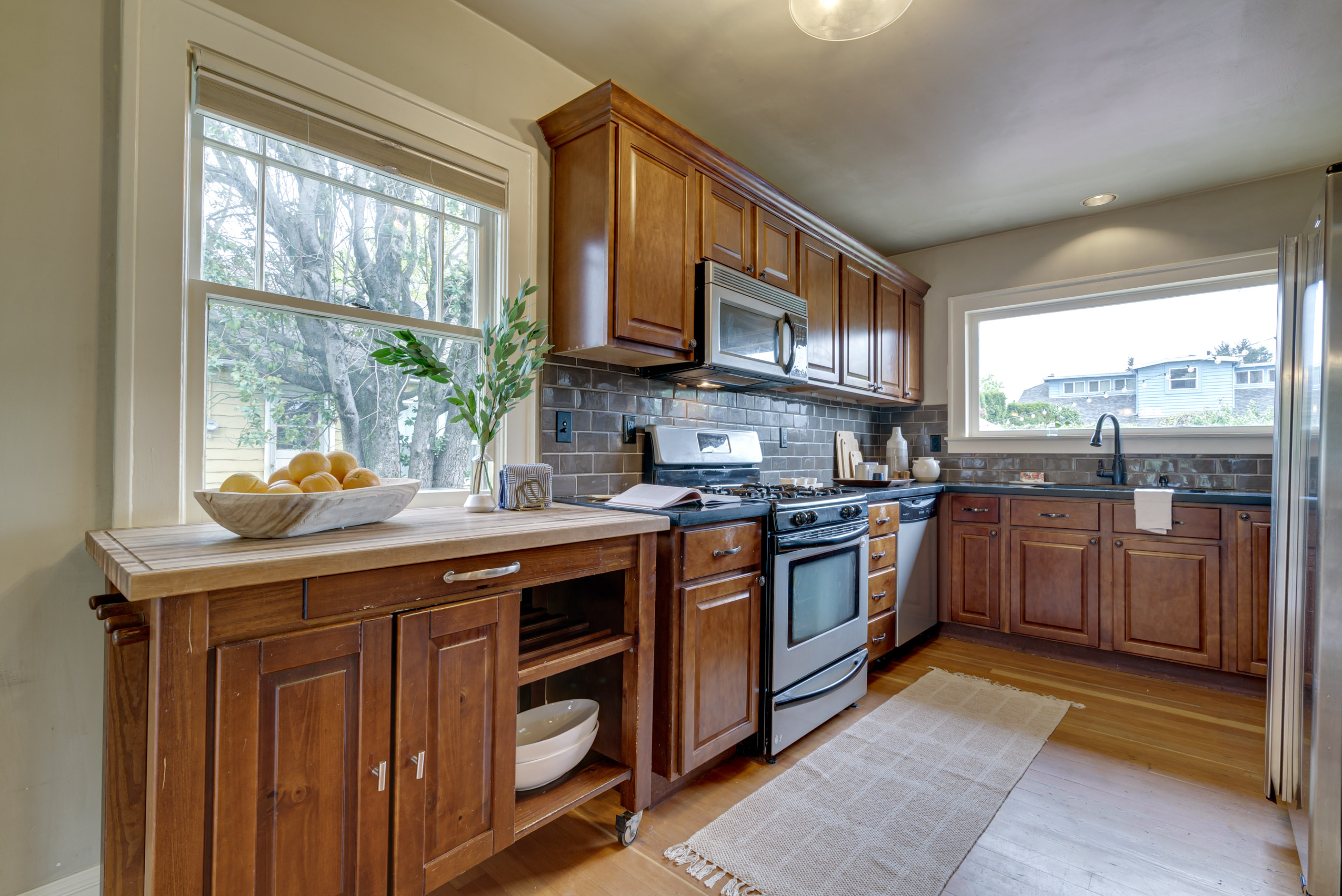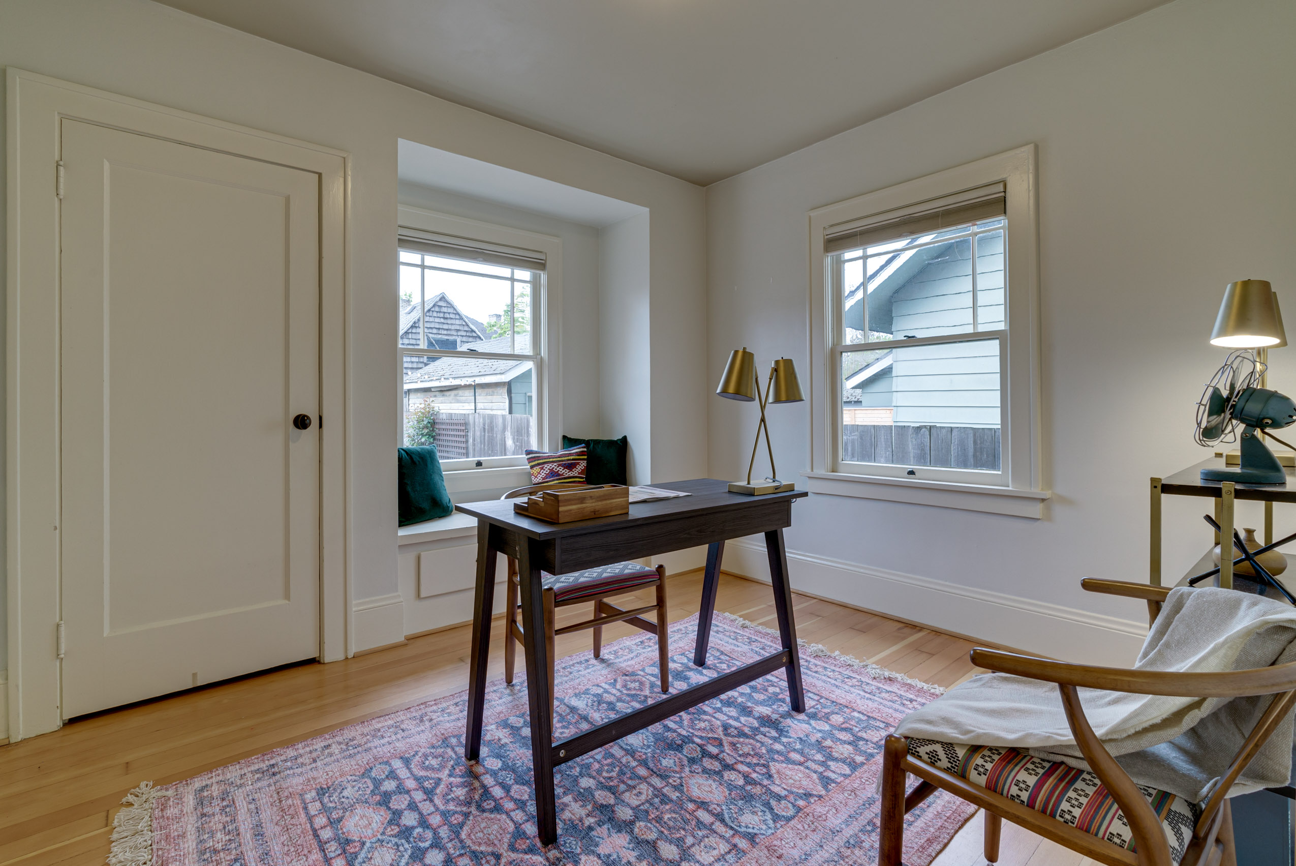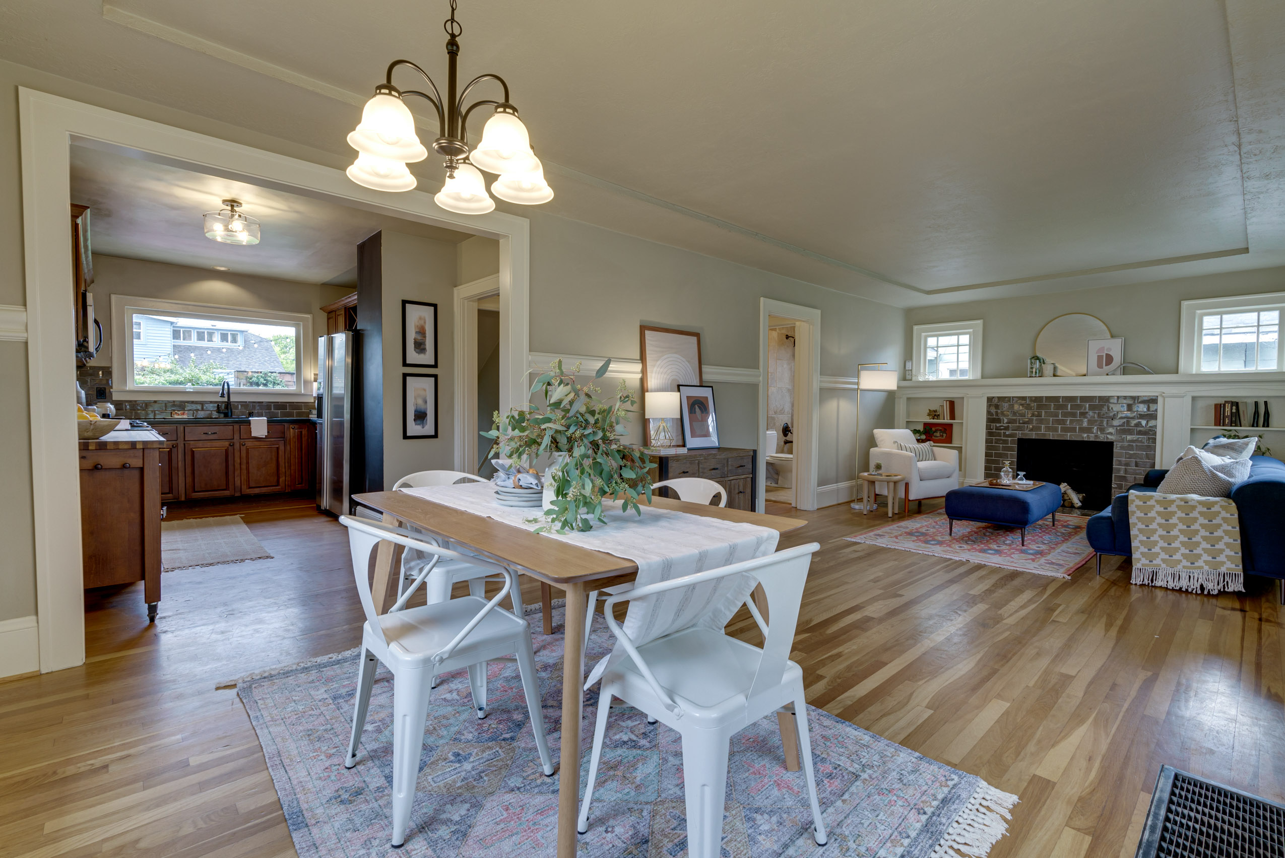 LOCATION! A stone’s throw from multiple coffee shops, taverns, restaurants, yoga studio, New Seasons, Max stop, library, & more! This classic updated bungalow has open living space with a fireplace and dining area that flows to the large kitchen with a huge window looking out to the private south-facing backyard. Two bedrooms upstairs with bath & third bedroom/office on the main & another full bath with heated floors. Check out the cozy finished basement! Garage with electric – office, shop?