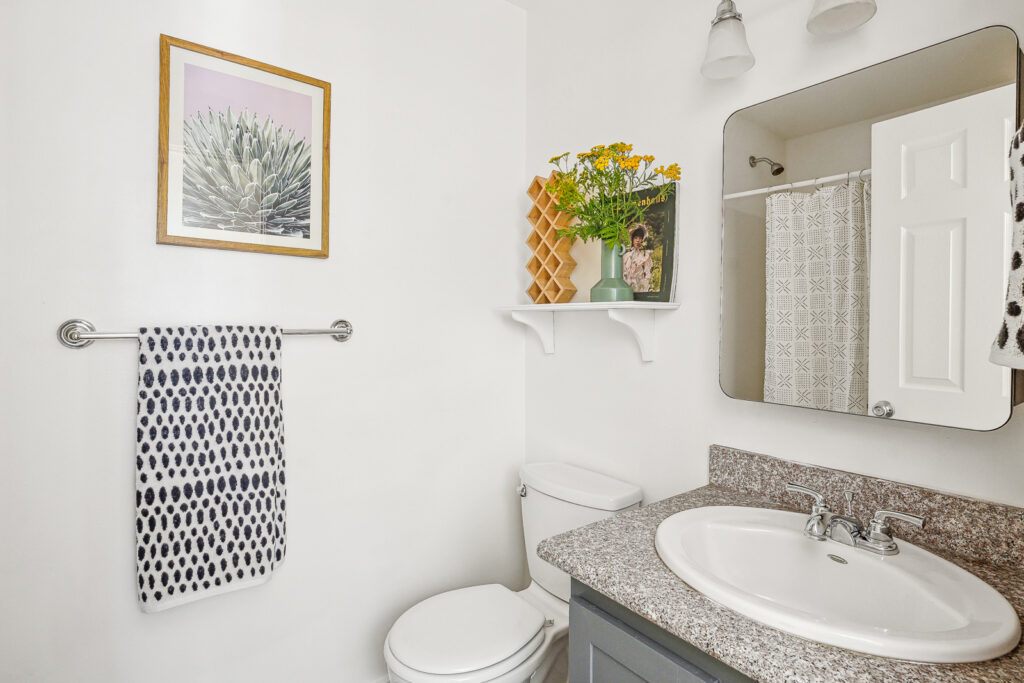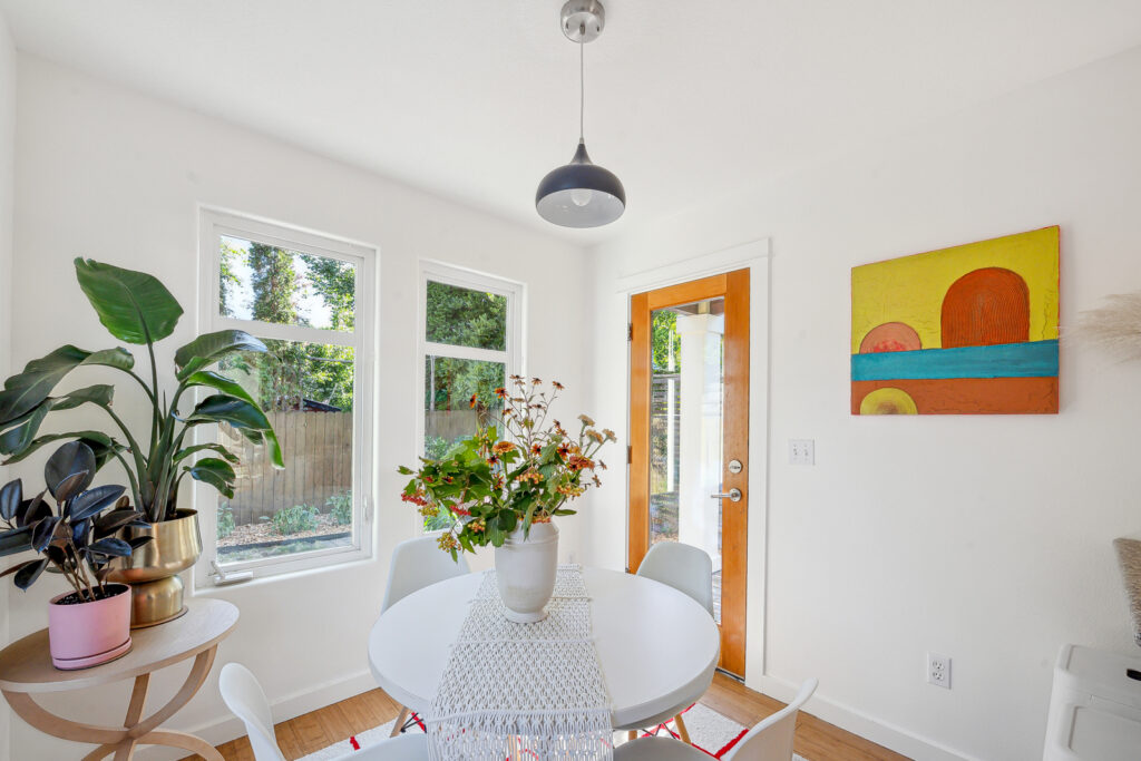 Every inch of space here is well-utilized: the main floor features an open-concept living and dining space, a roomy kitchen with eat-in nook, a half bath, and a bonus room with laundry that could be used as a fourth bedroom, office, media room, home gym, or art studio.