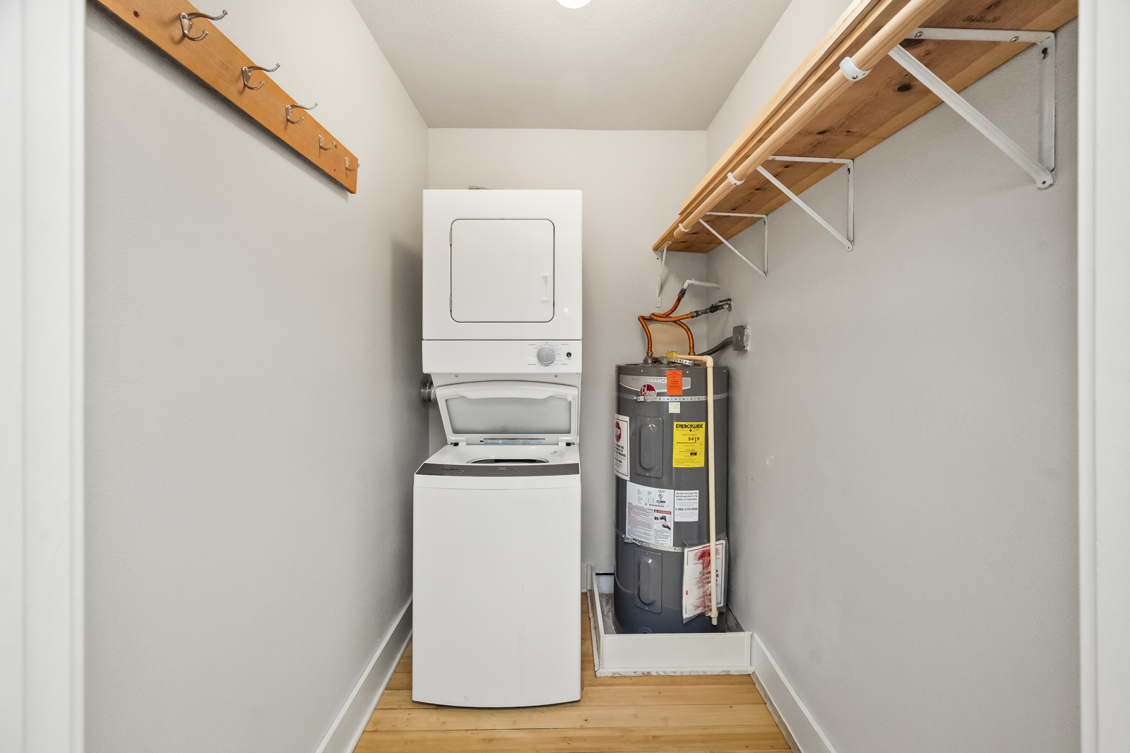 The efficient floor plan lives much larger than its size and features bamboo floors, big sunny windows, and plenty of space to entertain. There is a roomy bath with extra storage and a soaking tub, and an oversized bedroom with laundry conveniently tucked into the closet. Have your morning coffee on your own private Trex deck surrounded by greenery- it’s the only one in this complex! Complete with its own parking space and secure front entrance, this is an excellent property to lock and leave when you’re adventuring in other locales, or a wonderful home to enjoy all year long.