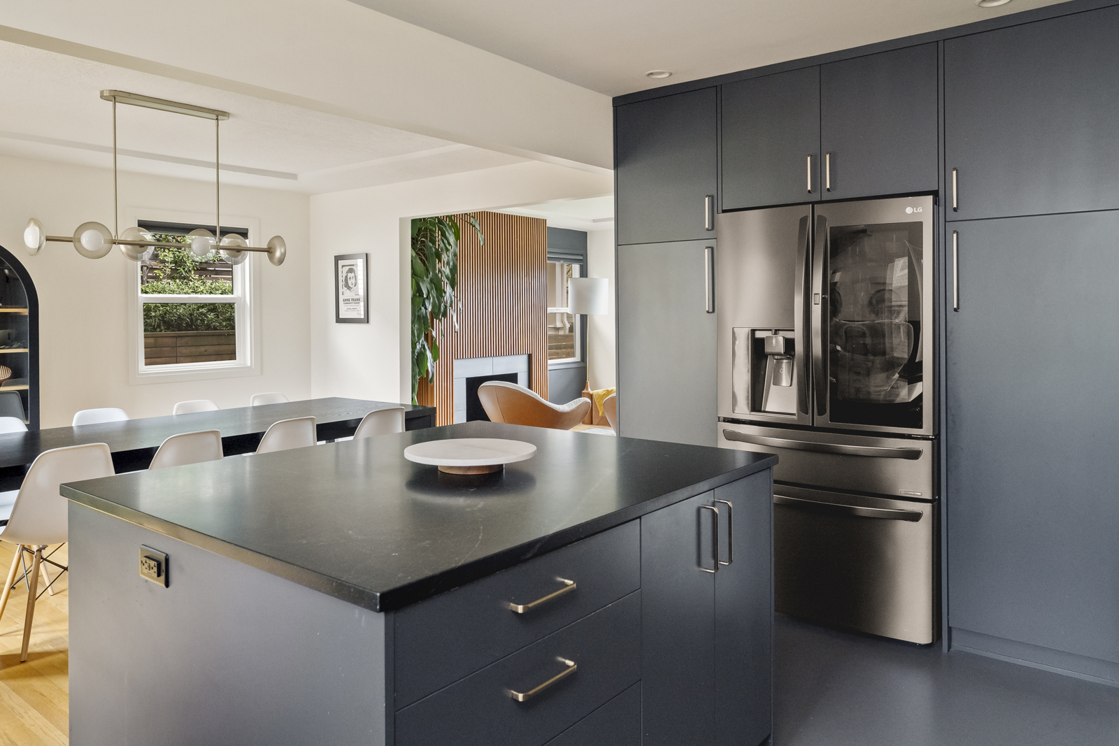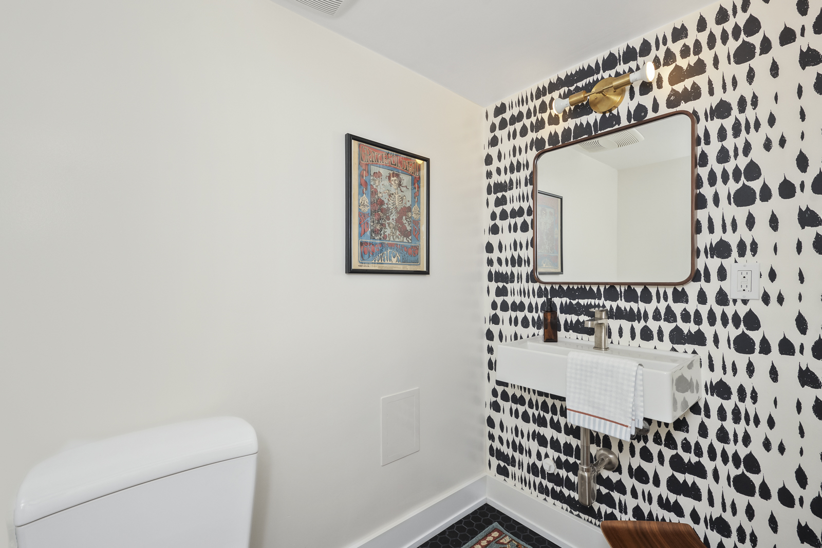 Relax in the downstairs family room with new carpet, cozy fireplace, beverage station, custom white oak TV inset with sound bar, half bath with fun Schumacher wallpaper, and ample storage. The rare, extra deep tuck-under garage with epoxy floors and direct connection to the family room is a treat to park in on rainy days.