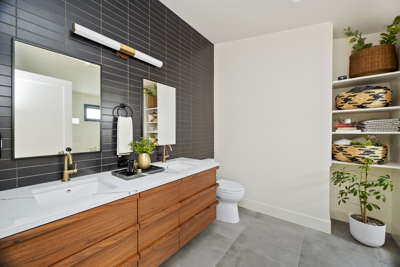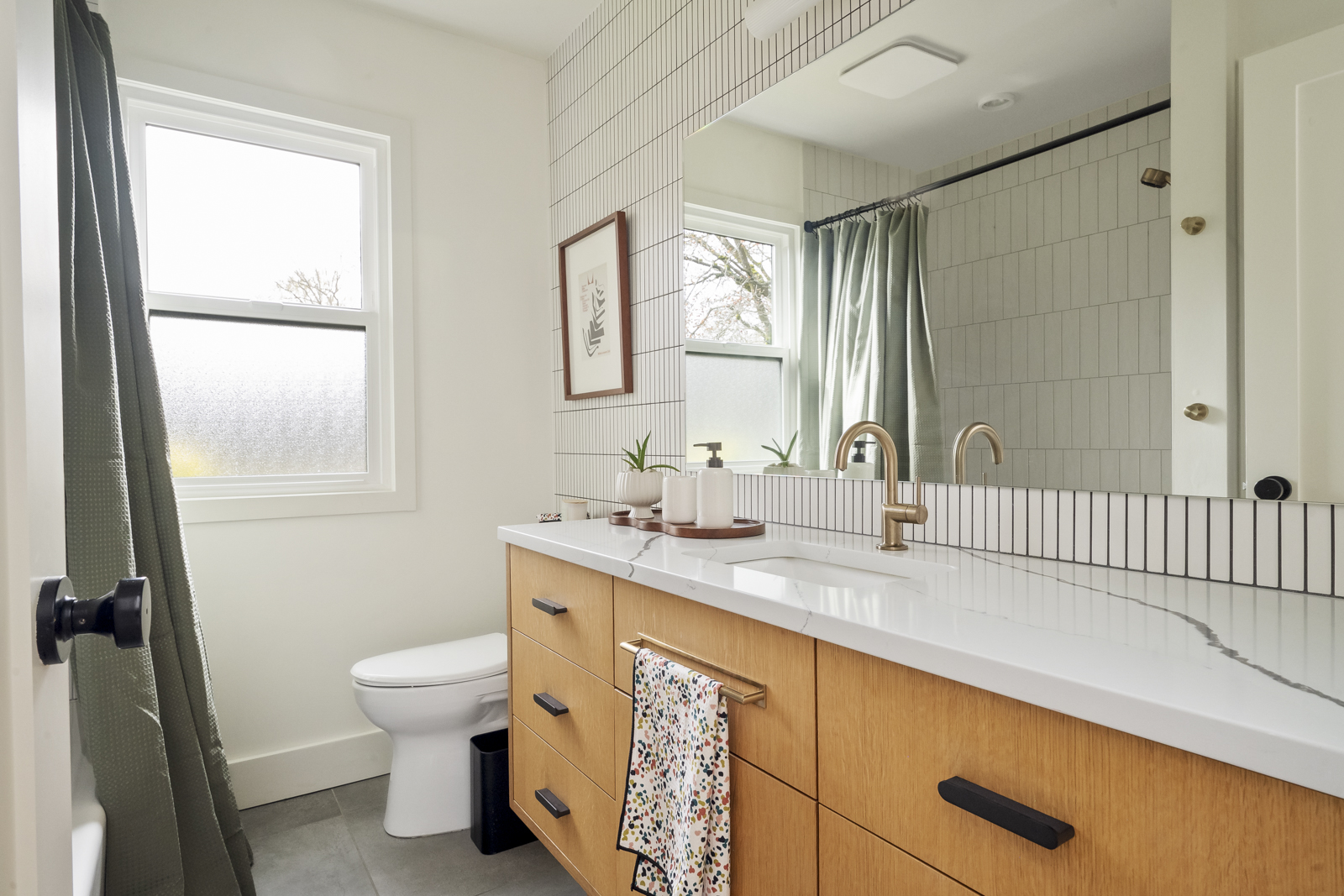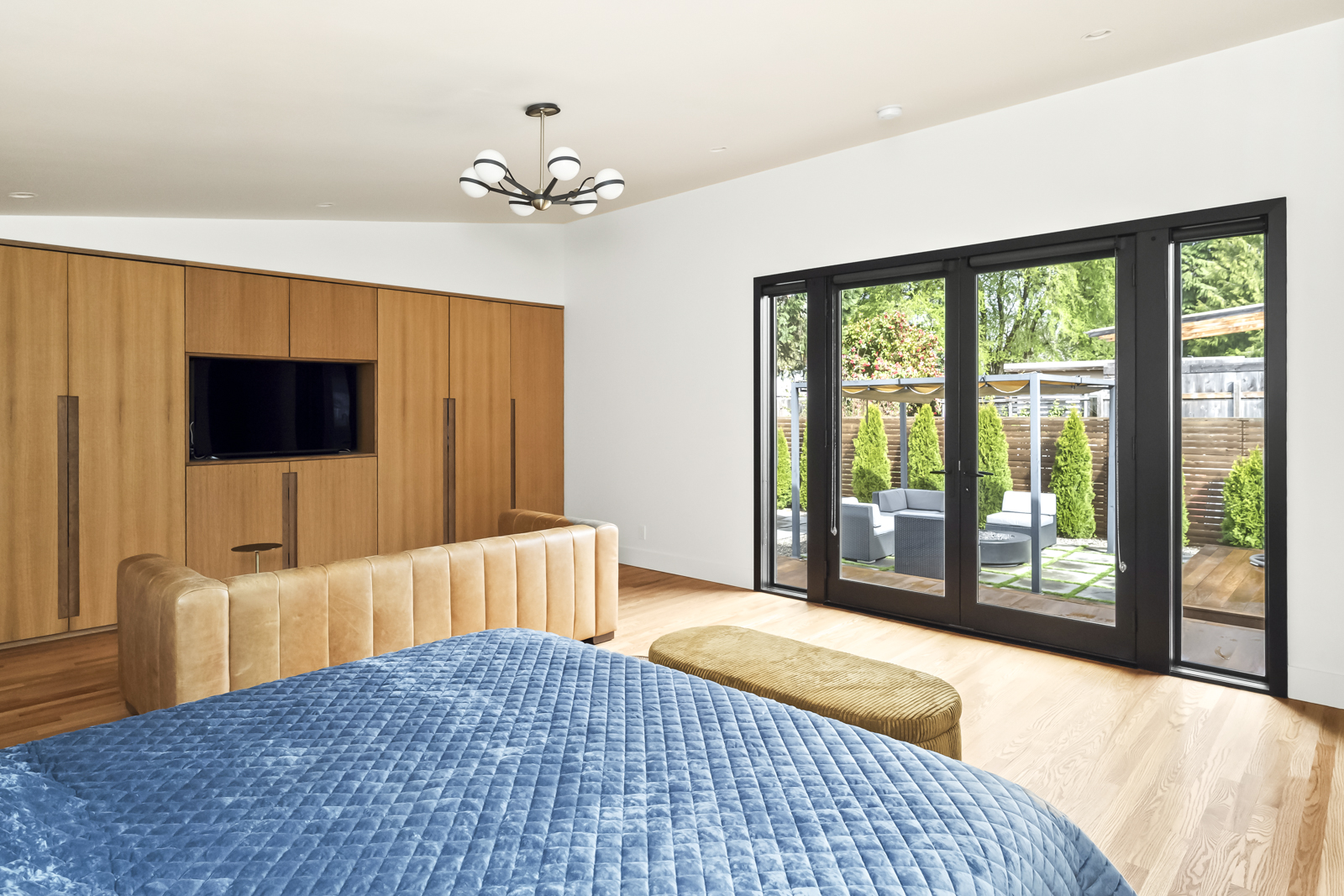 On the main floor, there are two bedrooms and a beautifully renovated hall bathroom featuring a custom vanity and floor to ceiling tile, plus a spectacular primary suite addition: unwind at the end of the day in your own sanctuary with vaulted ceilings, 16 feet of custom closet space, a sitting area, peaceful connection to the outdoors, and an oversized ensuite bath with heated floors, a walk-in shower, and architectural soaking tub.