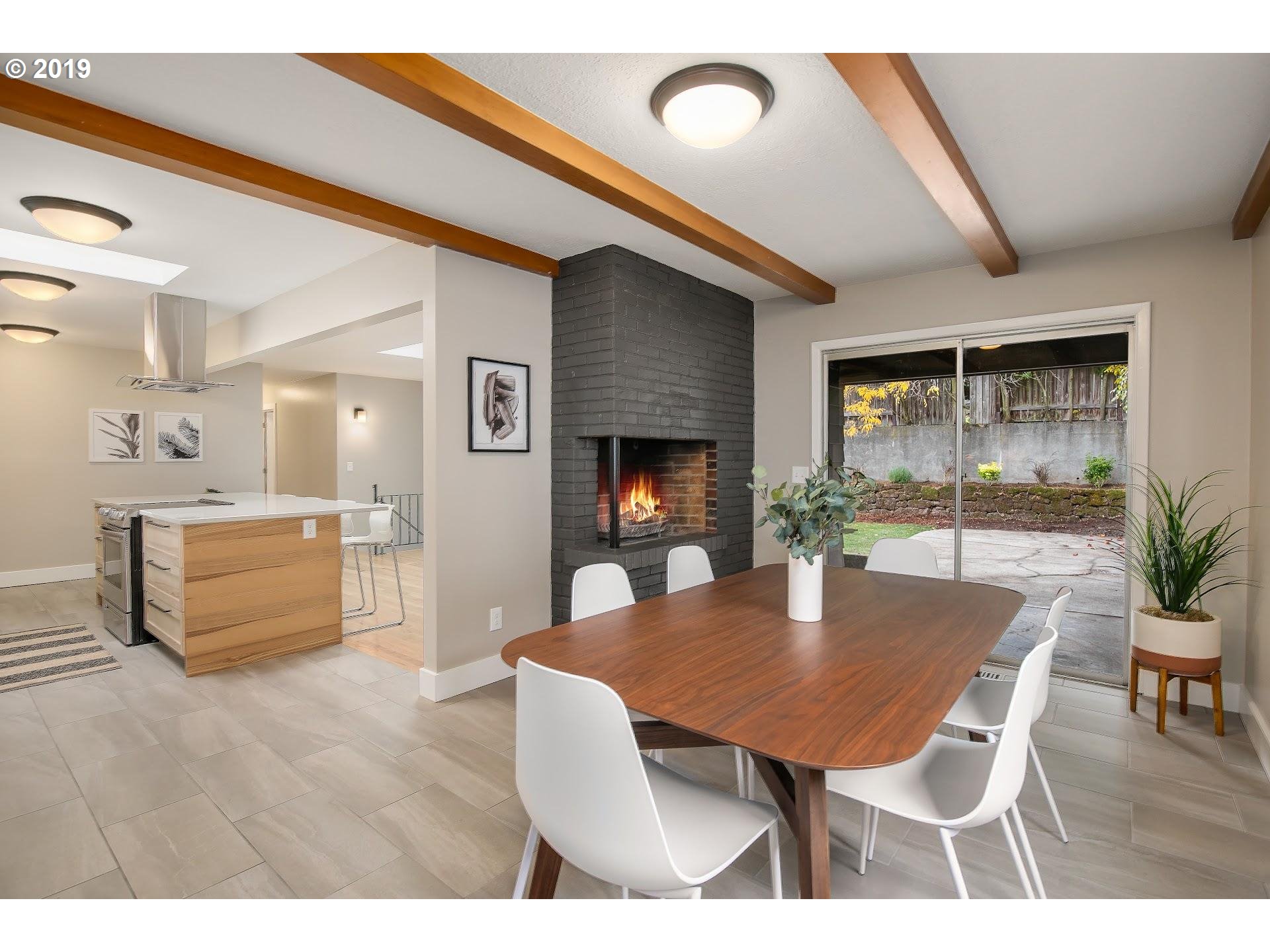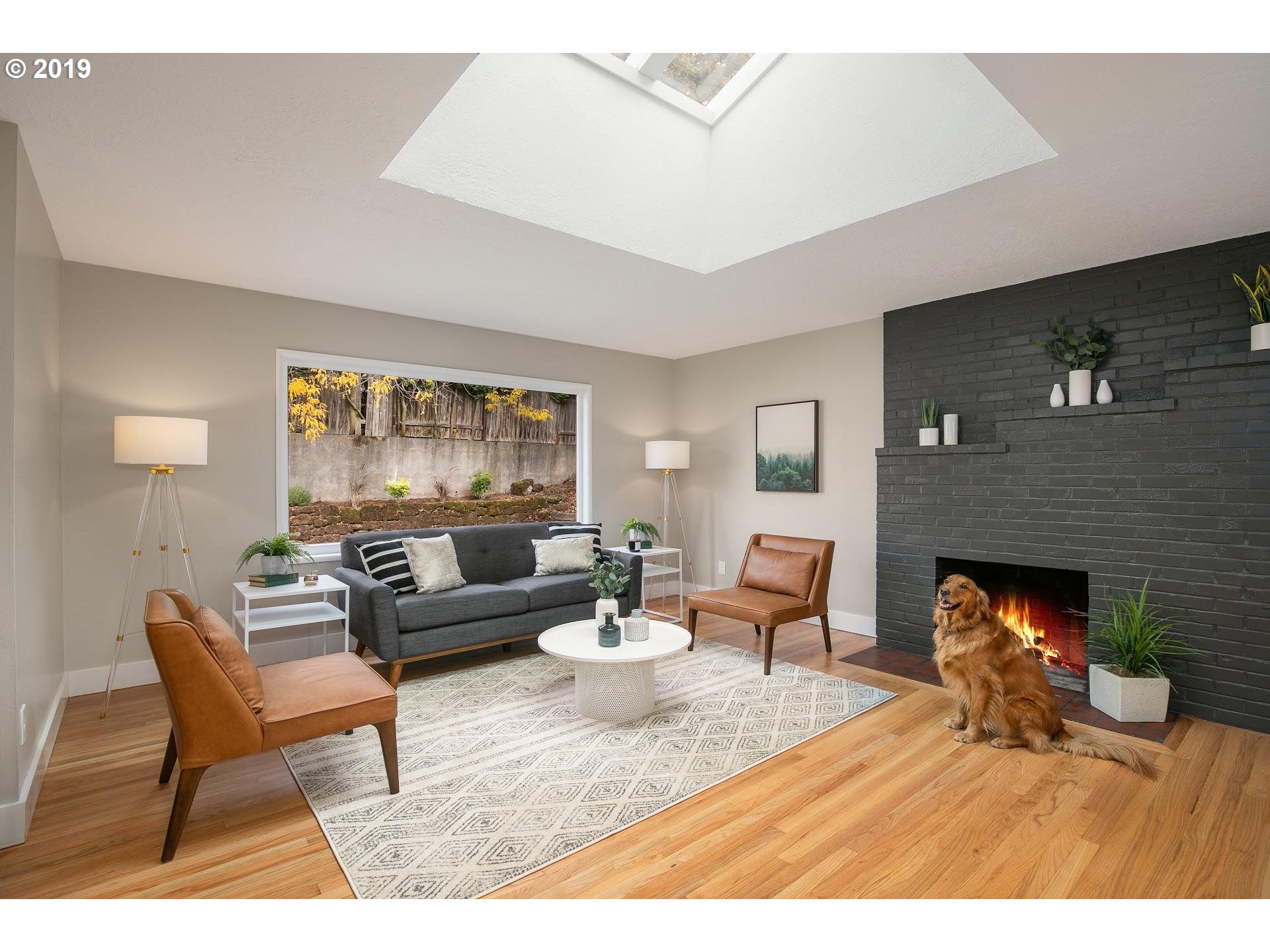 Great vibes at this spacious 1962 Mid-Century Modern ranch impeccably restored, reimagined, and modernized. The home sits back off the street on an oversized lot. Enter into the light and airy open layout kitchen / living / dining with two skylights and two fireplaces. Two bedrooms and master with en suite bath on the main. Finished lower level with separate entrance, large living room with fireplace, generous legal bedroom, full bath, and laundry. Large 2 car garage. New plumbing, electrical, furnace, water heater, and solid wood doors. New bathrooms, refinished oak hardwood floors, and new paint. Fenced backyard with lawn and covered patio.
