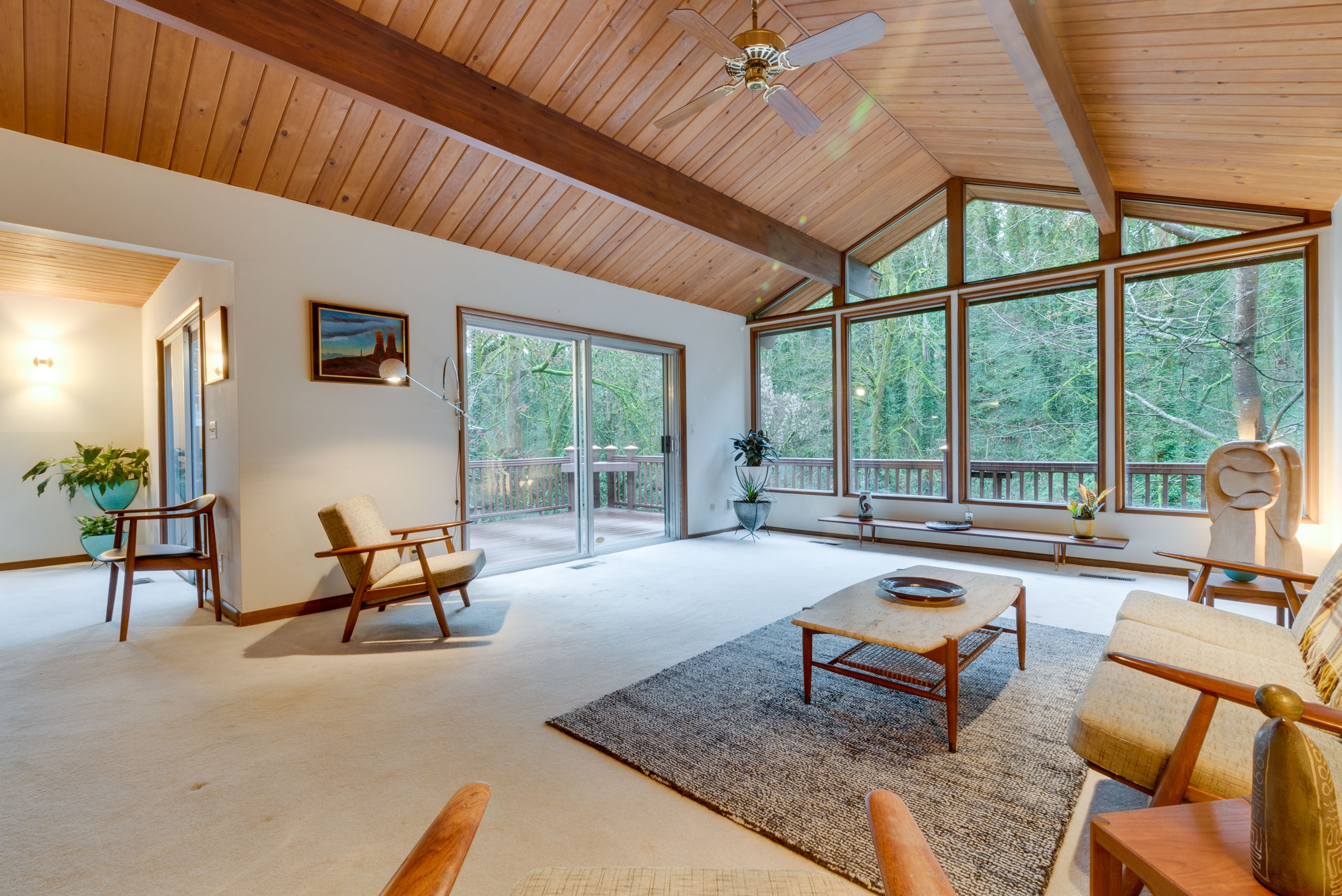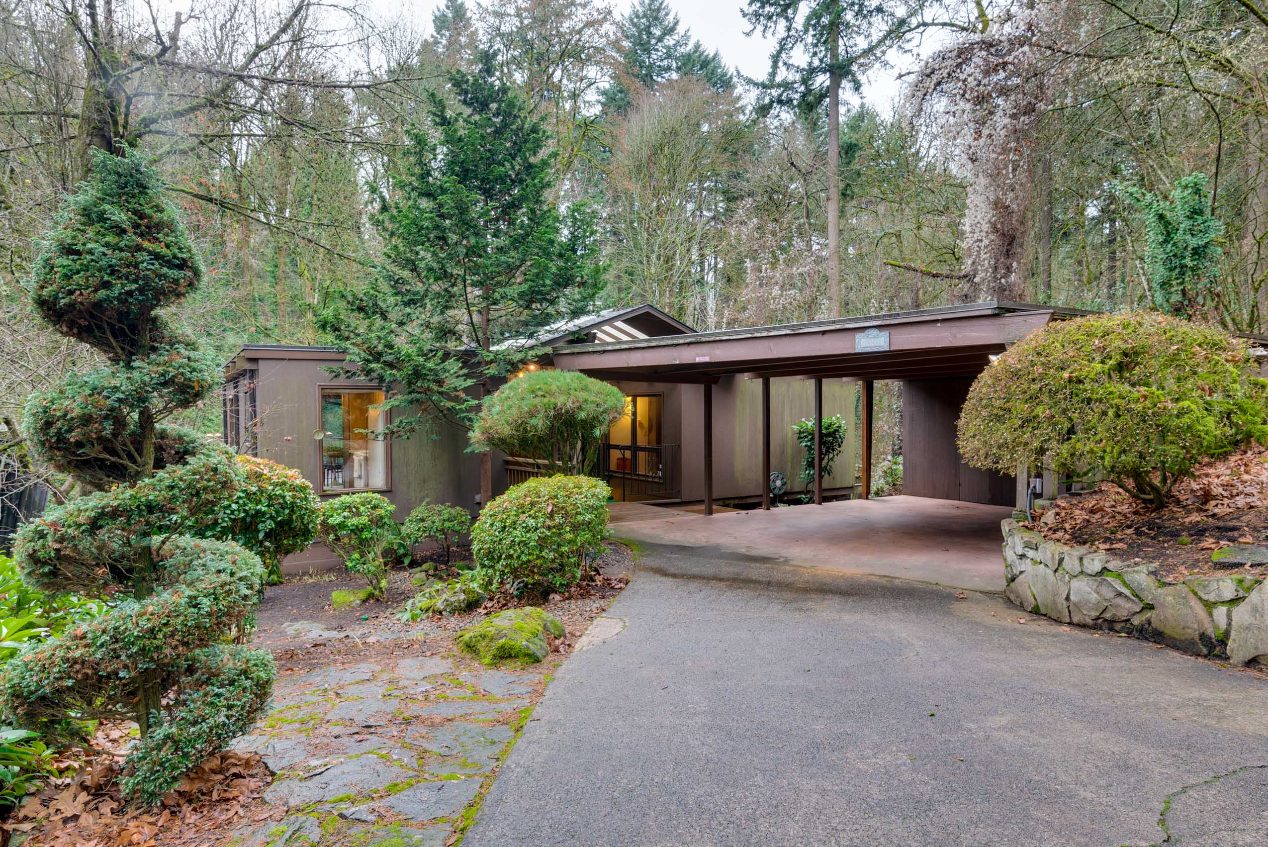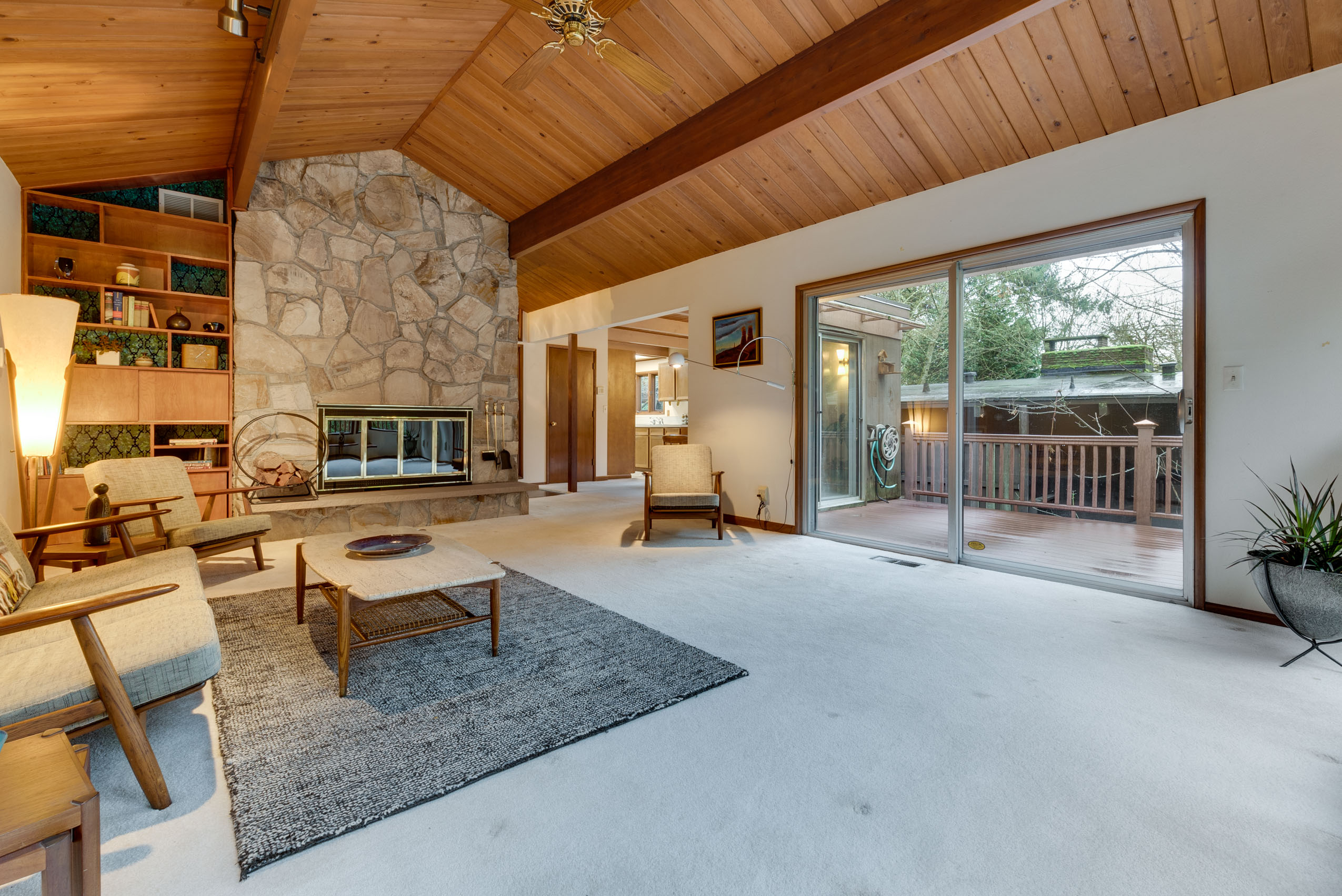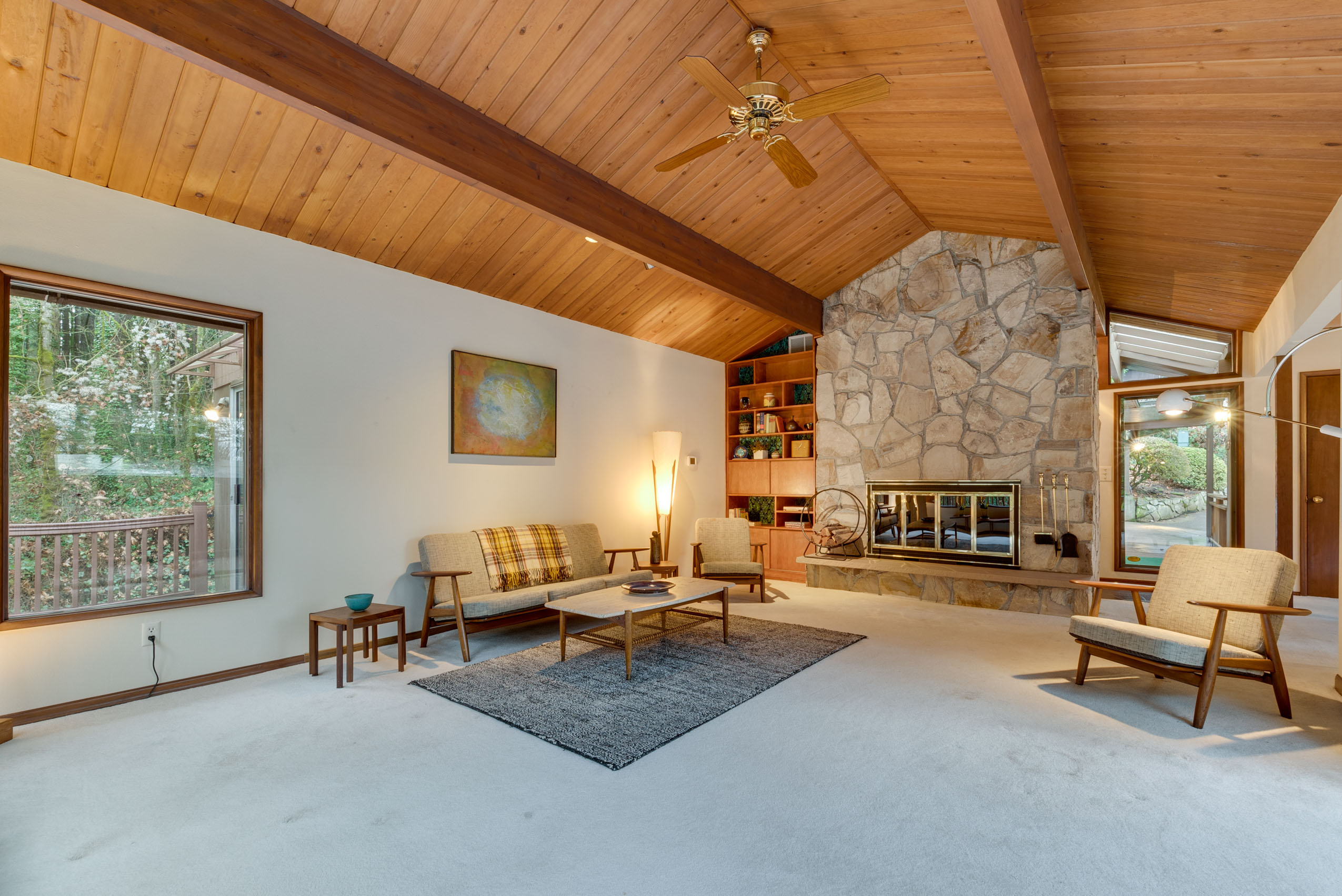 Perched on a hill above greenspace, this home is truly unlike no other. The wall of windows fills the home with natural light and makes you feel like you are living in the trees. The vaulted open beam, wood ceilings and incredible floor to ceiling rock fireplace are focal points of it’s high end mid-century modern architecture.