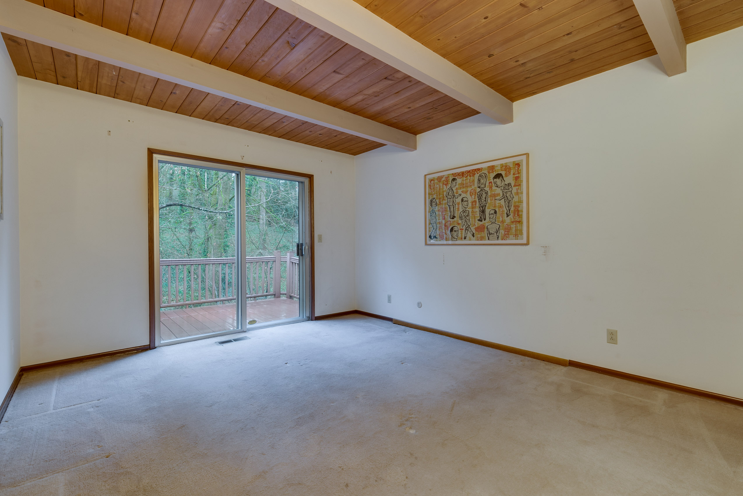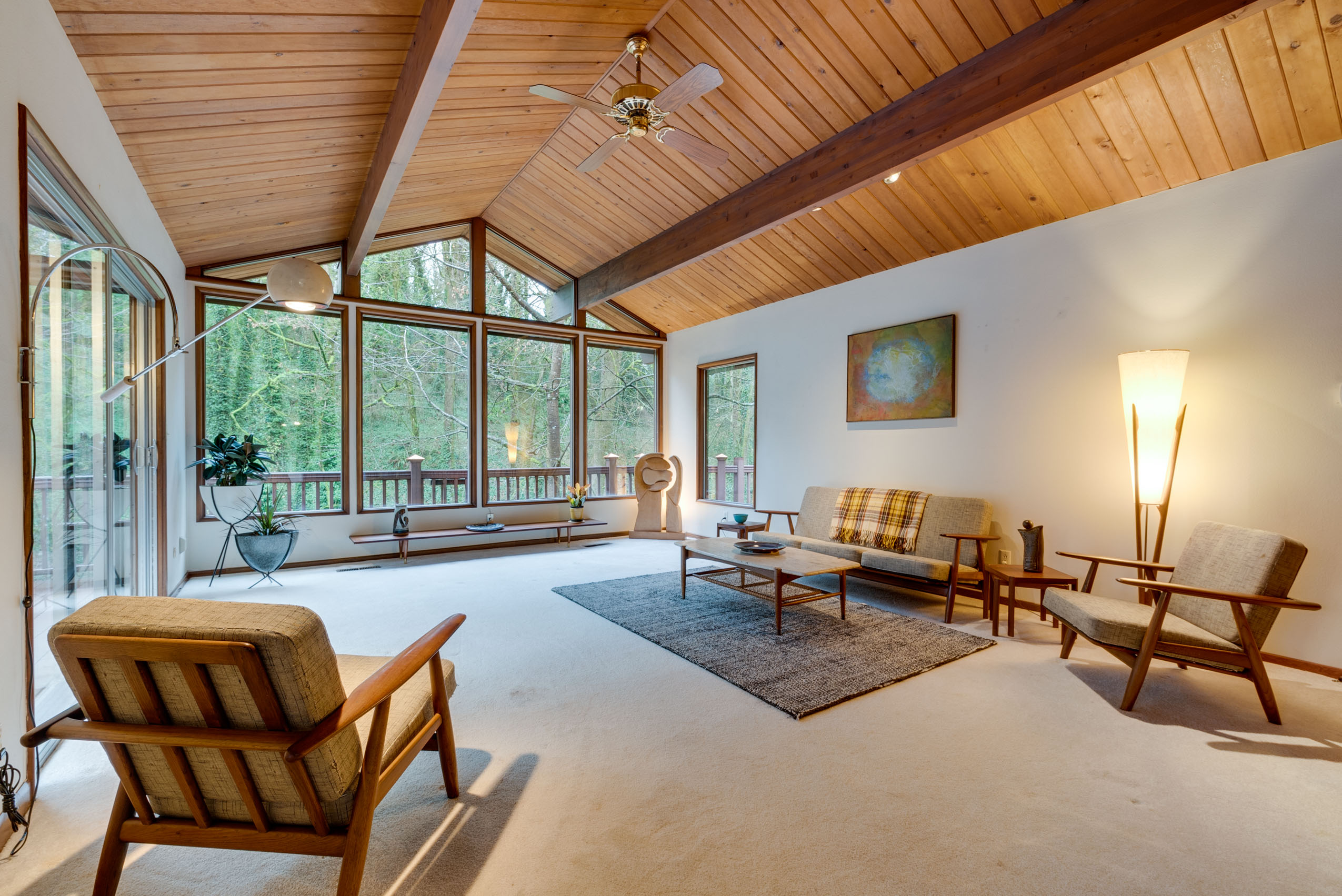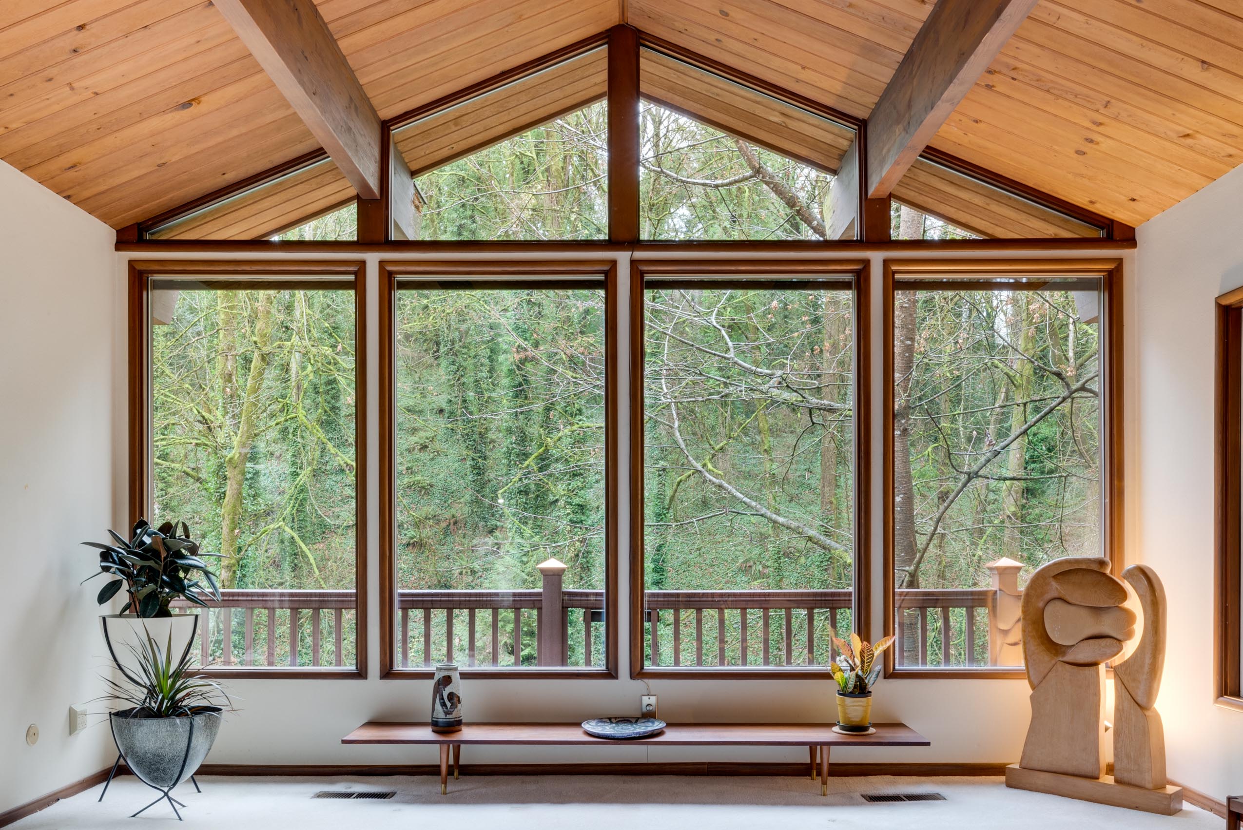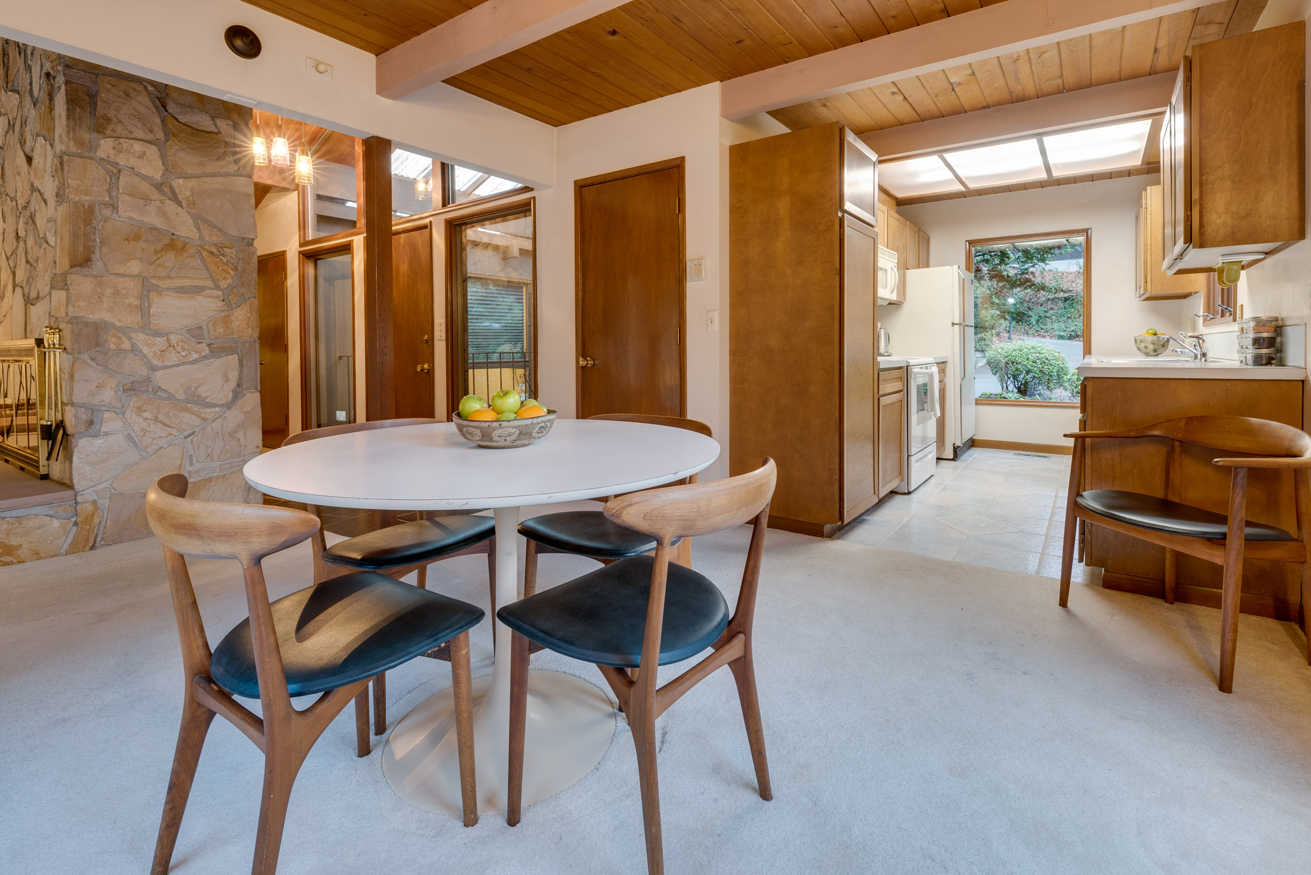 Perched on a hill above greenspace, this home is truly unlike no other. The wall of windows fills the home with natural light and makes you feel like you are living in the trees. The vaulted open beam, wood ceilings and incredible floor to ceiling rock fireplace are focal points of it’s high end mid-century modern architecture.