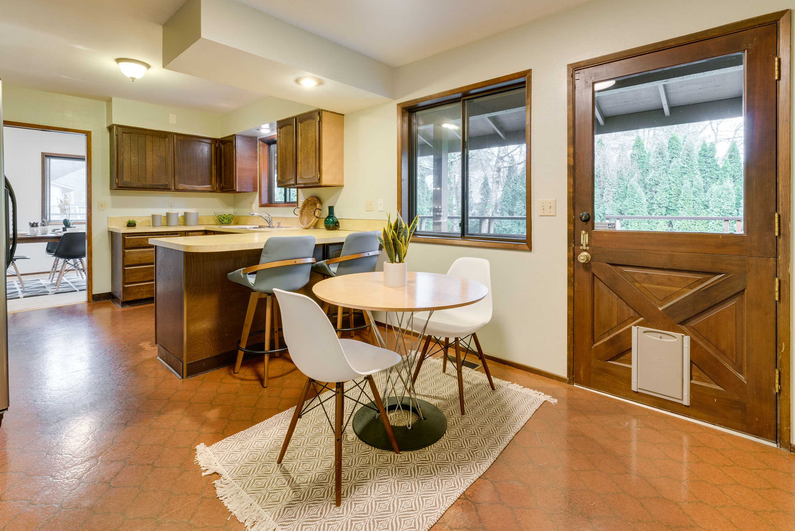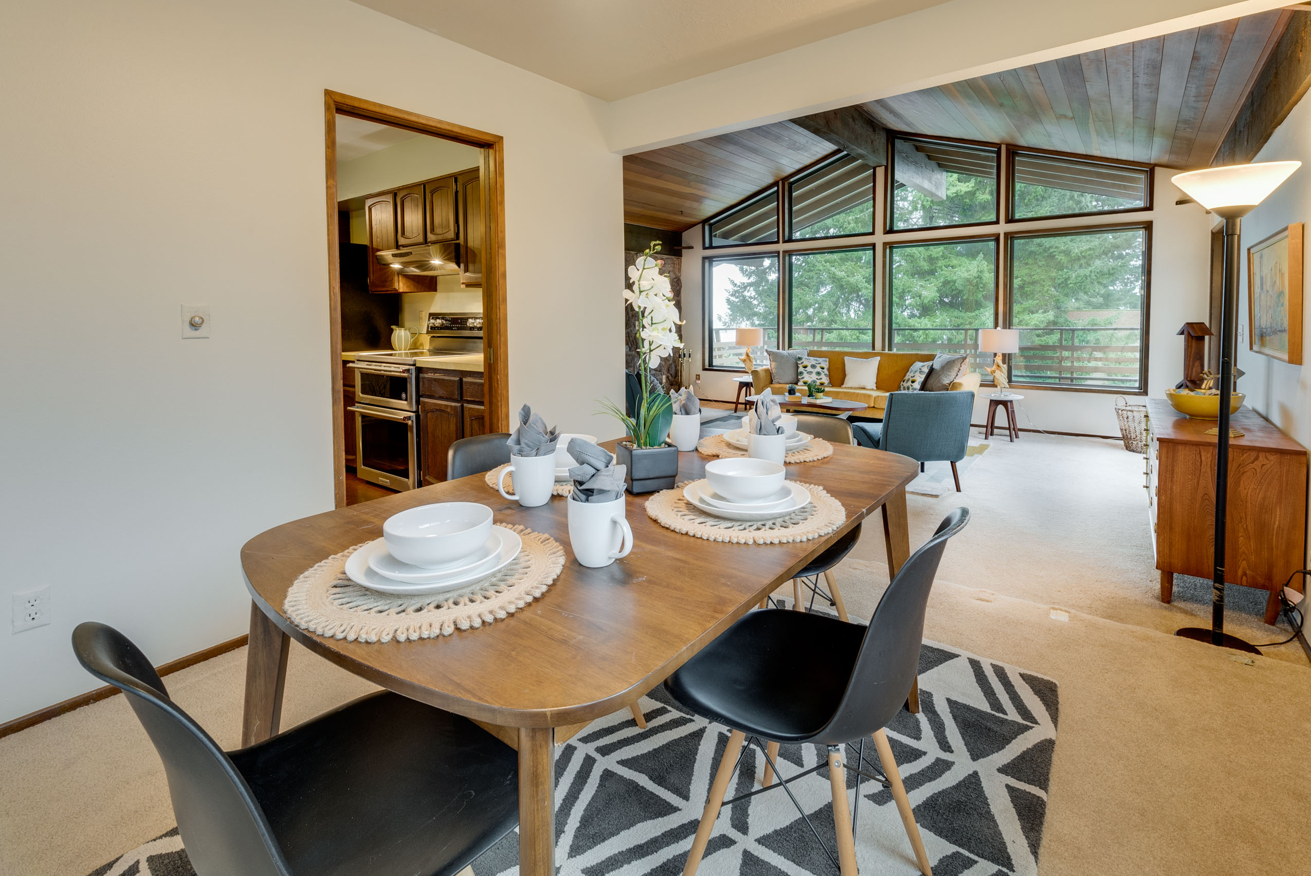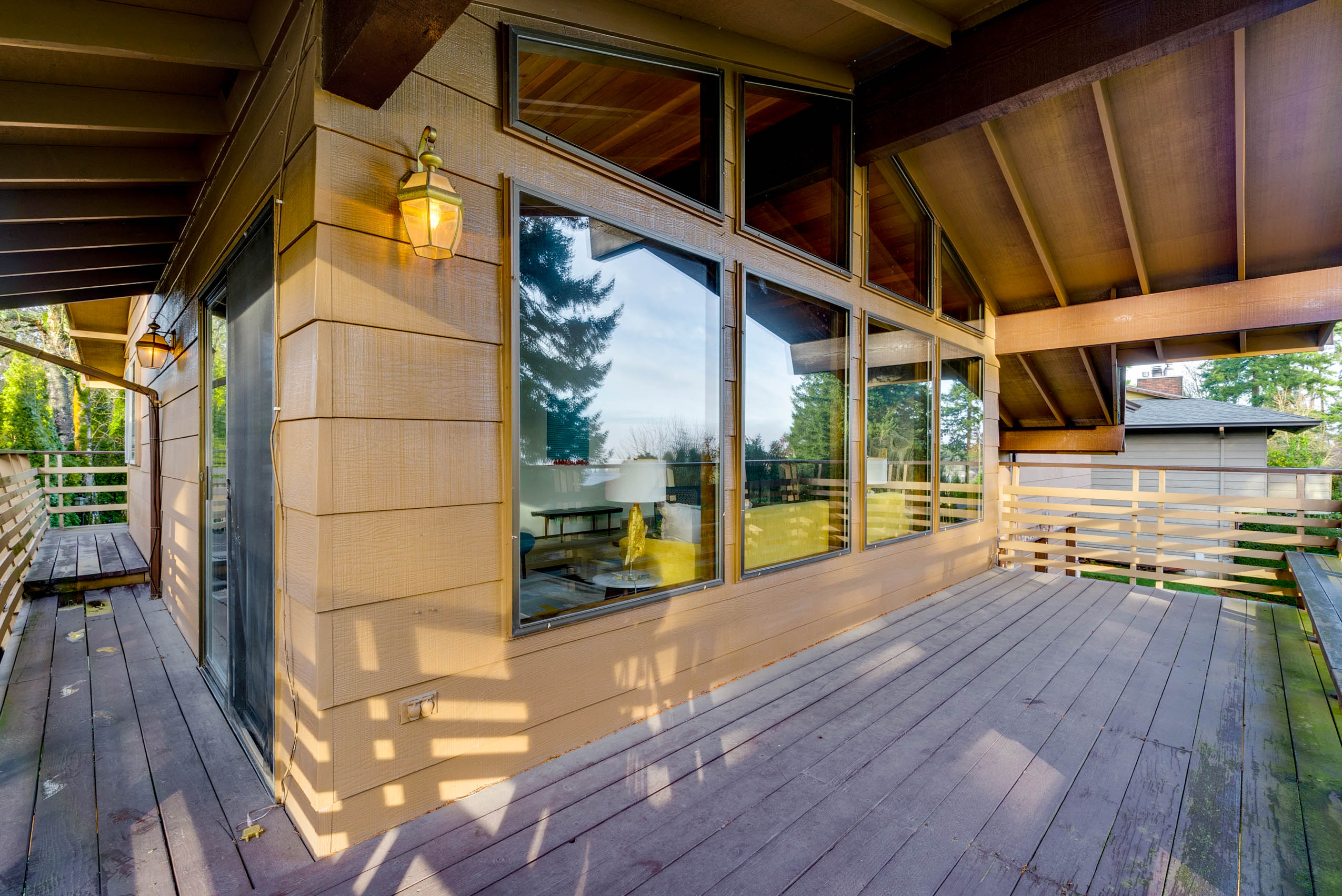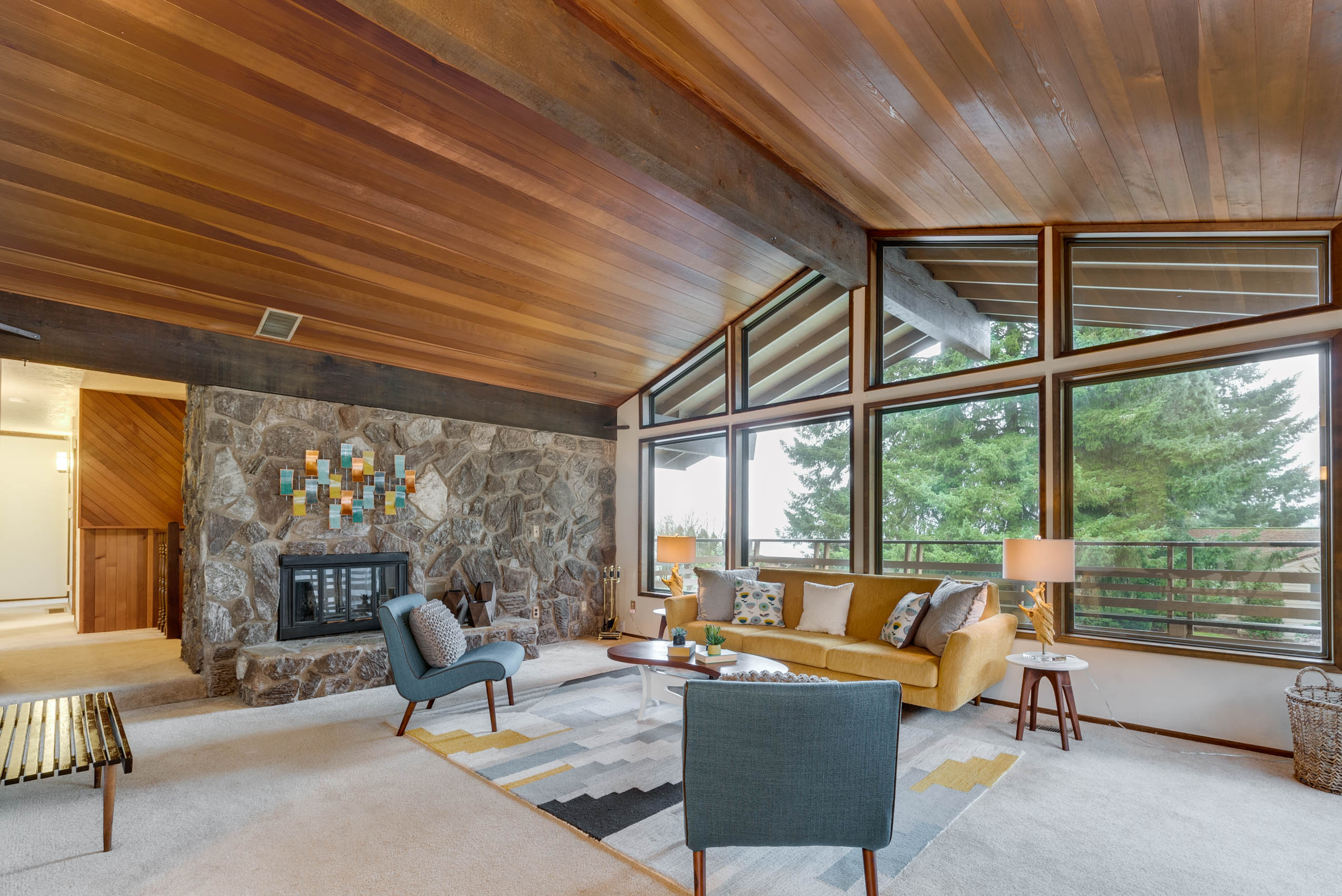 Pristine mid-century design with classic Northwest Regional style features throughout. Spacious sunken living room with a soaring vaulted wood ceiling, exposed beams and a wall of windows with Mt. Hood and territorial views. Entertain in the expansive lower level family room with a vintage Malm fireplace and bar. Enjoy the large wrap around deck with a deep gable overhang perfect for outdoor lounging year round. Large, private yard with established landscaping. Great location in a peaceful neighborhood just a few blocks from the Jackson Middle School track and fields, near the Loll Wildwood Natural Area with easy access to Capitol Highway and I-5.