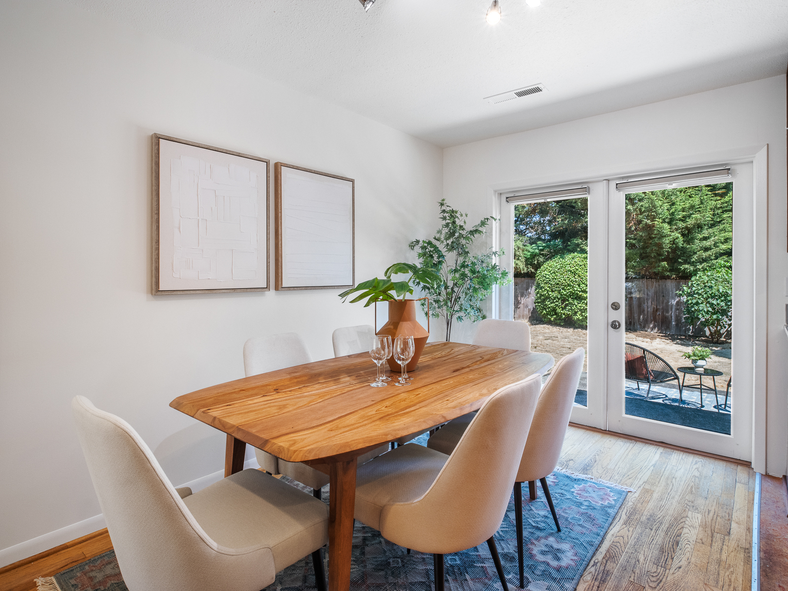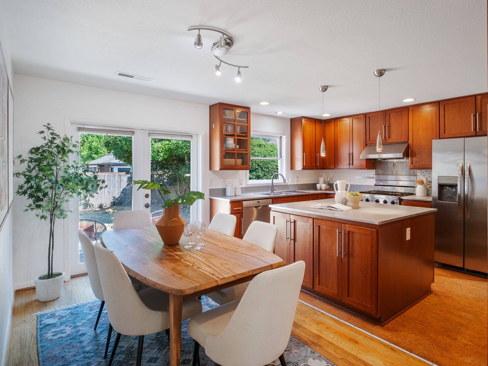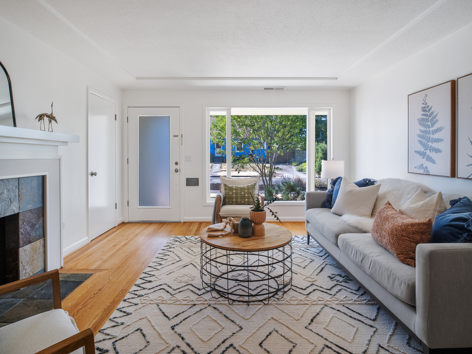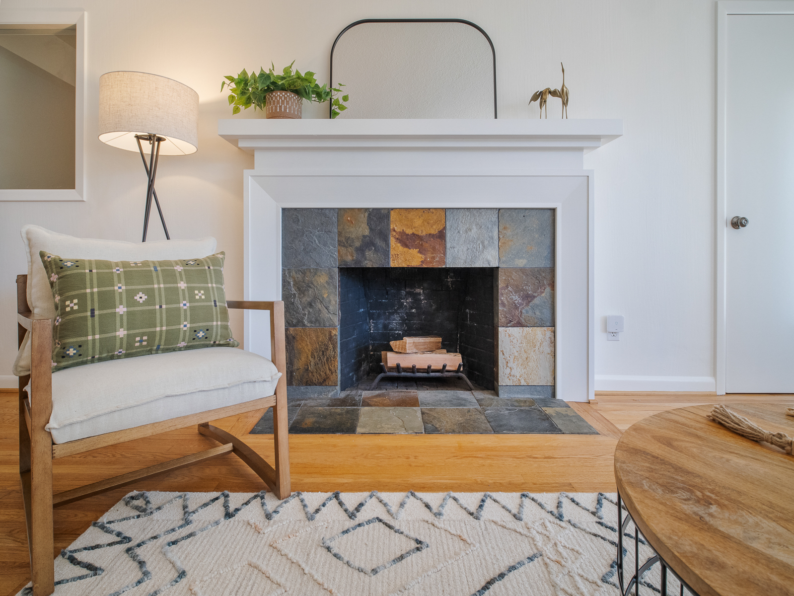 Step into this airy midcentury ranch and immediately feel at home. Original charm shines through in the tray ceilings, vintage wood floors, and cozy fireplace. Rare excellent layout that fully utilizes the square footage: the updated kitchen with Viking range is a pleasure to cook in and flows seamlessly into the dining space and fenced backyard.