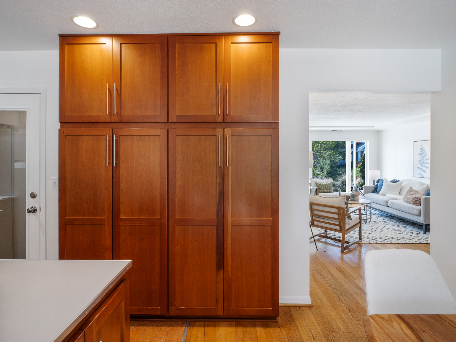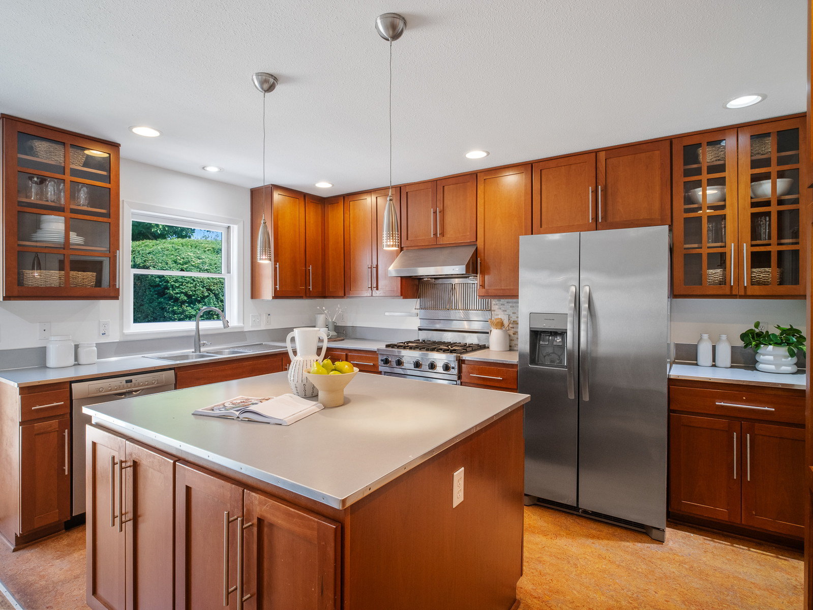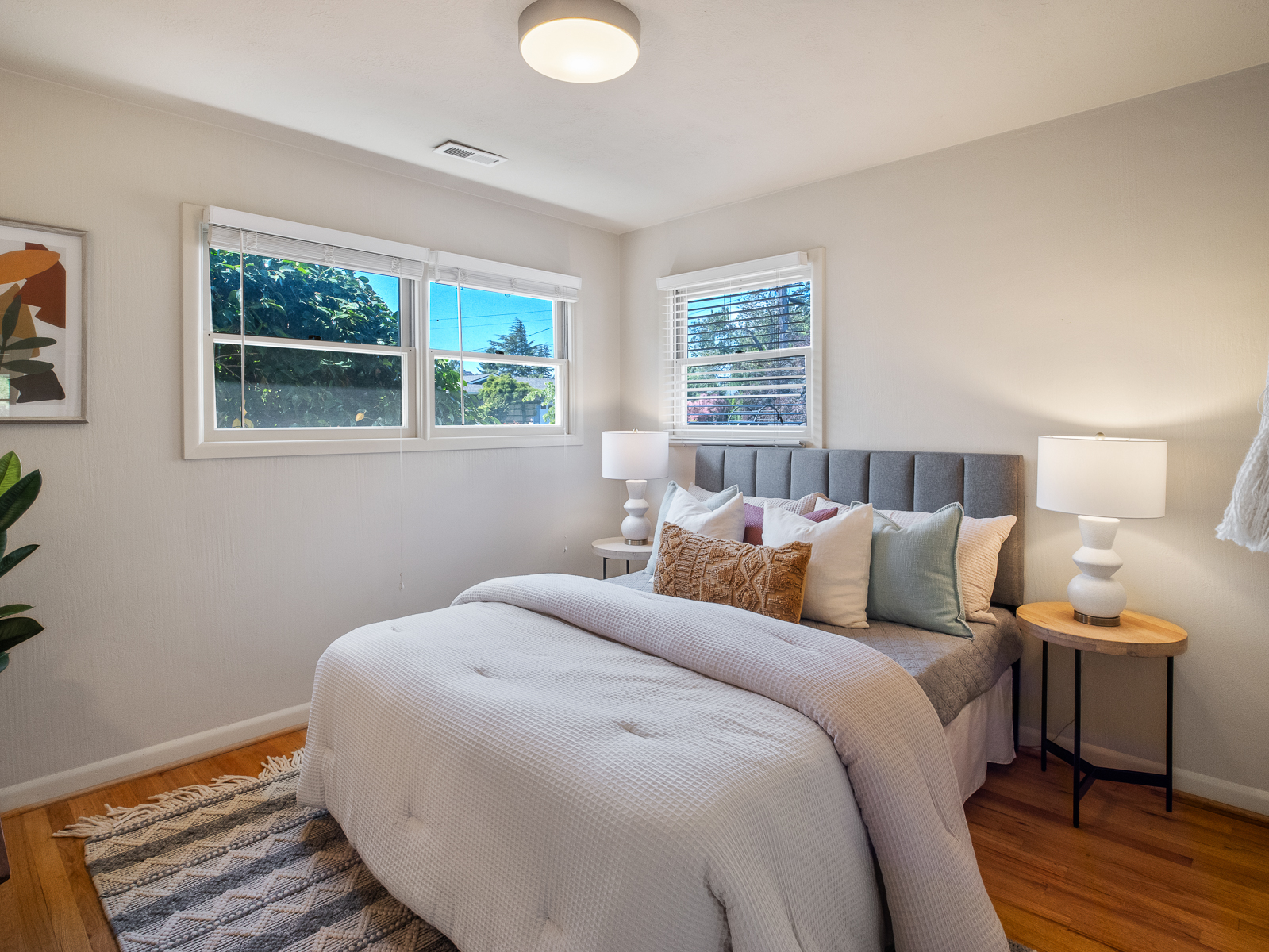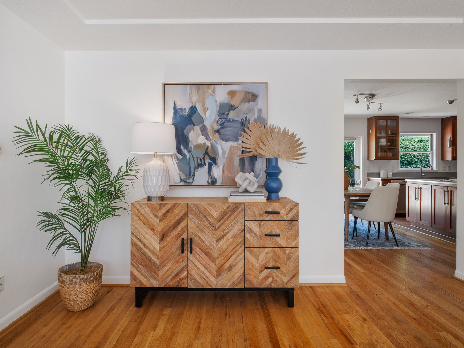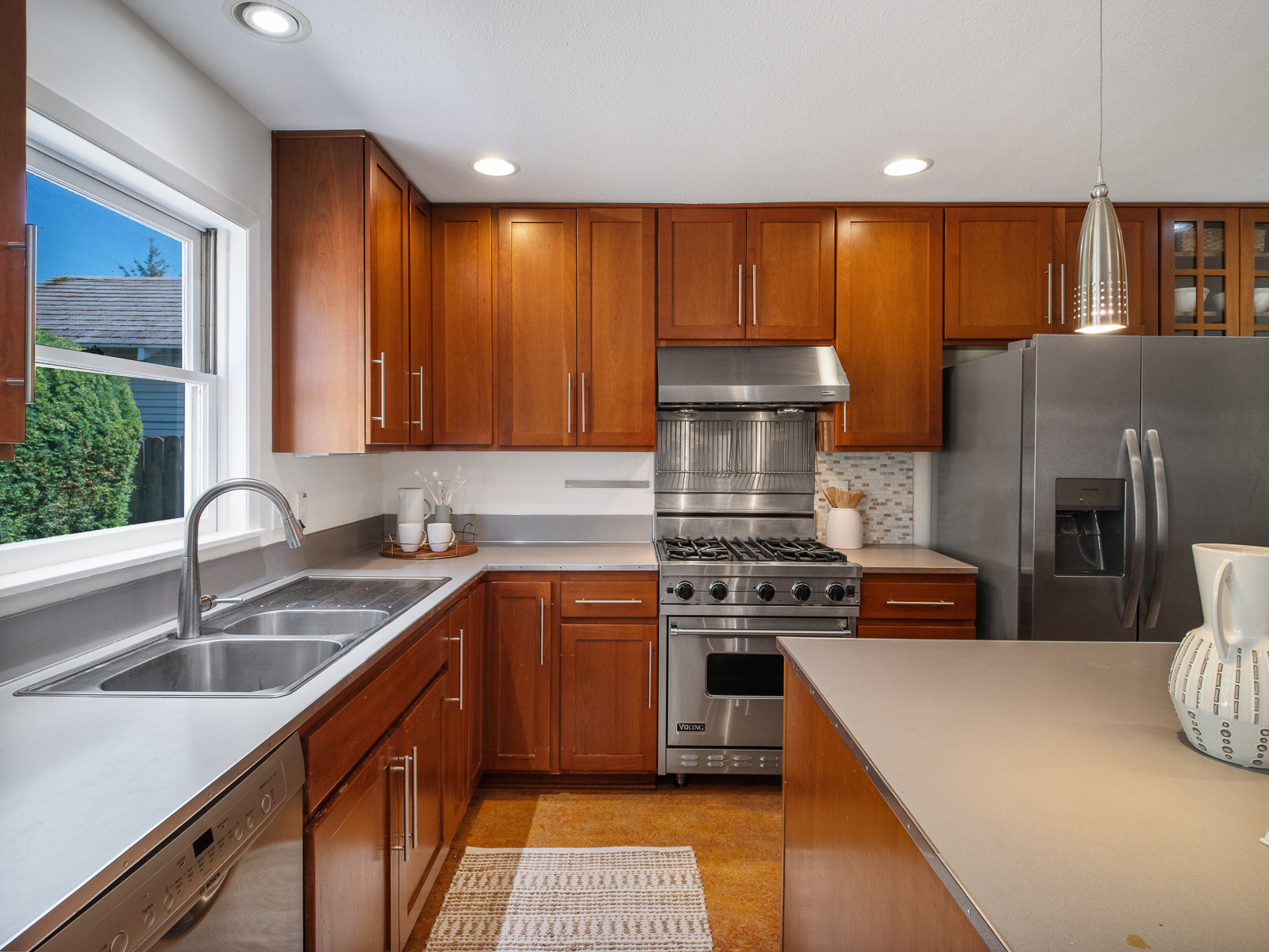 Step into this airy midcentury ranch and immediately feel at home. Original charm shines through in the tray ceilings, vintage wood floors, and cozy fireplace. Rare excellent layout that fully utilizes the square footage: the updated kitchen with Viking range is a pleasure to cook in and flows seamlessly into the dining space and fenced backyard.