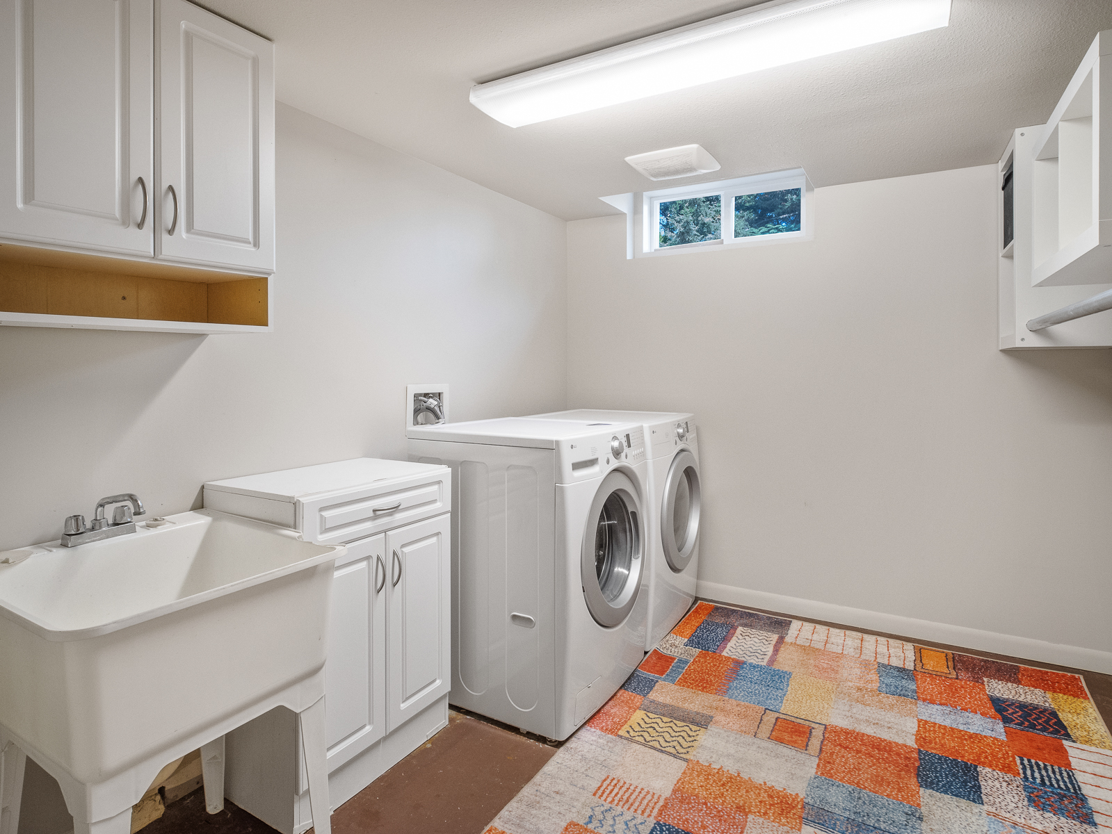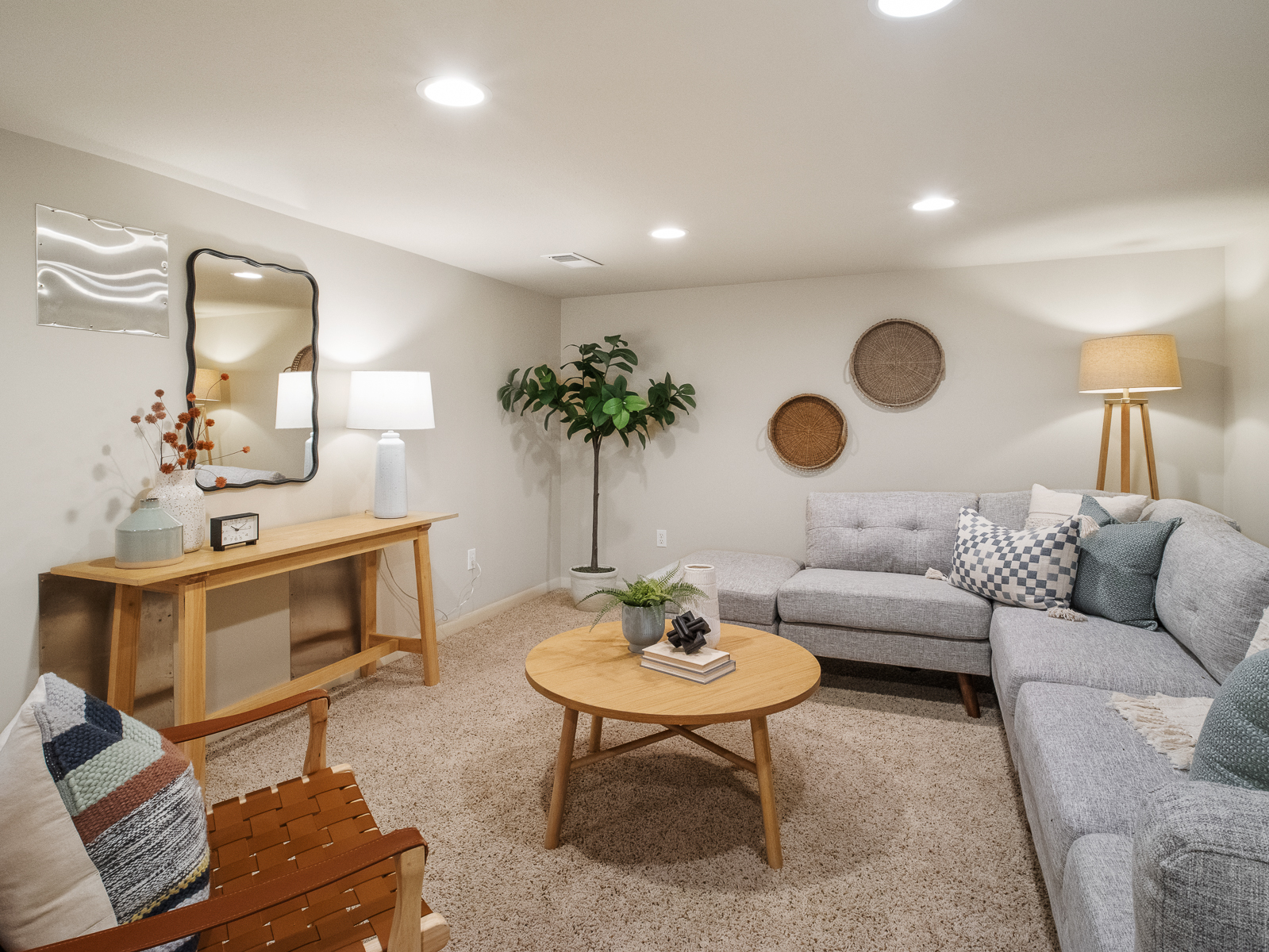 The separate bedroom wing features three bedrooms and a spacious bath. The full height finished basement offers a second living room/media space, fourth bedroom, and upgraded bath with tiled walk-in shower.