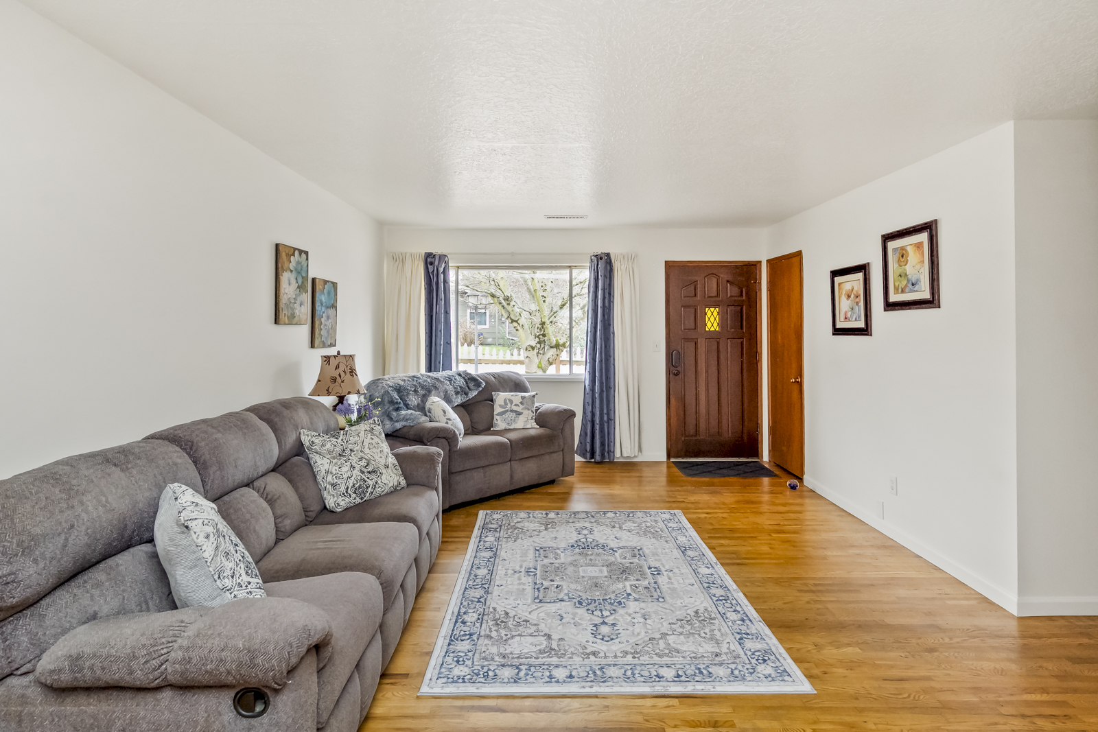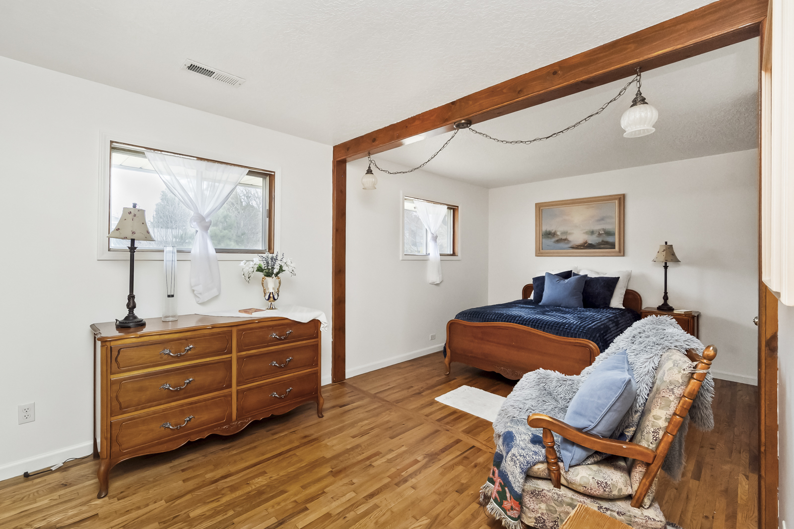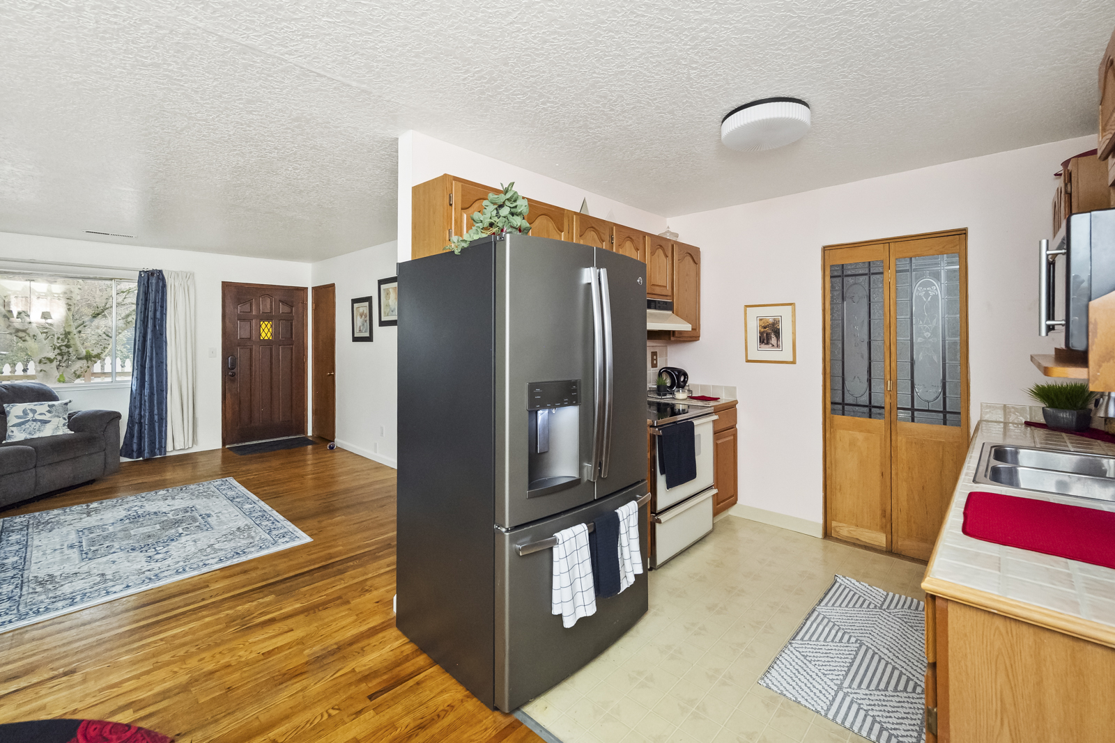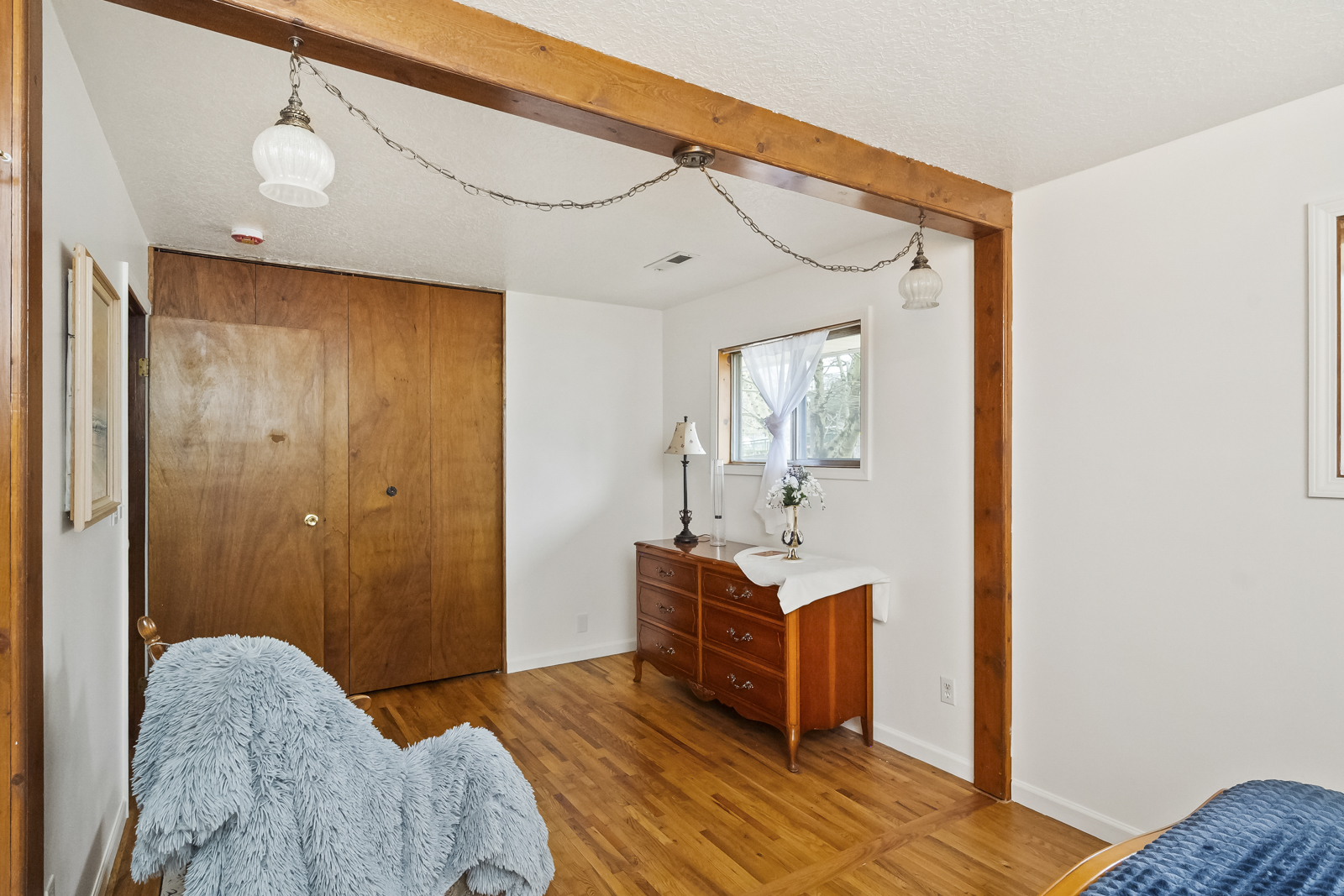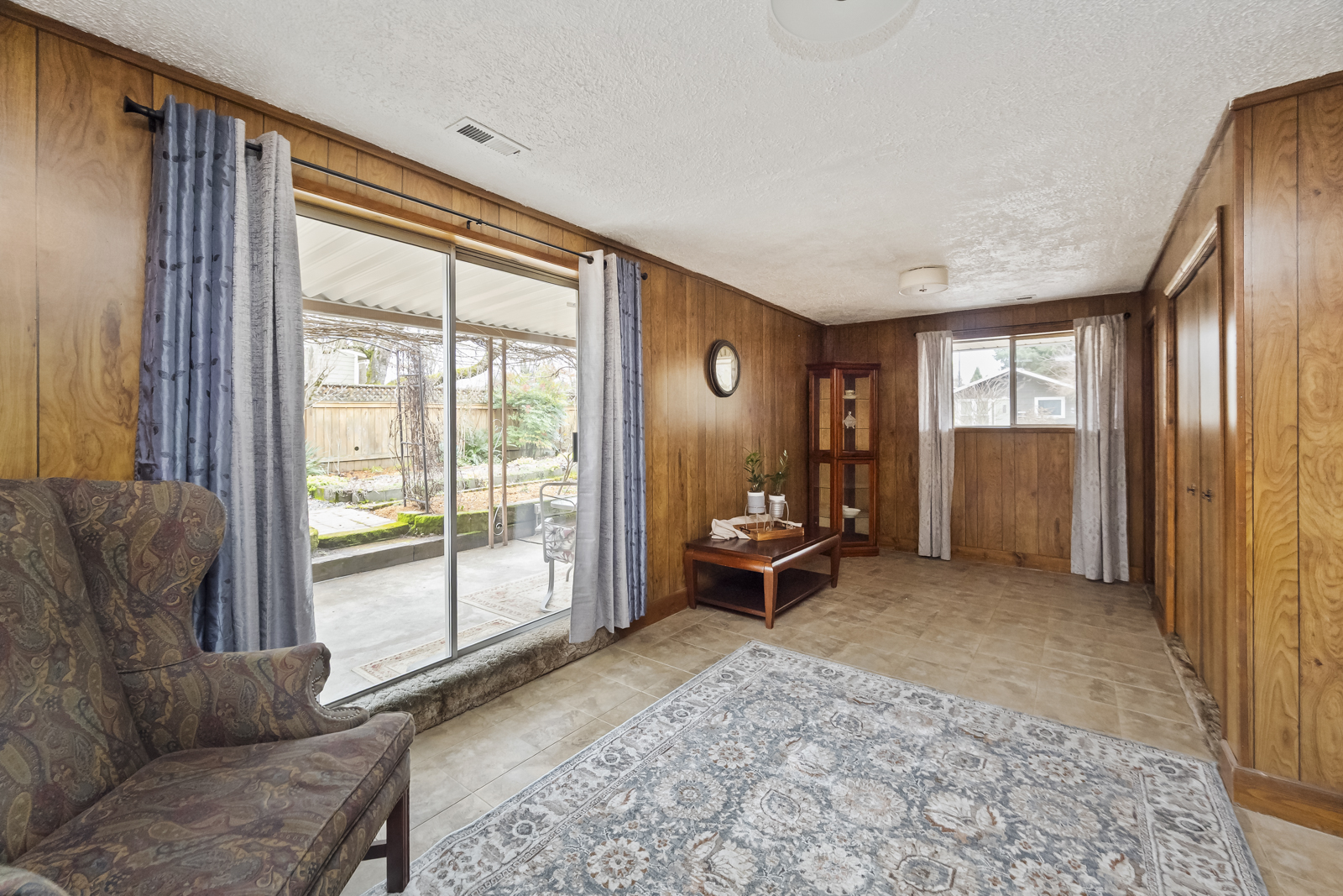 Inside, find a spacious living room with original hardwood floors and a big picture window that flows into the dining space and comfortable kitchen. The family room is an excellent place to watch movies and relax after a long day, or create your ideal game room or creative space with direct access to the garden. The full bathroom and two spacious bedrooms are in their own wing of the house- enjoy having an oversized primary bedroom, or easily convert this space back into two separate rooms to make a three bedroom home.