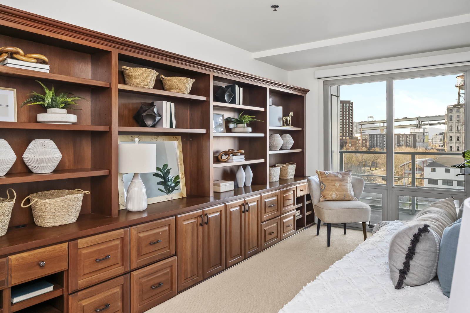 There is also an additional flex room that could be used as a home office, library, meditation space, or a perfect media room to screen your favorite movies. Every luxury is at your fingertips here: easy elevator access, in-unit laundry, two separate dedicated garage parking spaces, a private storage unit, and community amenities like a gym, sauna, BBQ area, and local waterfront walking paths are at your disposal. This prime location is walkable to countless coveted shops and restaurants, within a mile of Powells and the Slabtown New Seasons, and just over the Broadway Bridge from the Moda Center!