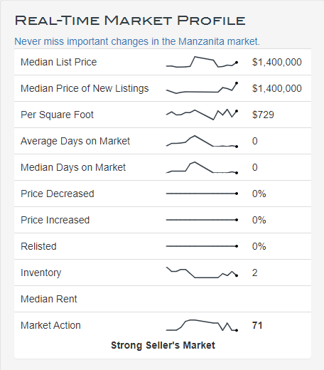 Current active inventory in Manzanita is very low. Keep this in mind when looking at this report. We’re still in the Seller’s zone, prices have not yet begun to drop. It may take a while to see slack demand for prices to reflect and begin to fall. This week the median list price for Manzanita is $1,400,000 with the market action index hovering around 71. This is about the same as last month’s market action index of 71. Inventory has increased to 2 properties.