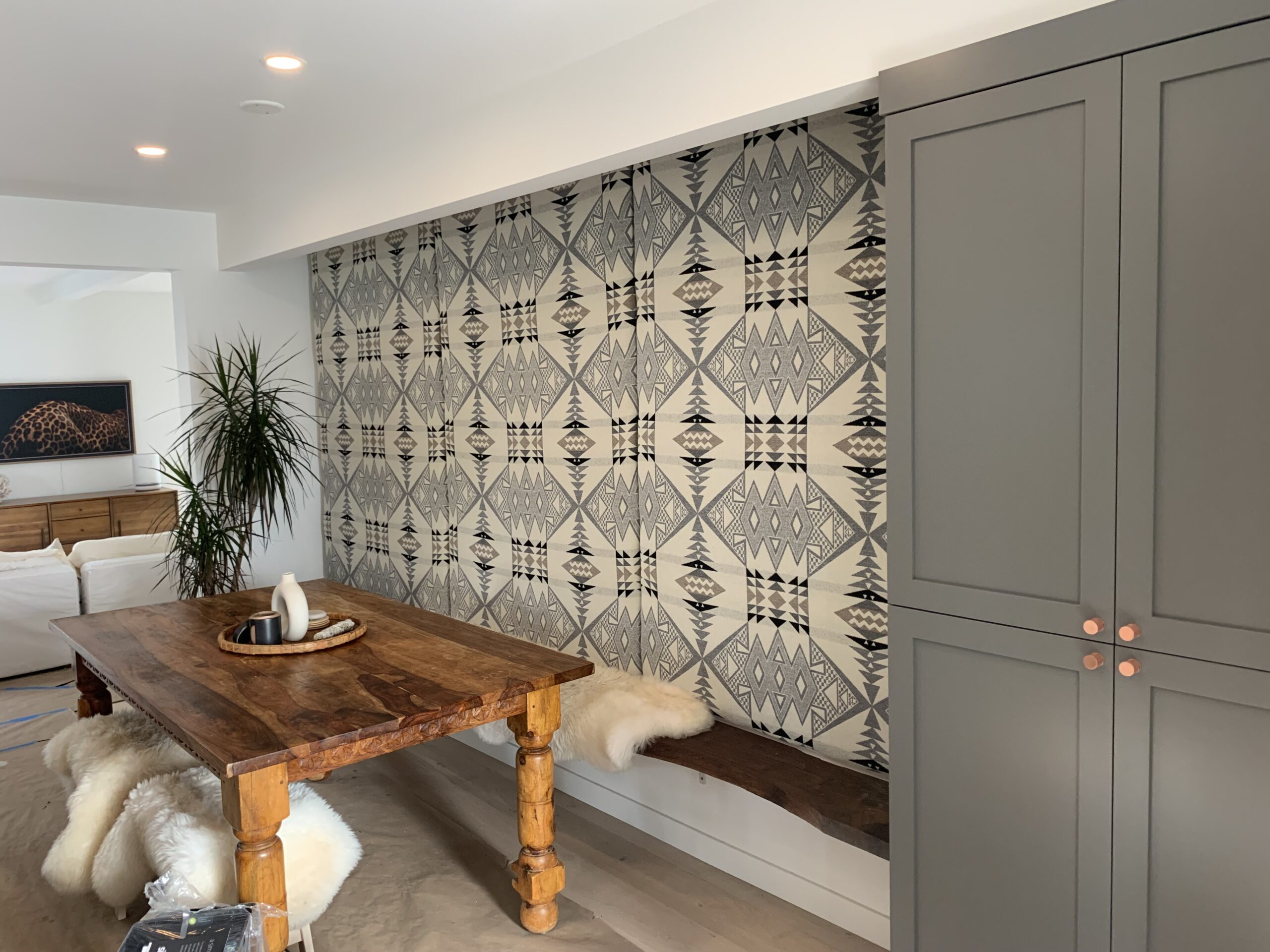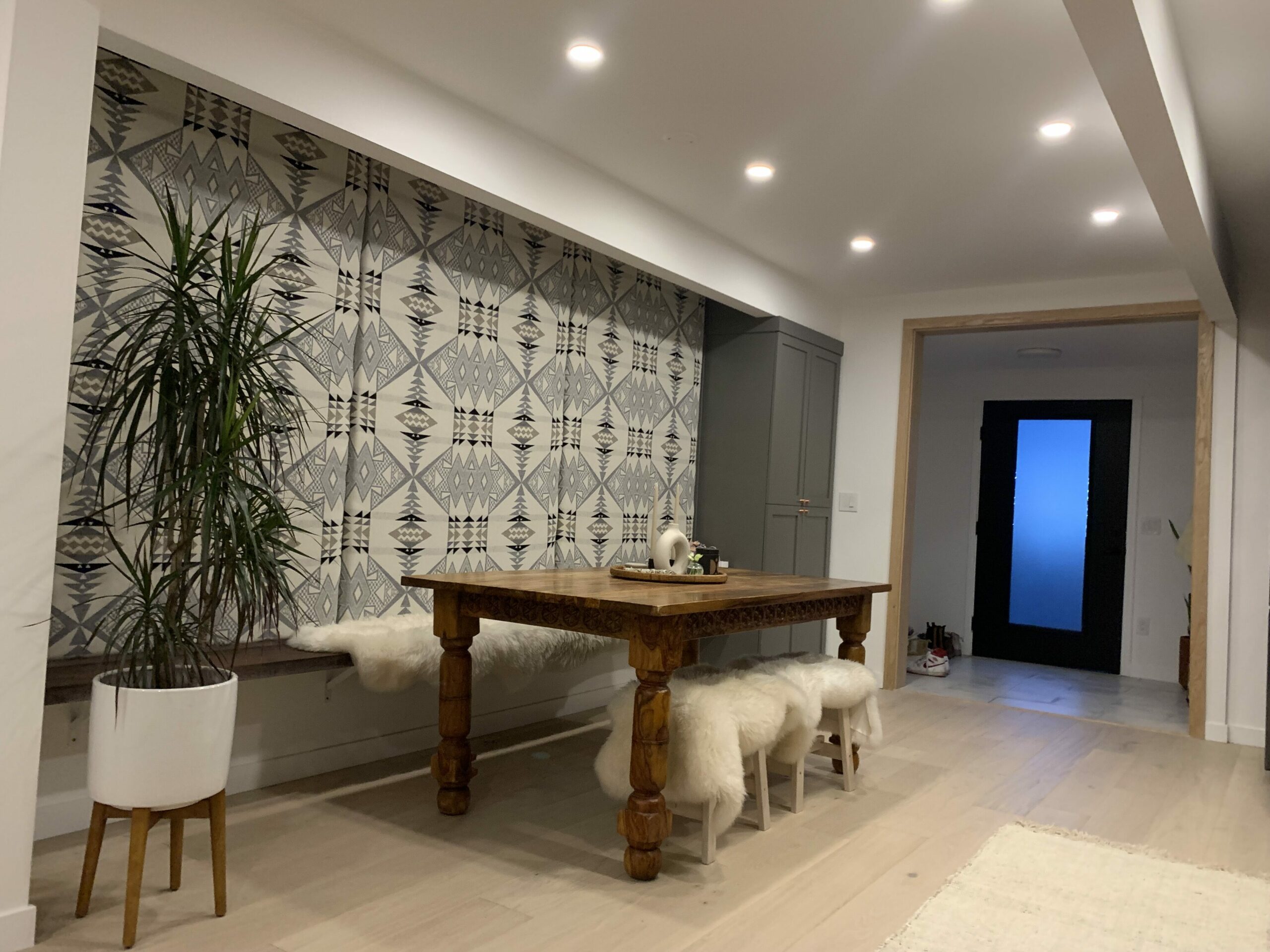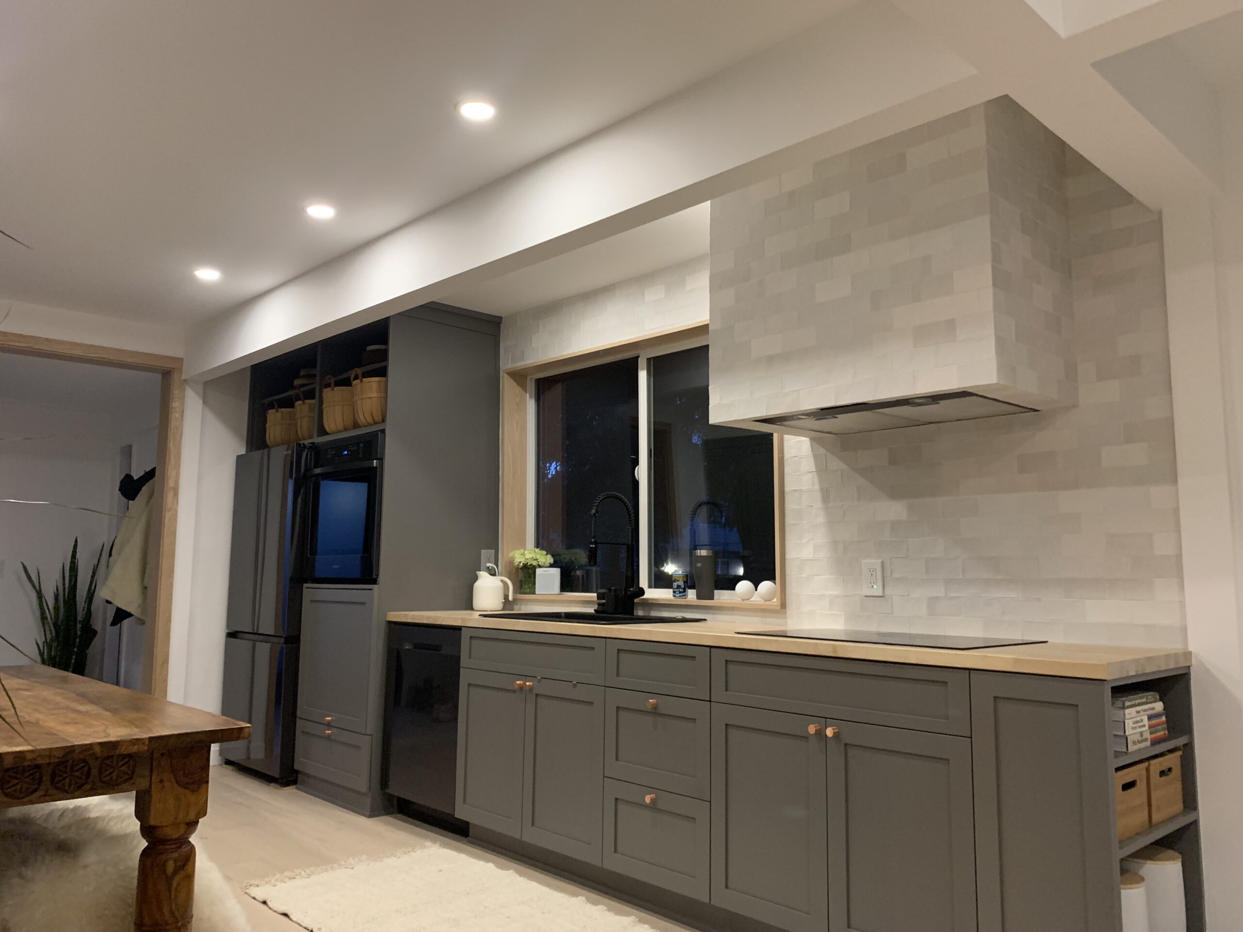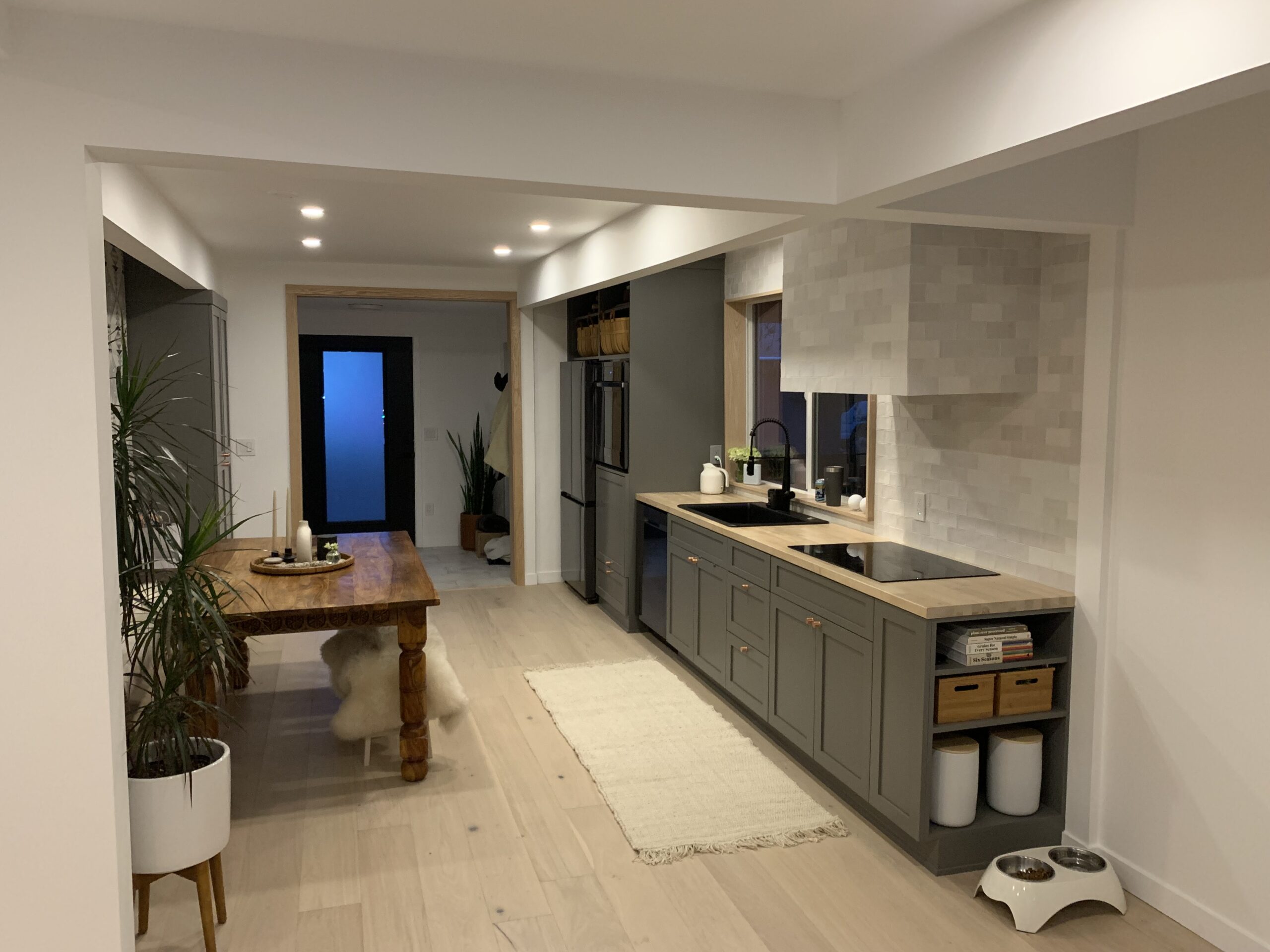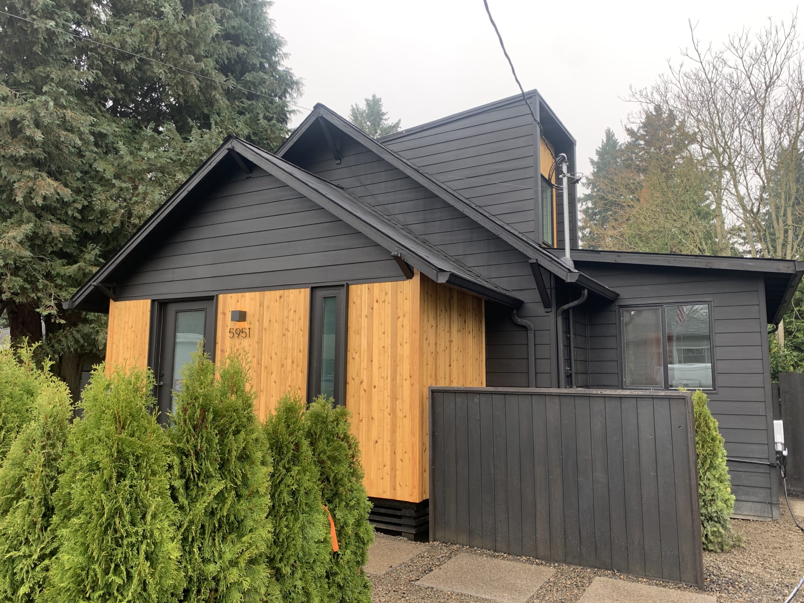 The materials were thoughtfully chosen to reflect the buyers goal to use sustainable materials and to add personal touches that are natural outgrowth of their commitment to sustainability. For example, the back deck that is built off the entire back of the home is built with Forest Stewardship Council certified juniper from local supplier, Sustainable Northwest Wood. The home is equipped with an EV charger, privacy landscaping, and an FSC certified live edge walnut bench, and a custom cabinet, and a Pendleton fabric wall to bring the kitchen area alive. Welcome home Elise and Jacy!
