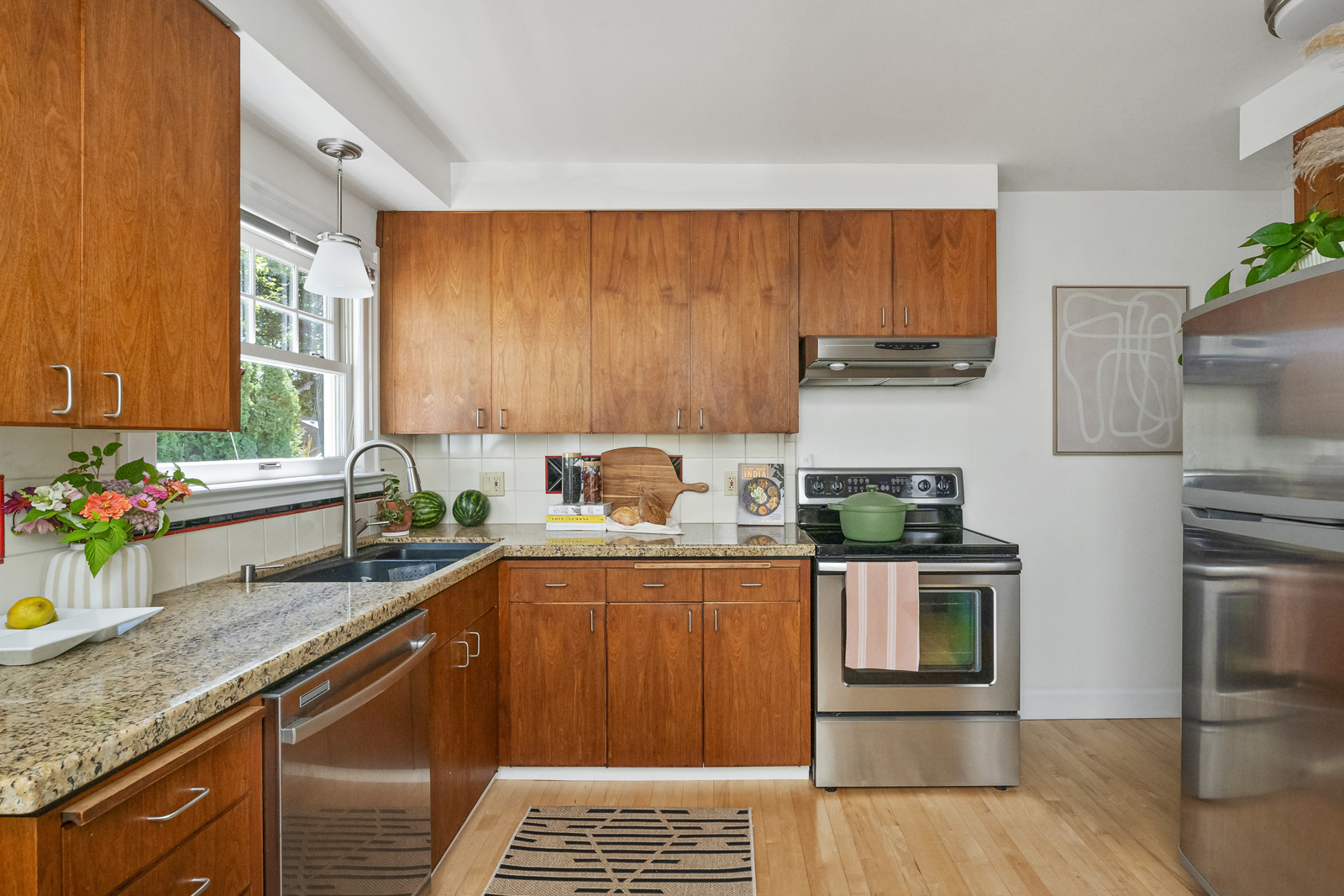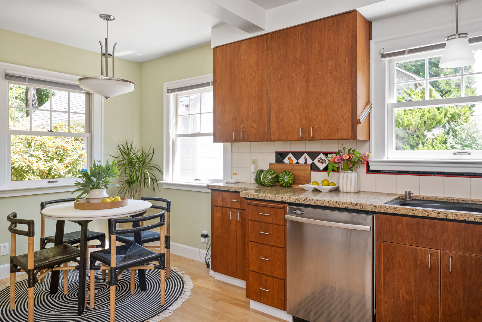 Step through the front door into a sunny living room with built-ins and a cozy newer gas fireplace that’s open to the large formal dining room. The eat-in kitchen features preserved original bookmatched walnut cabinetry with updated appliances and granite counters. Excellent layout: one bedroom and full bath on the main, with two more bedrooms and a full bath upstairs. Partially finished basement could be a gym space or media room with plenty of additional storage.