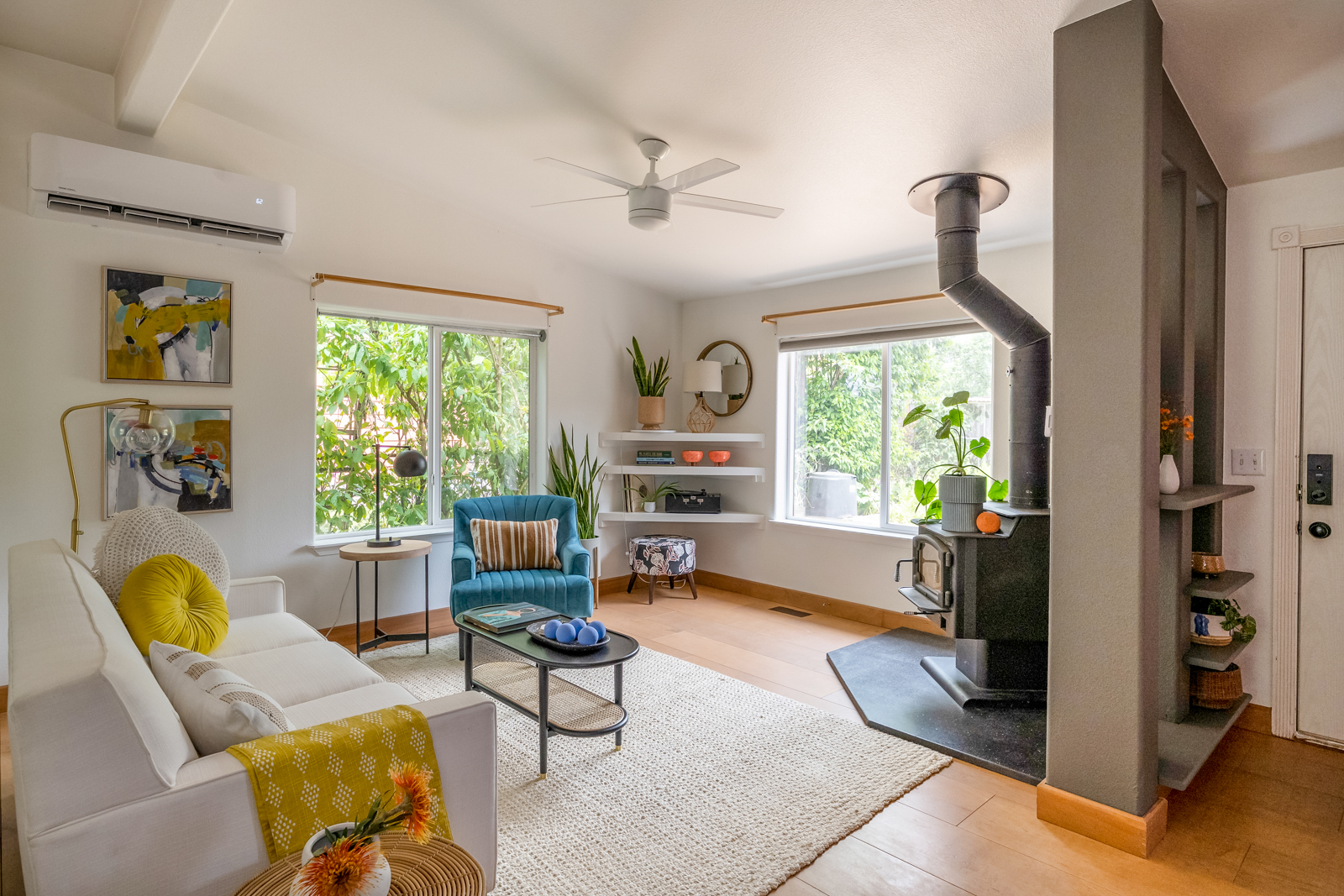 Ample bonus room features a certified wood stove for cozy winter nights as well as a brand new mini split to cool you down on warm summer days. Generous primary suite boasts a full bath and double closets. The two additional bedrooms have custom white oak built-in storage and high ceilings.