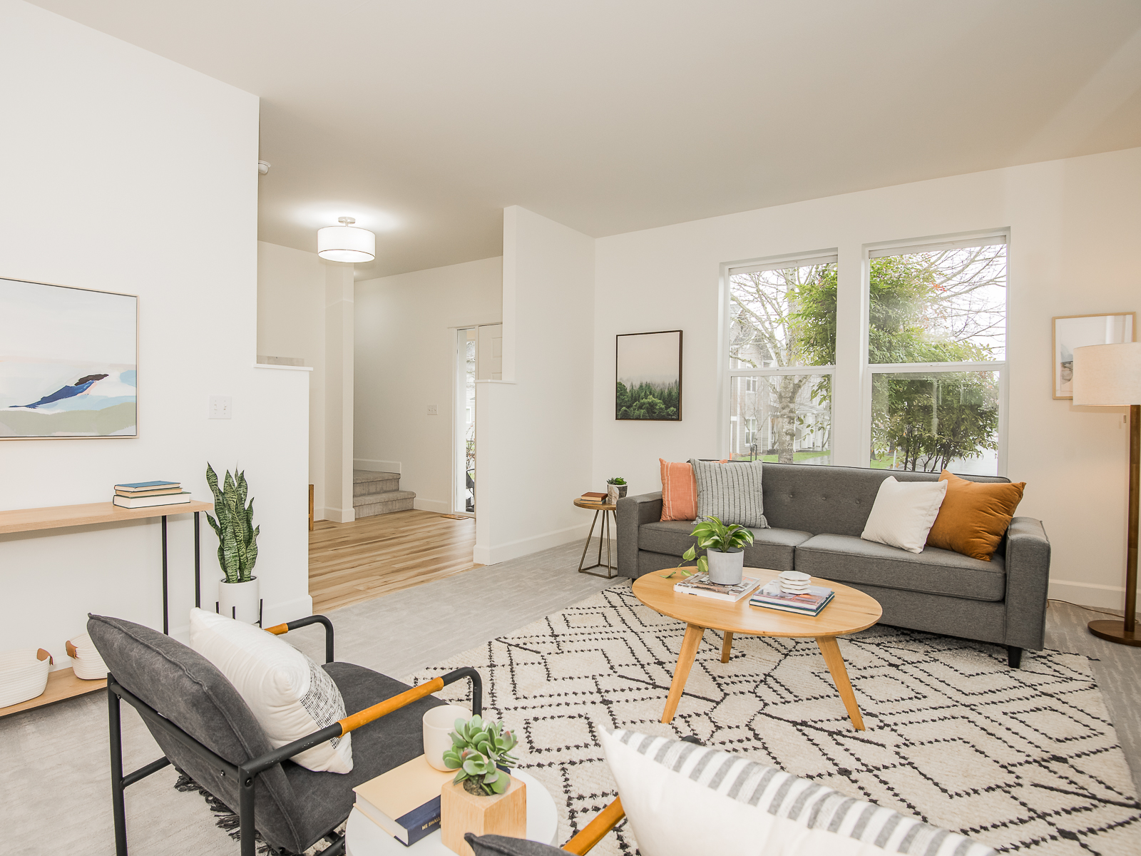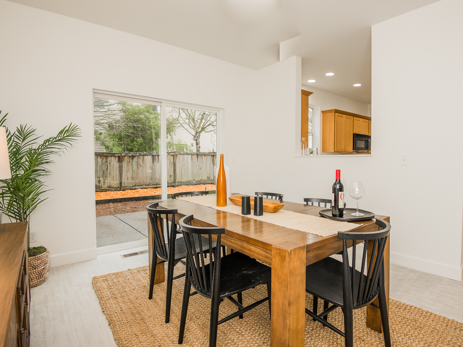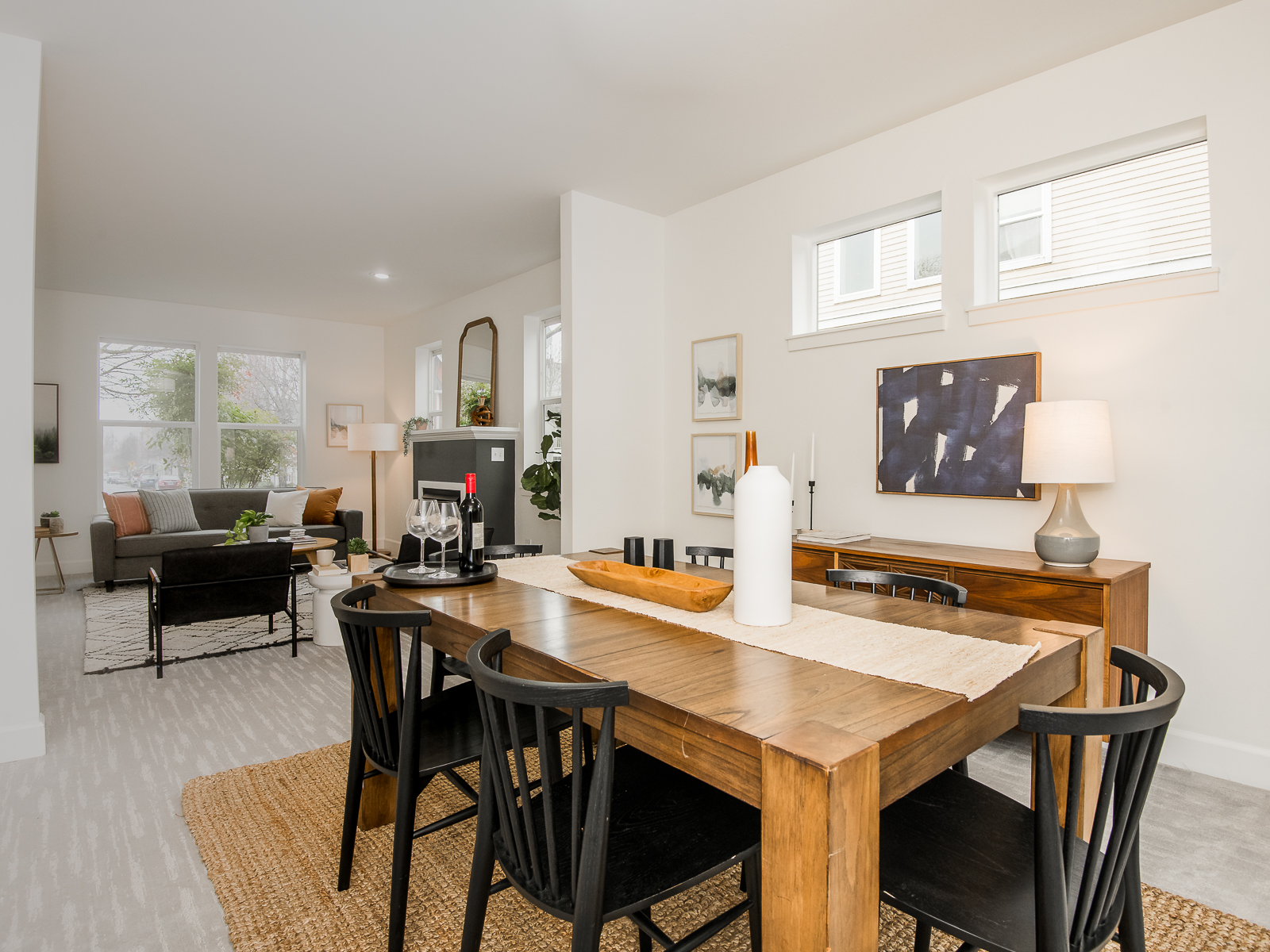 The house greets you with a generous foyer that leads into the open-concept living room and dining room spaces. The high ceilings and fresh color palette create spaces that are airy, bright and inviting. There is plenty of room to entertain, and the gas fireplace offers an easy way to get cozy. The sliding doors from the dining room offer quick access to the south-facing backyard and patio during the warmer months.